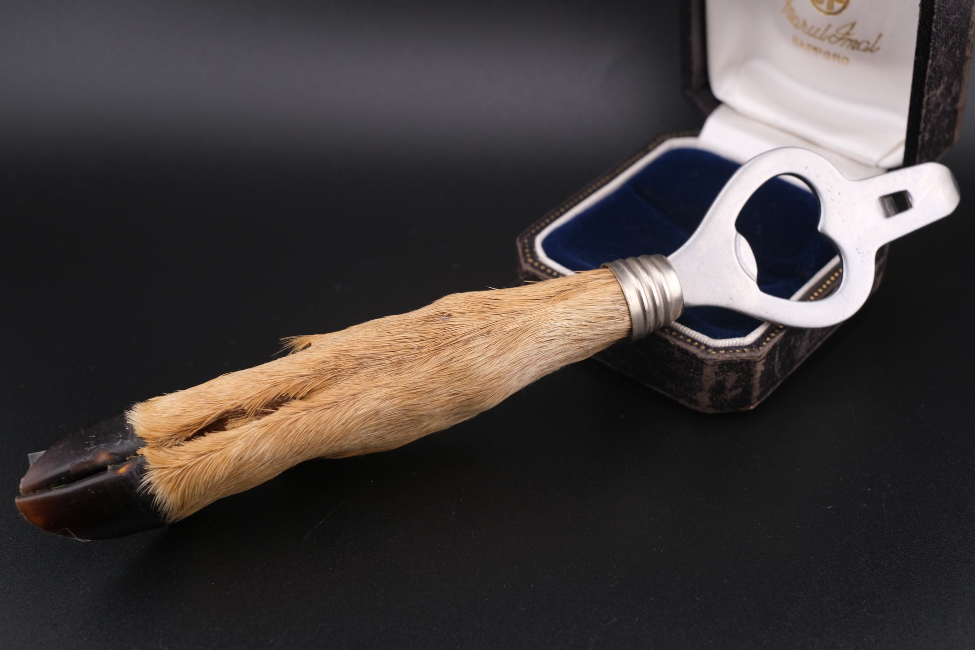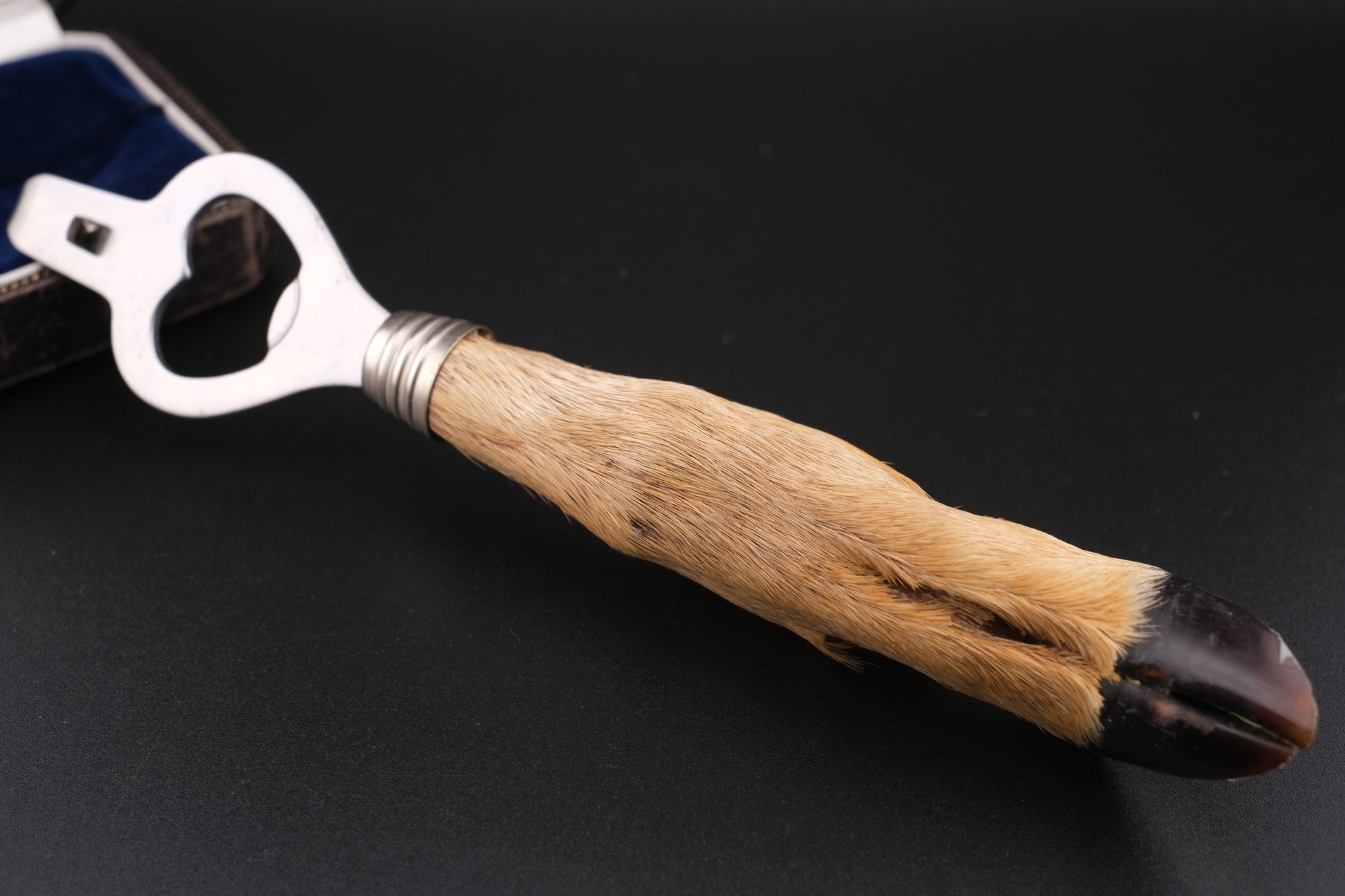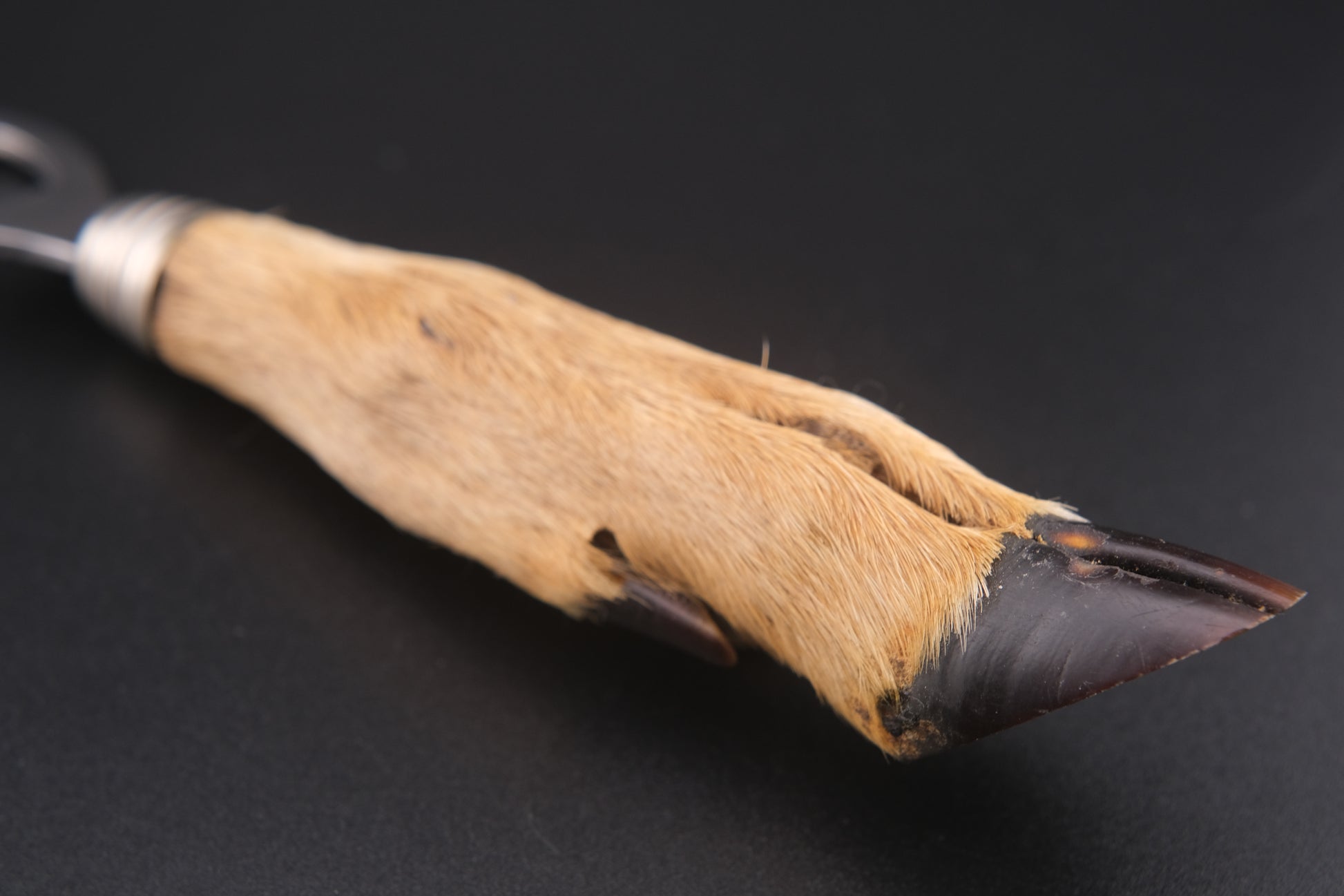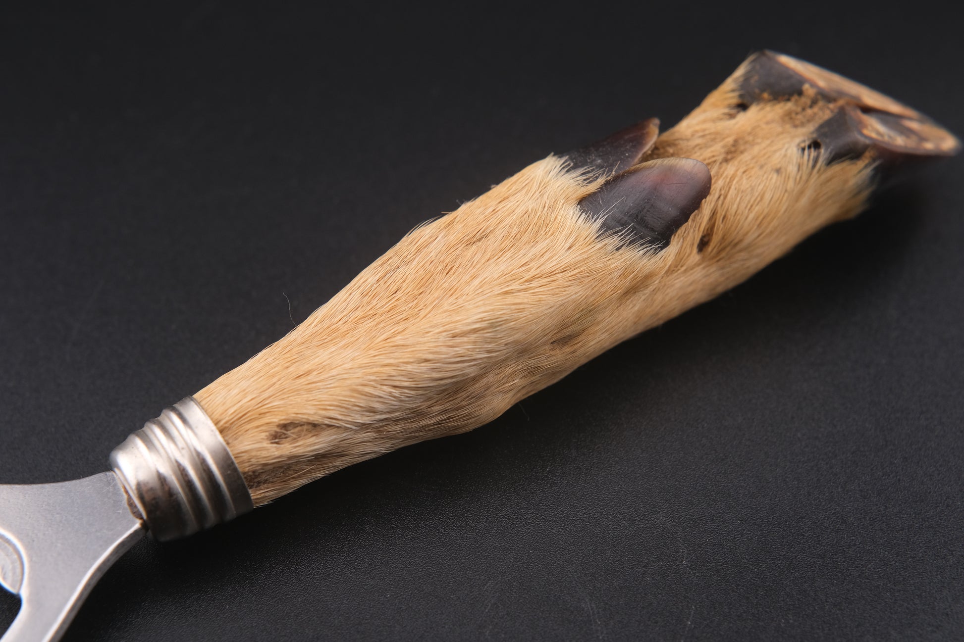 - Design: Bottle opener with genuine deer hoof handle and metal-wrapped collar