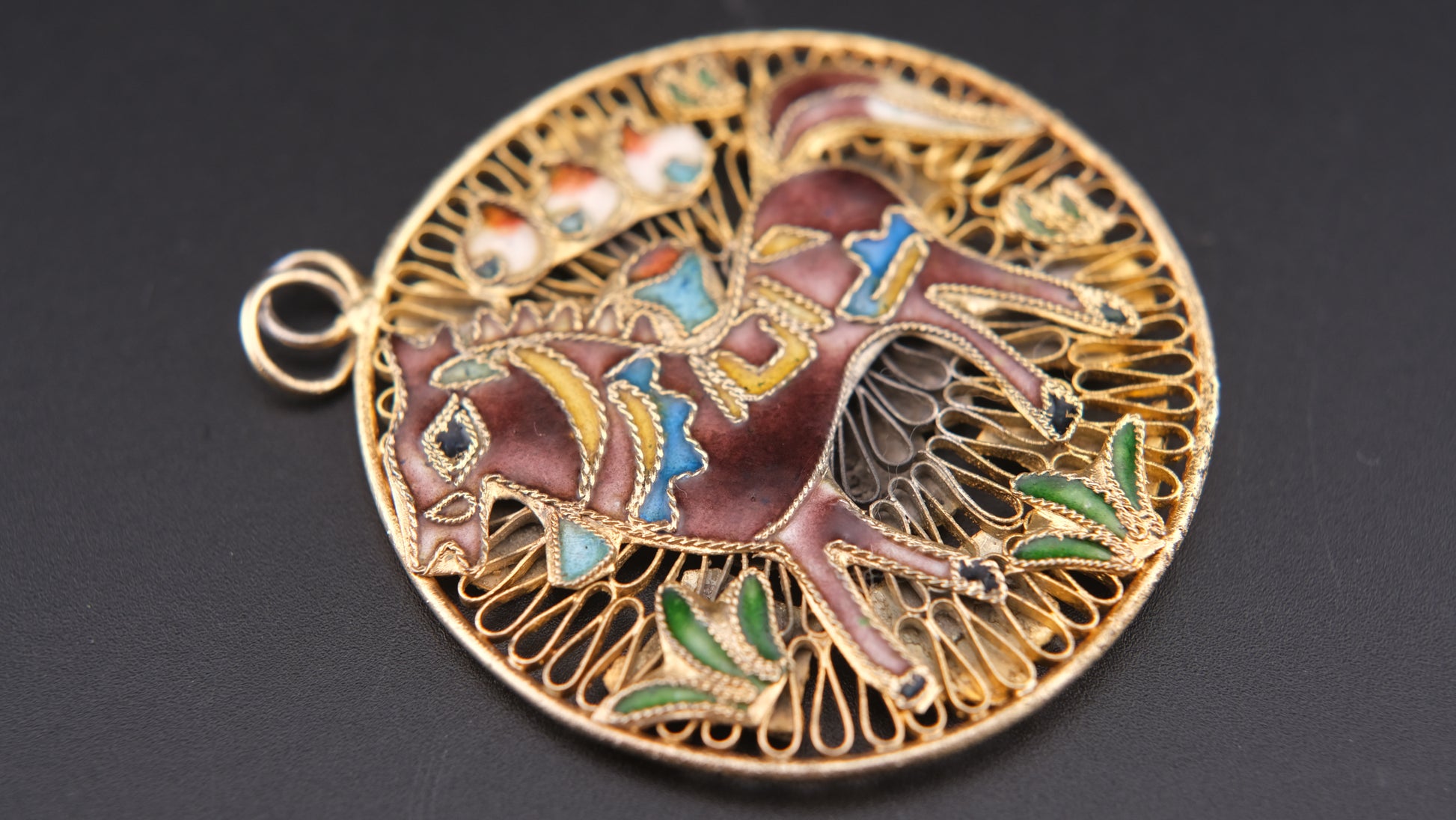 Vintage Double-Sided Cloisonné Pendant – Horse & Floral Motif in Gold Tone Filigree (Chain Excluded)
