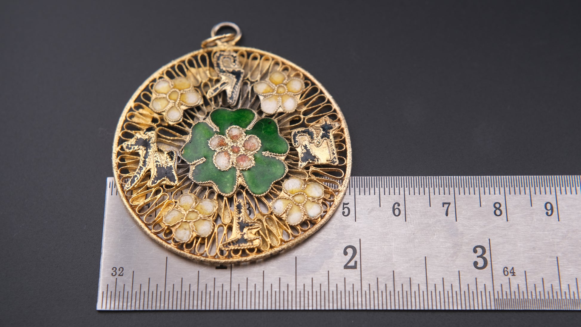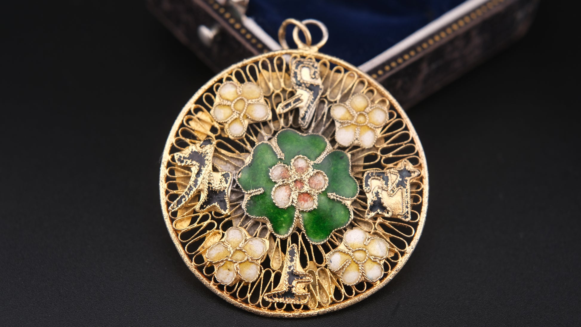 Framed in delicate gold-tone filigree, this round pendant is a striking piece of wearable art. The intricate cloisonné work uses maroon, green, yellow, blue, and white enamel to create vivid contrast and charm. A meaningful gift or collector's treasure, this pendant adds timeless elegance to any vintage jewelry collection.