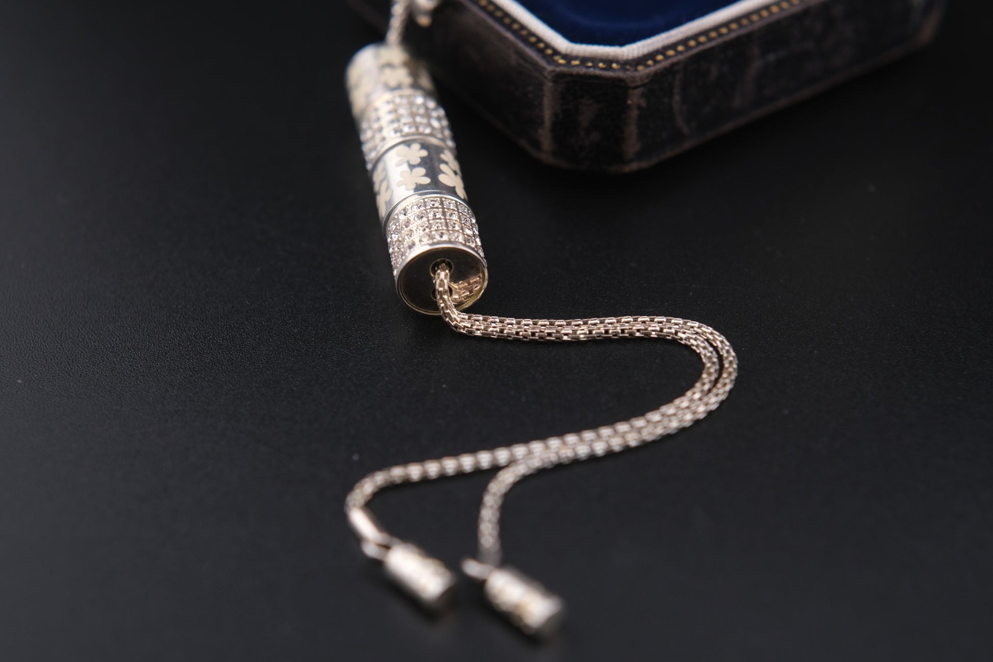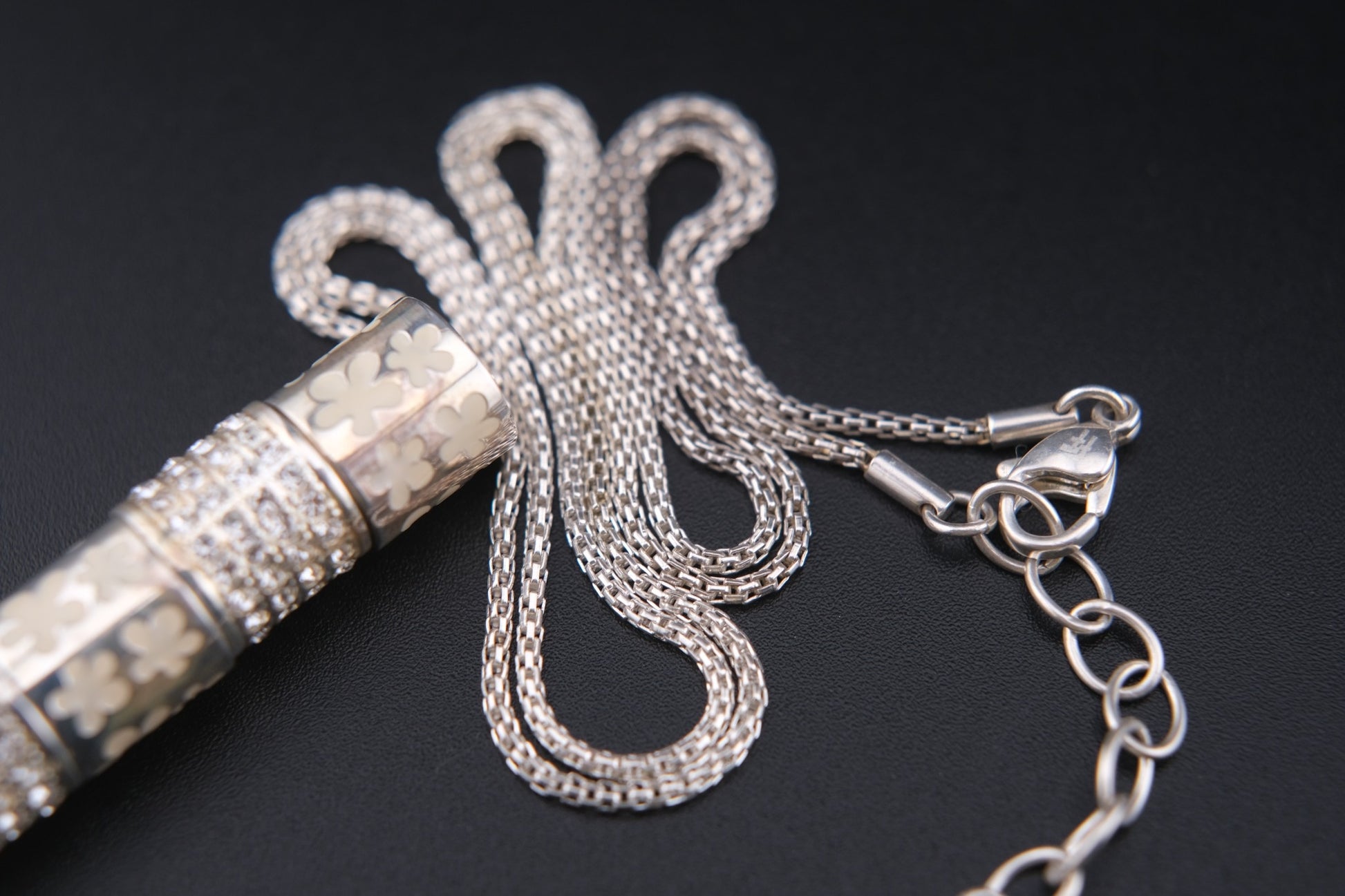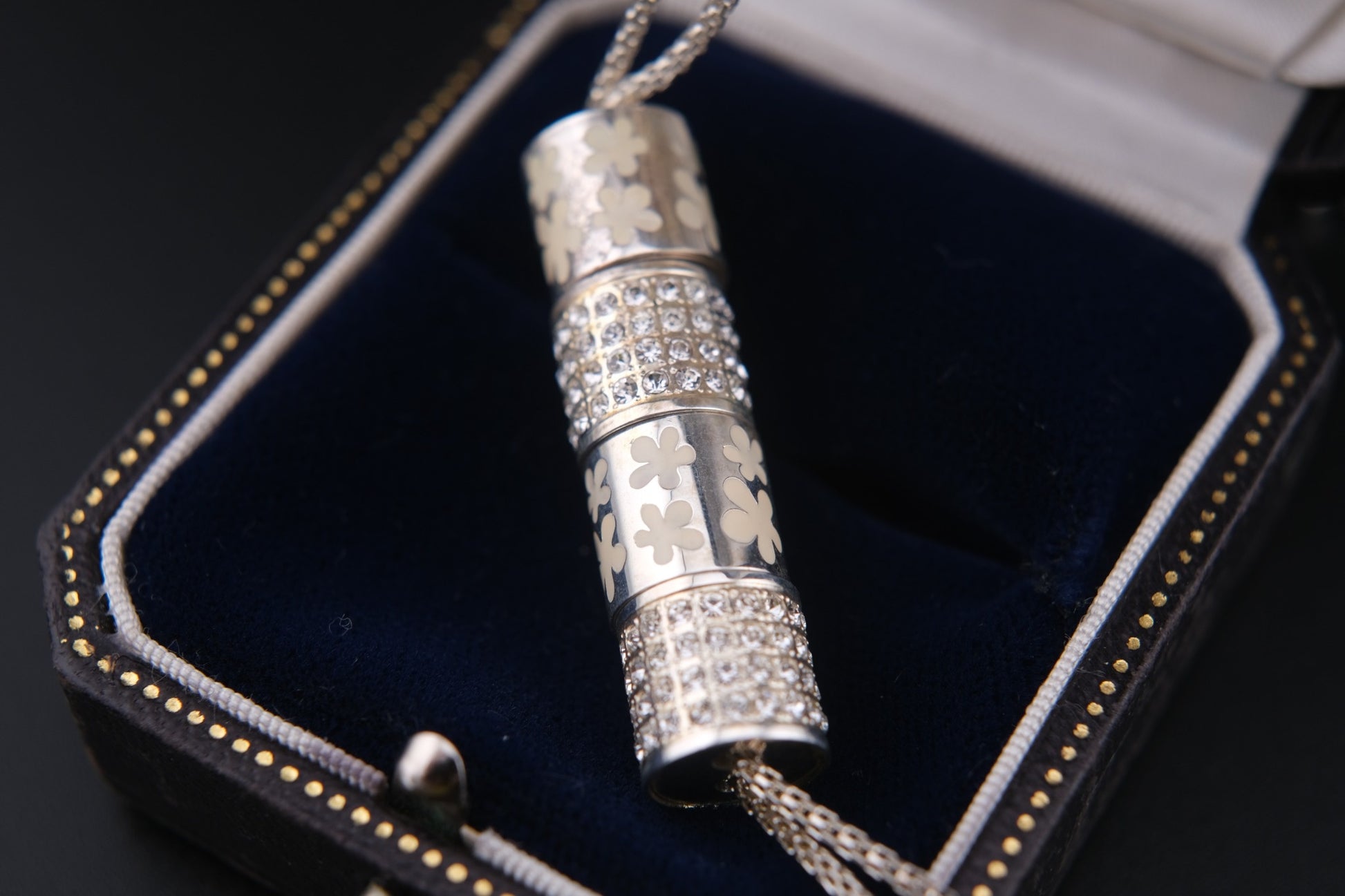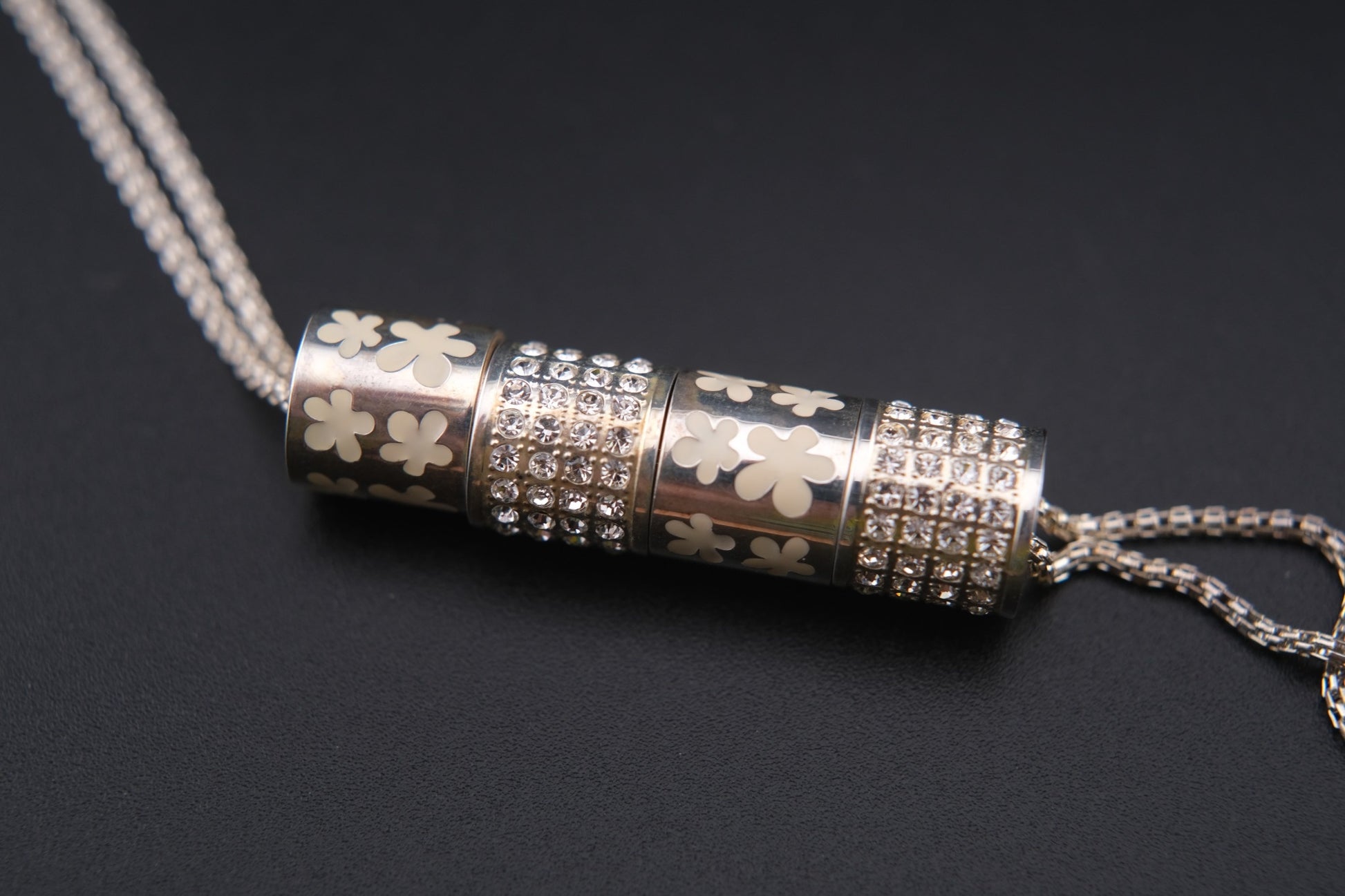 This vintage Folli Follie necklace is a gorgeous example of the brand’s elegant and feminine design. Crafted in silver-tone metal, the piece features a charming Y-shaped lariat drop, centered around a cylindrical pendant adorned with alternating bands of clear rhinestones and delicate white enamel flower motifs.