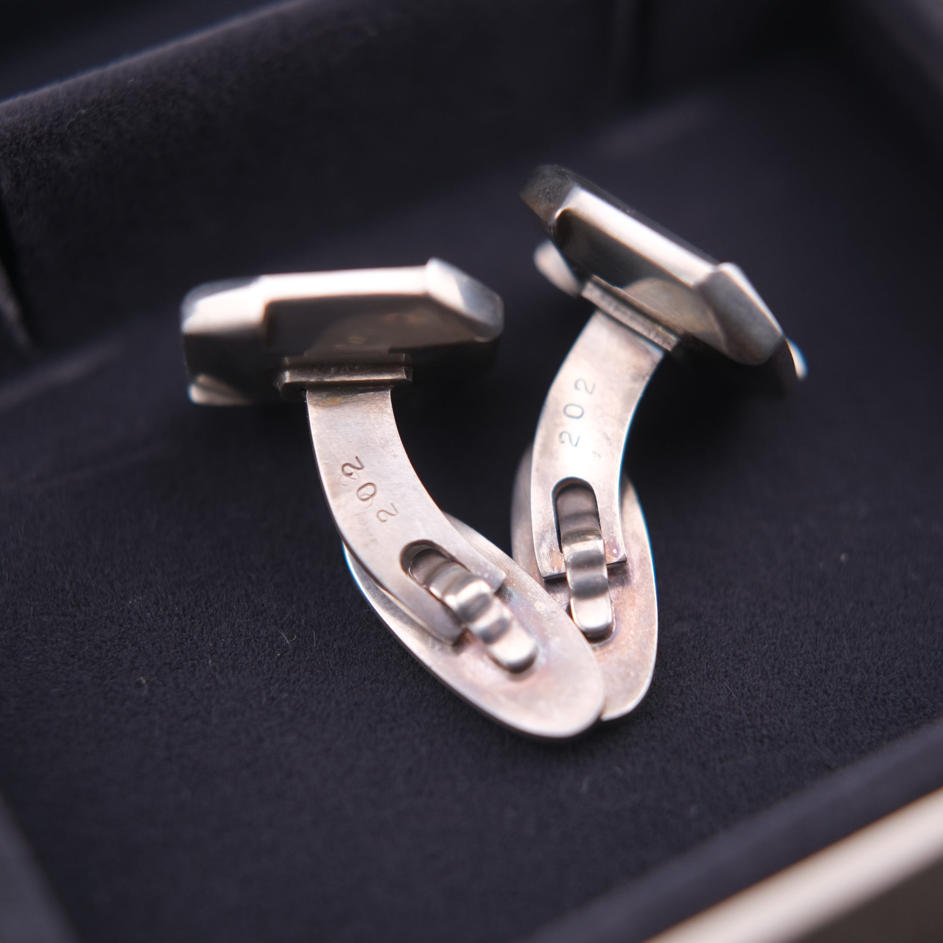 Model 202, designed in sterling silver (925S) and stamped with the Georg Jensen hallmark, they are a fine example of Jensen’s enduring legacy in men’s accessories. They come presented in their original Georg Jensen box, making them a distinguished addition to any wardrobe.