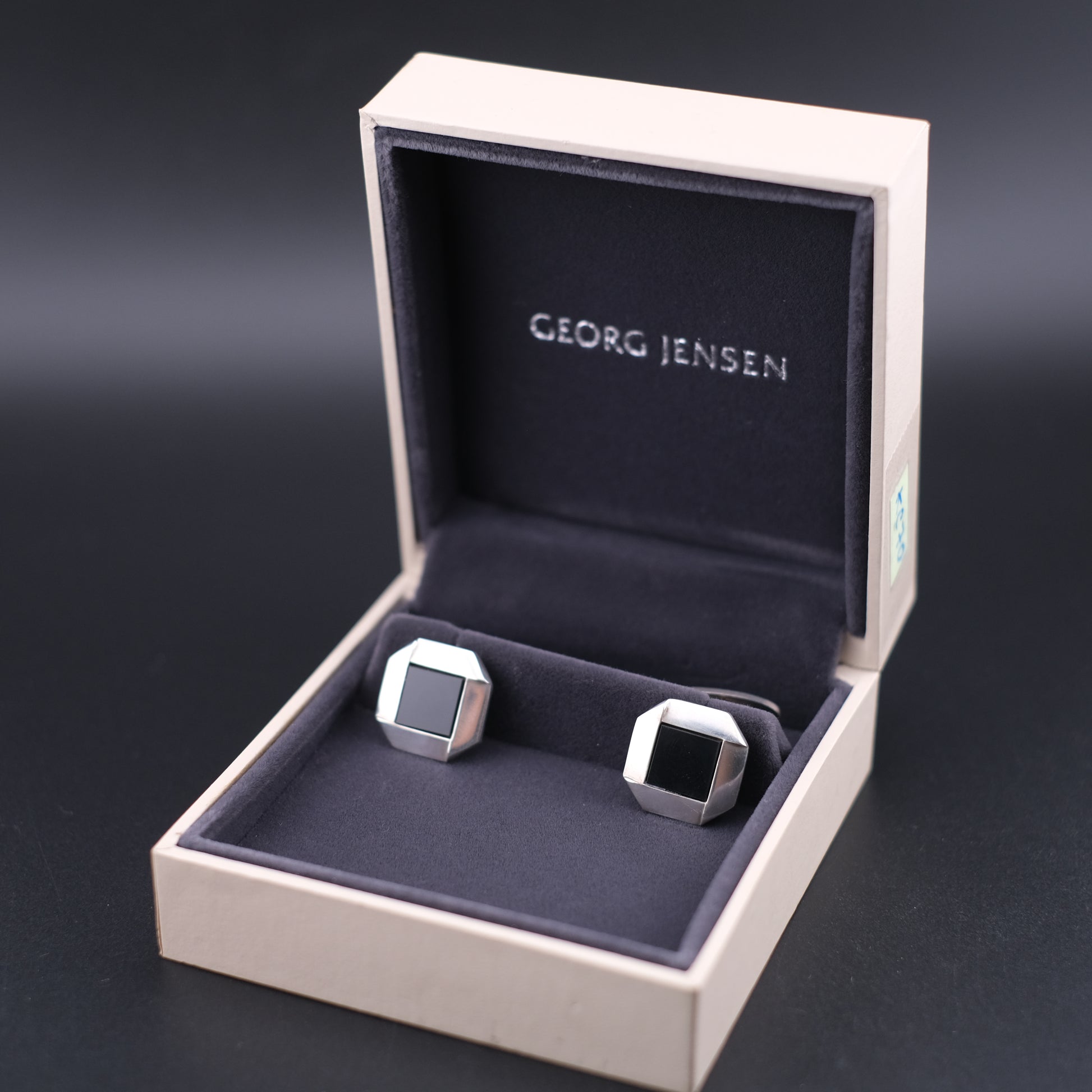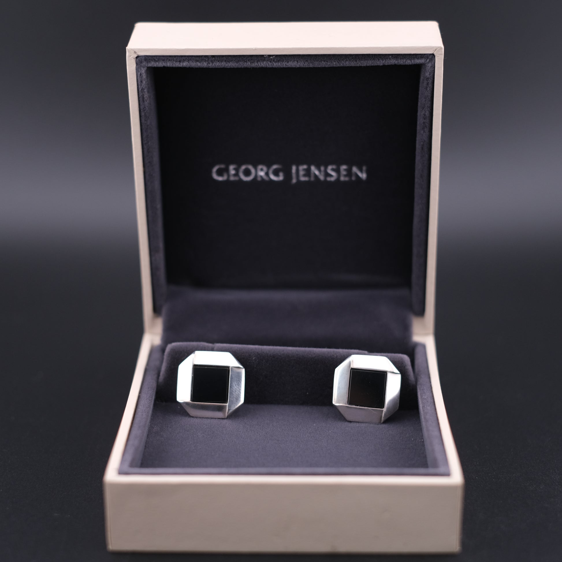 Add a touch of Scandinavian elegance to your collection with these vintage Georg Jensen cufflinks, crafted in sterling silver and set with polished black onyx. Featuring a bold geometric design, these cufflinks embody timeless modernist style and Danish craftsmanship.