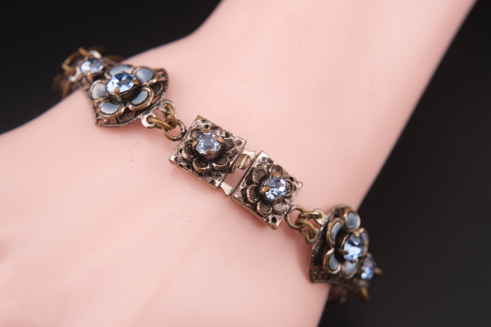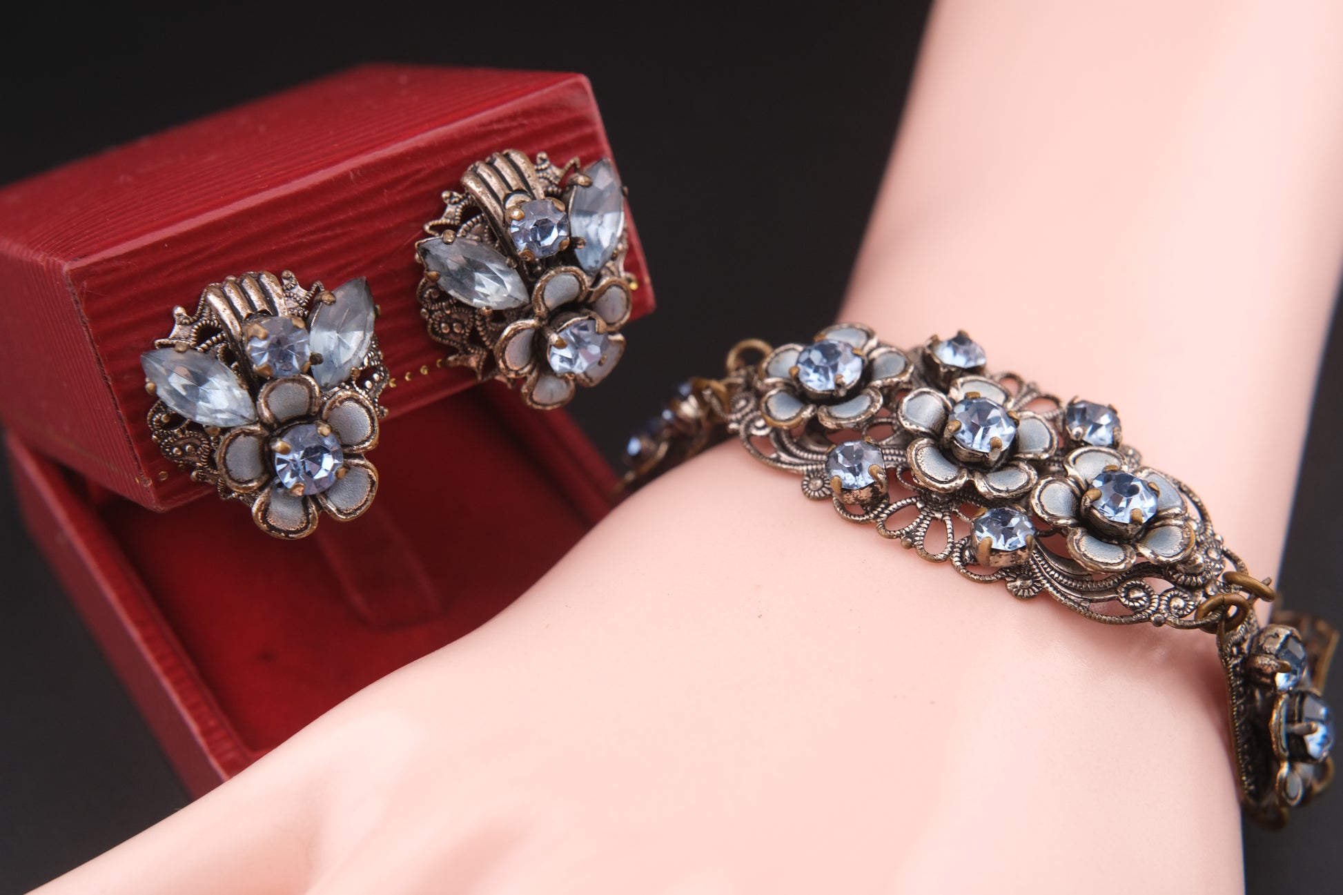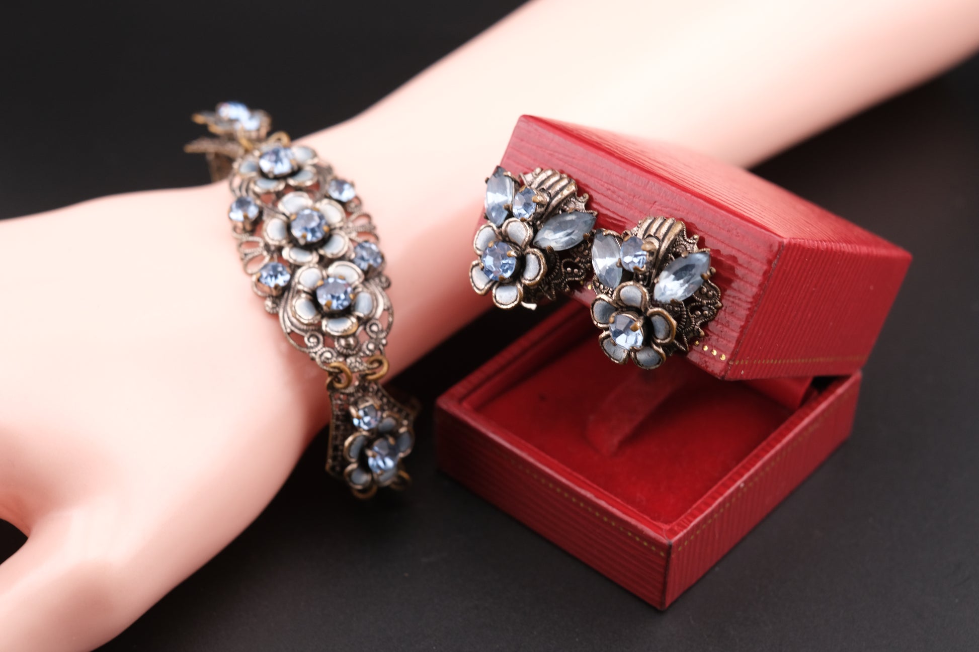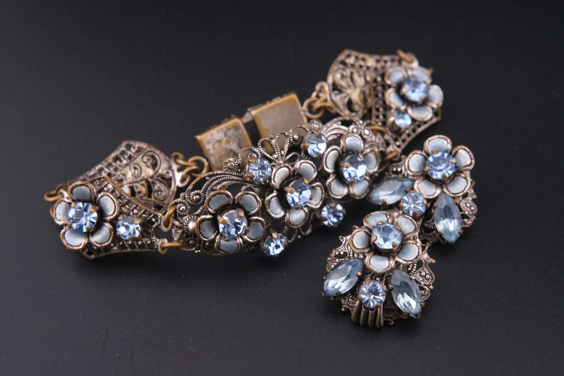 This enchanting vintage jewelry set from 1950s Germany includes a floral link bracelet and matching clip-on earrings. Delicately crafted with soft blue enamel petals and sparkling blue rhinestones, each element is framed in intricate filigree metalwork. Originally finished in silver tone, areas of bronze patina are now visible due to age and wear—adding antique charm and highlighting the ornate design.
