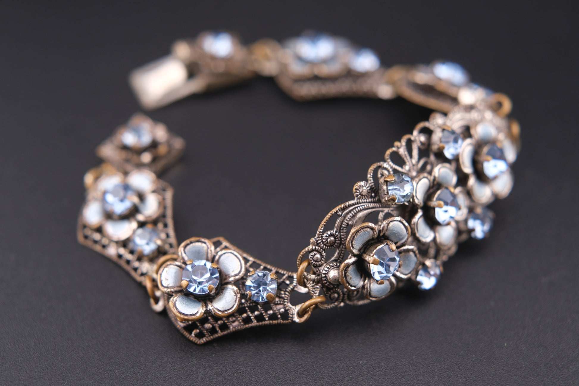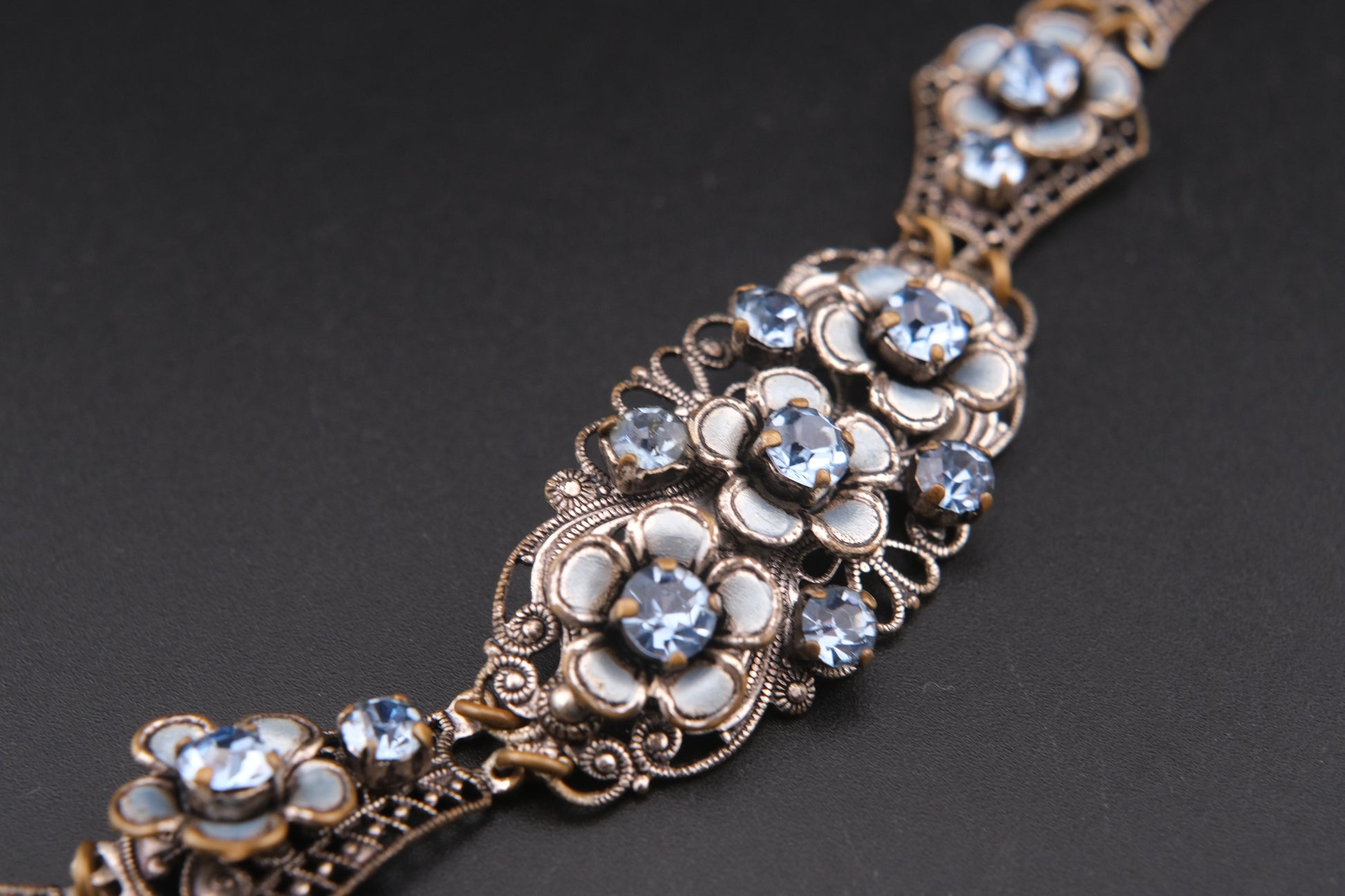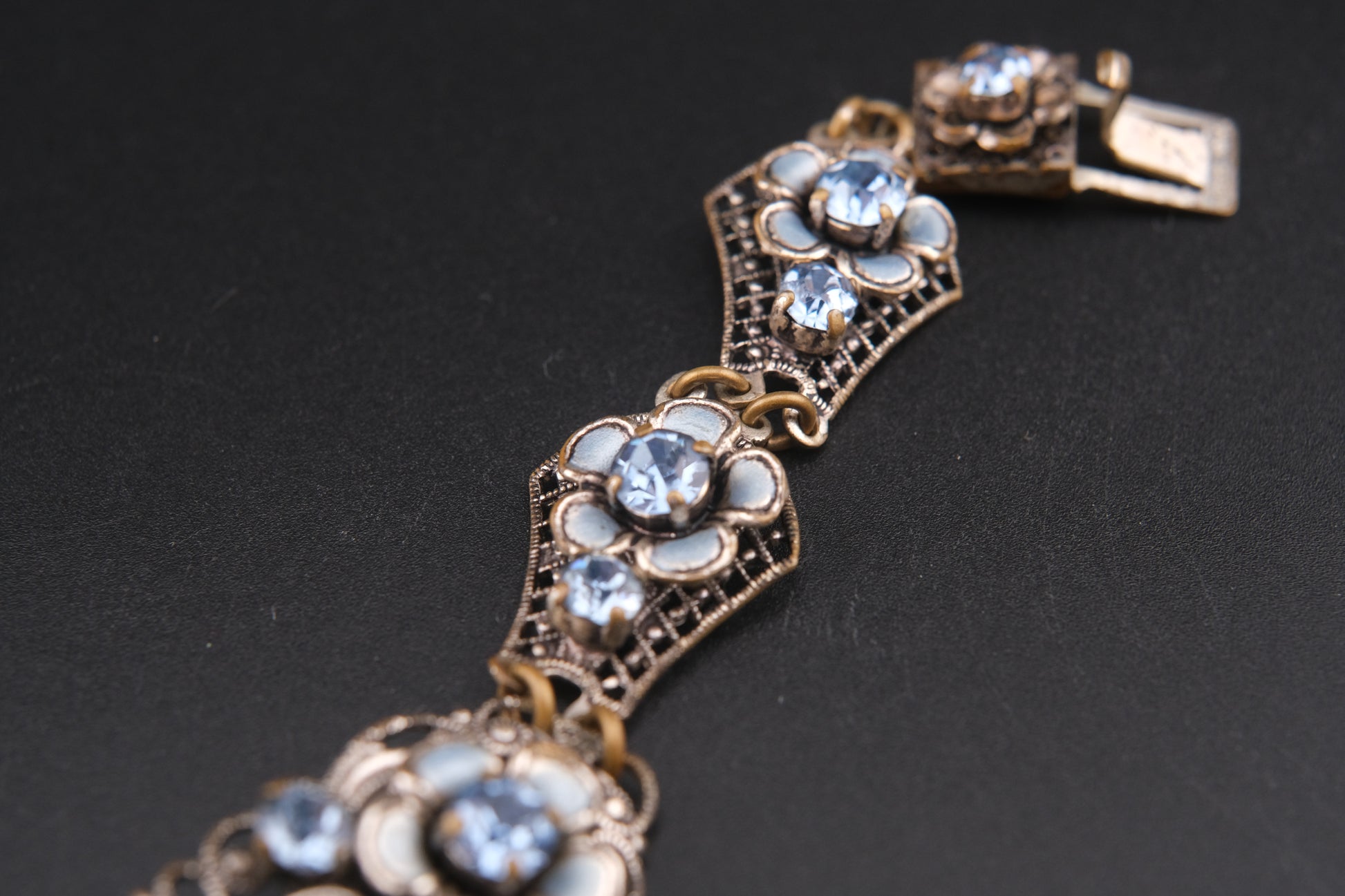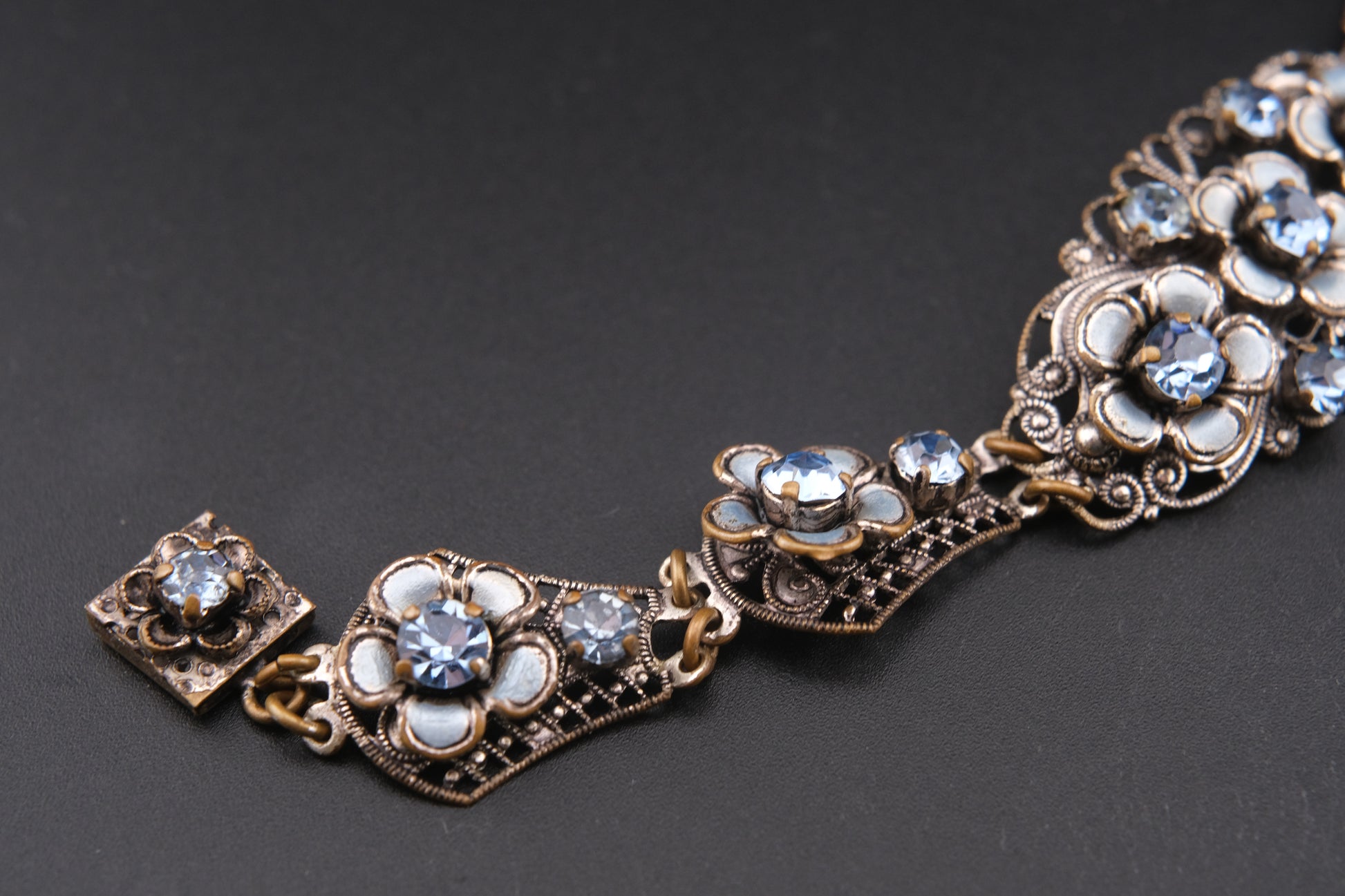 This enchanting vintage jewelry set from 1950s Germany includes a floral link bracelet and matching clip-on earrings. Delicately crafted with soft blue enamel petals and sparkling blue rhinestones, each element is framed in intricate filigree metalwork. Originally finished in silver tone, areas of bronze patina are now visible due to age and wear—adding antique charm and highlighting the ornate design.