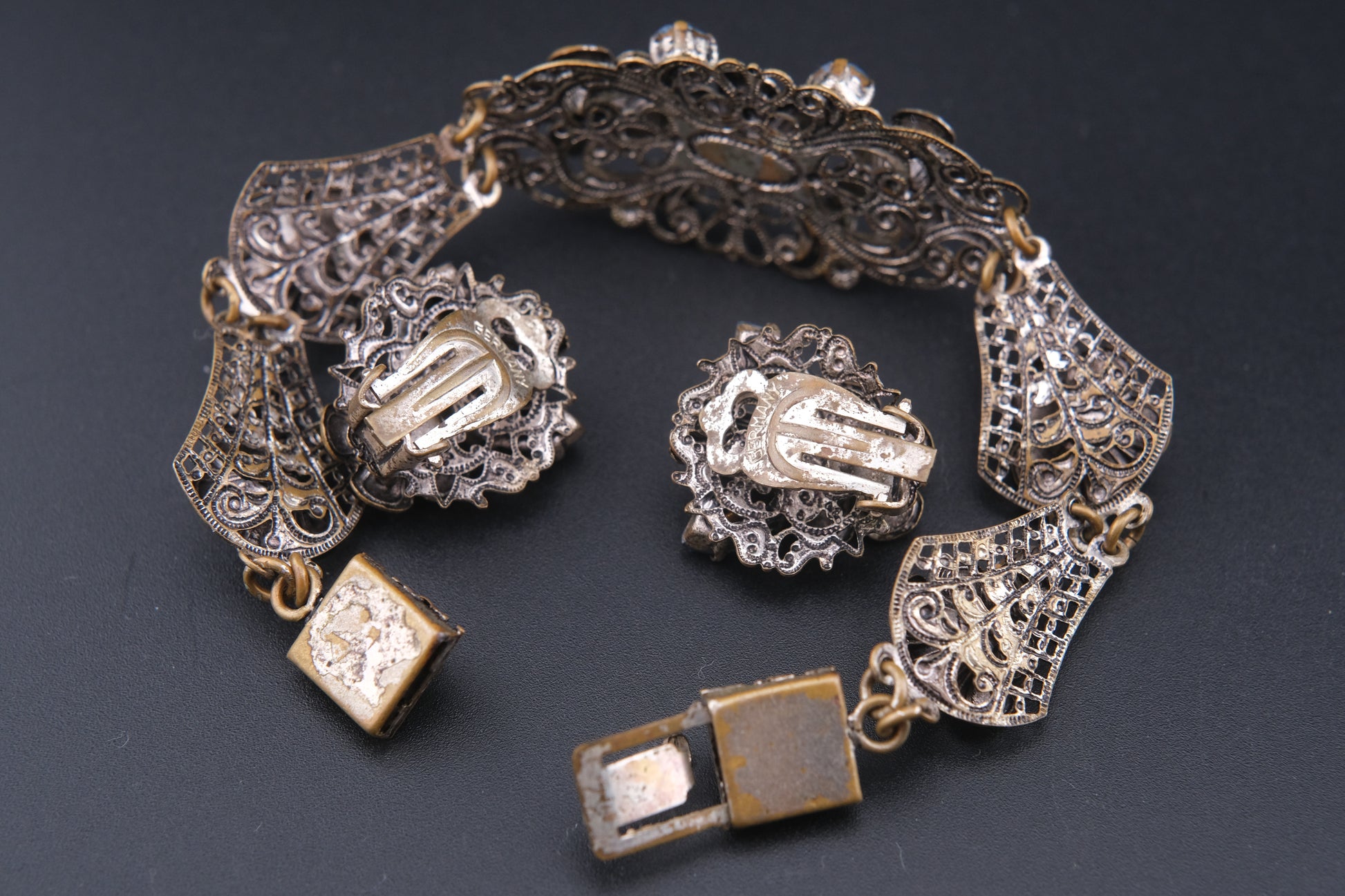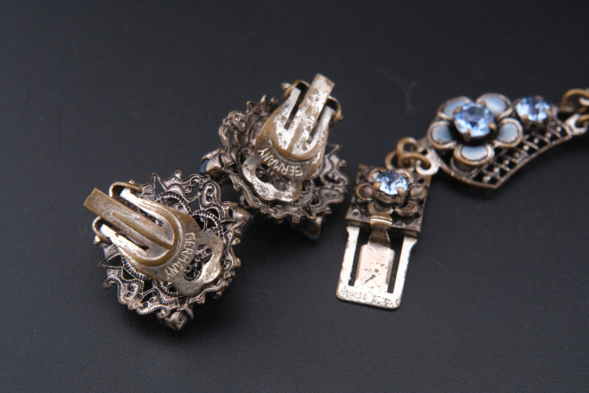 The bracelet fastens with a secure box clasp, while the earrings feature comfortable hinged clip backs and are stamped "GERMANY" on the reverse. A beautiful, romantic accessory for vintage collectors, bridal styling, or special occasion wear.