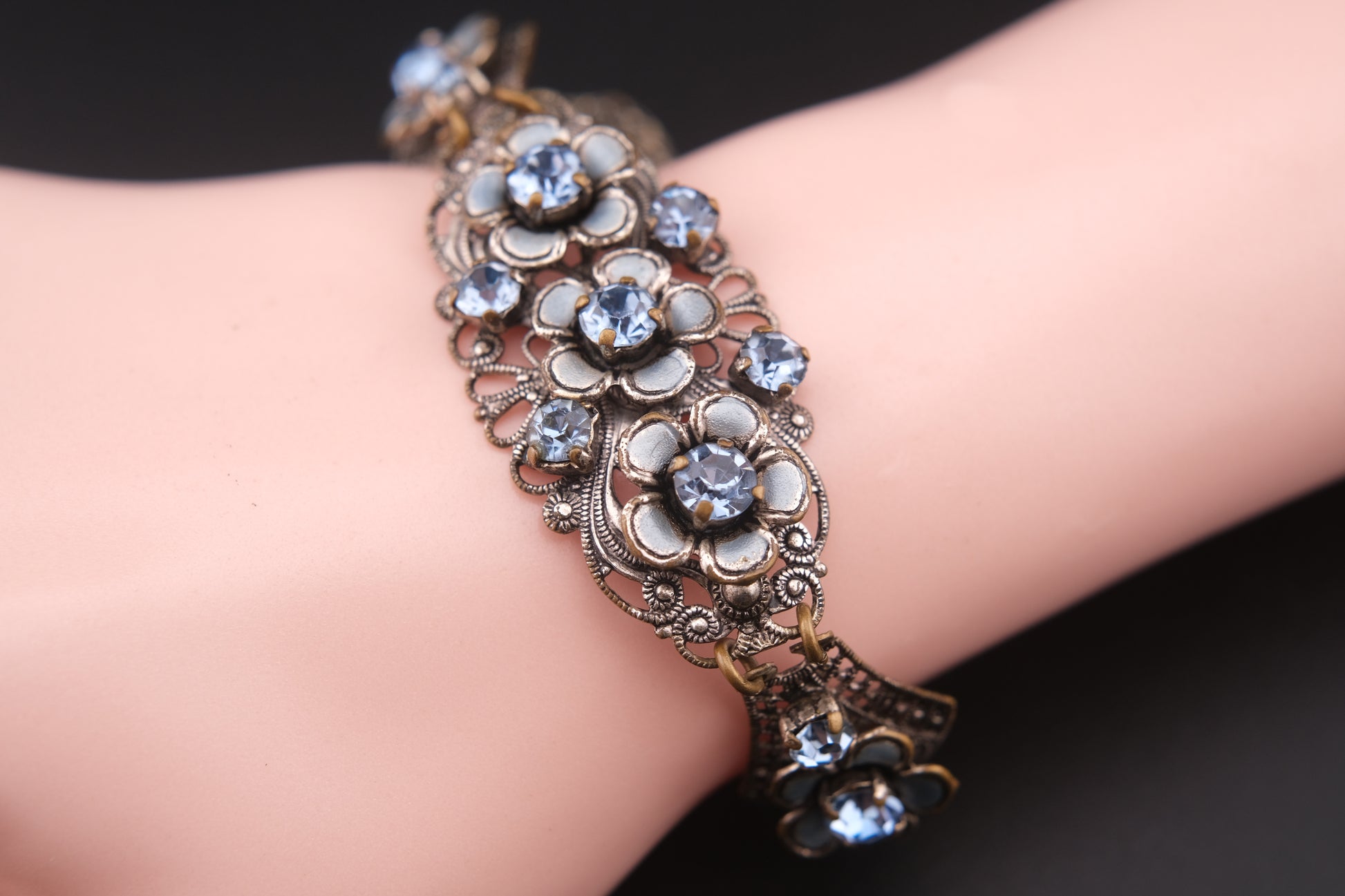 - Design: Floral motif with blue rhinestones and light blue enamel over filigree panels