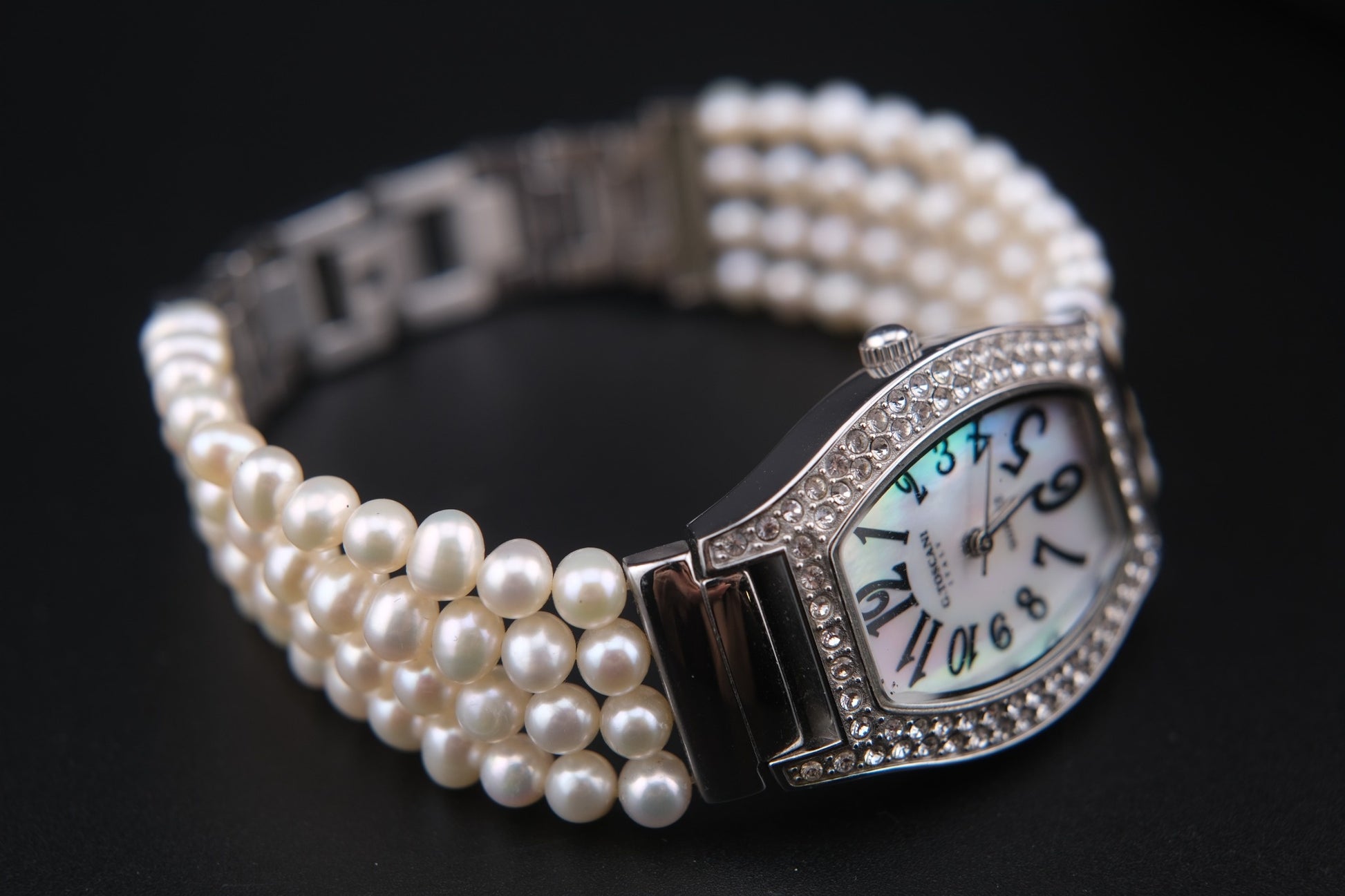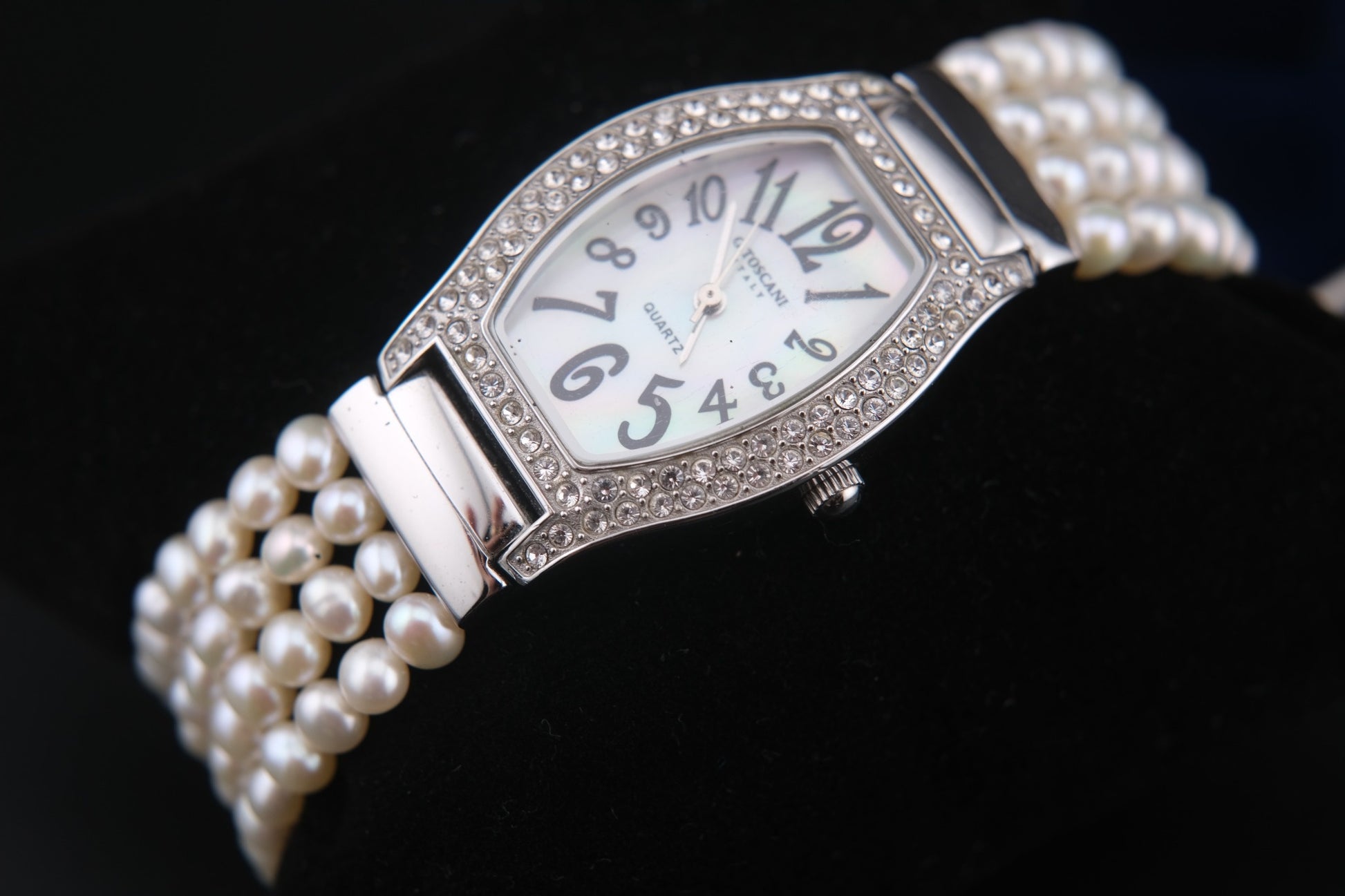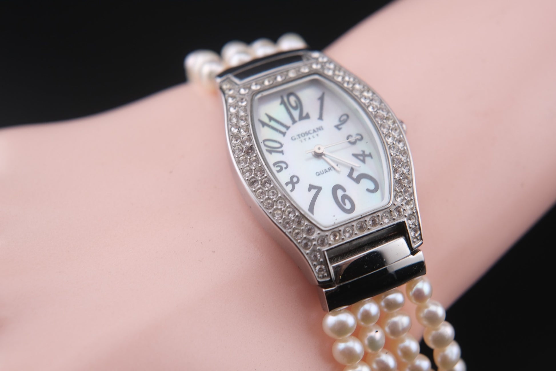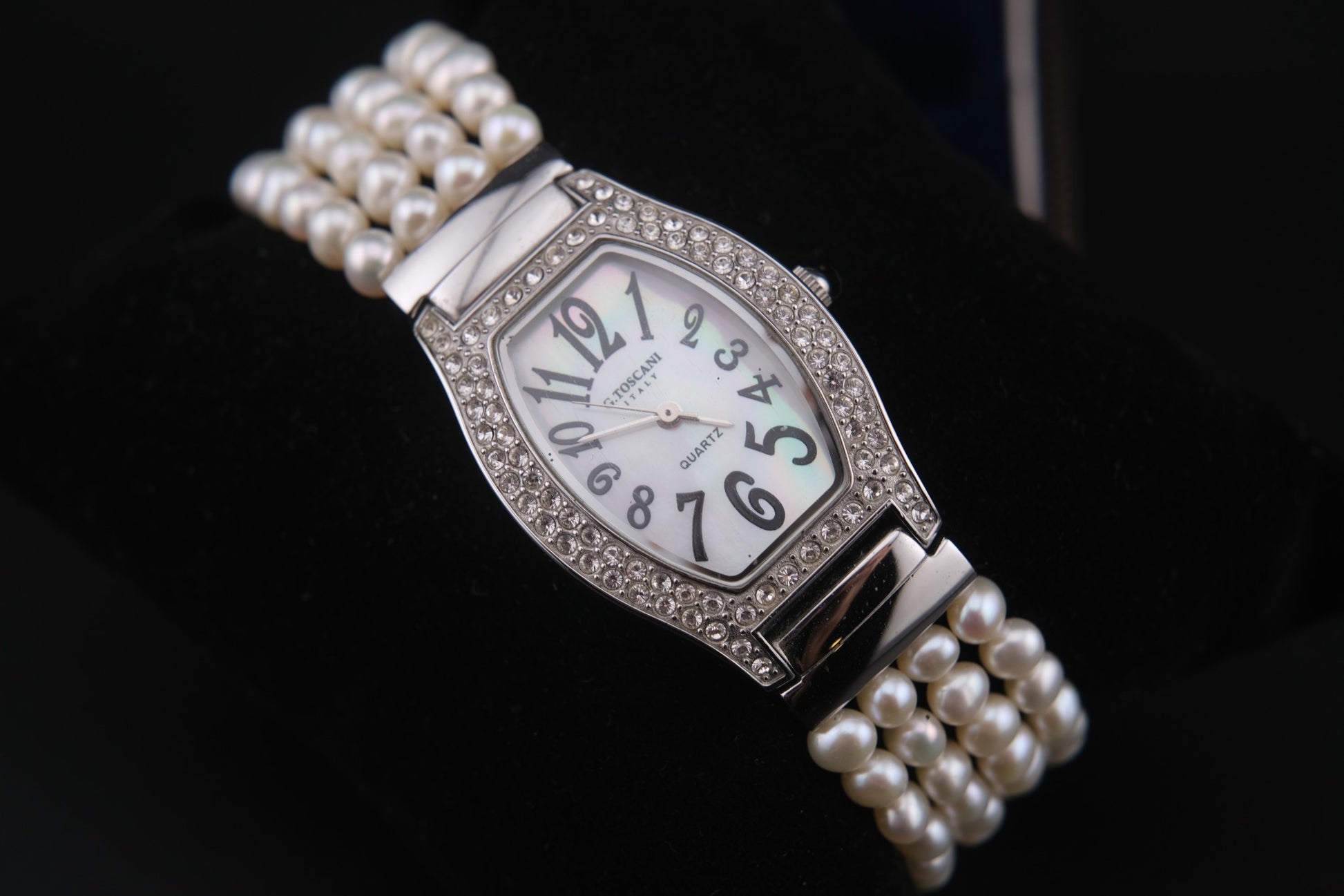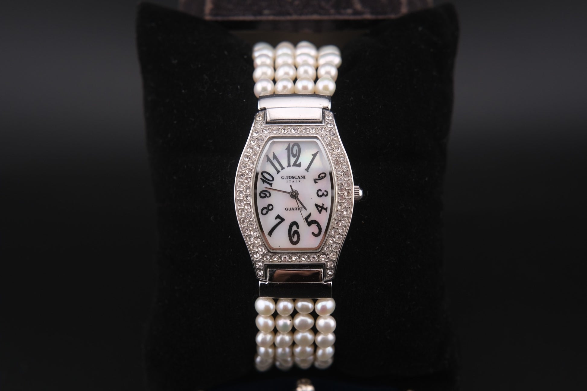 Vintage Gianfranco Toscani Watch with Genuine Pearl Bracelet and Crystal Accents