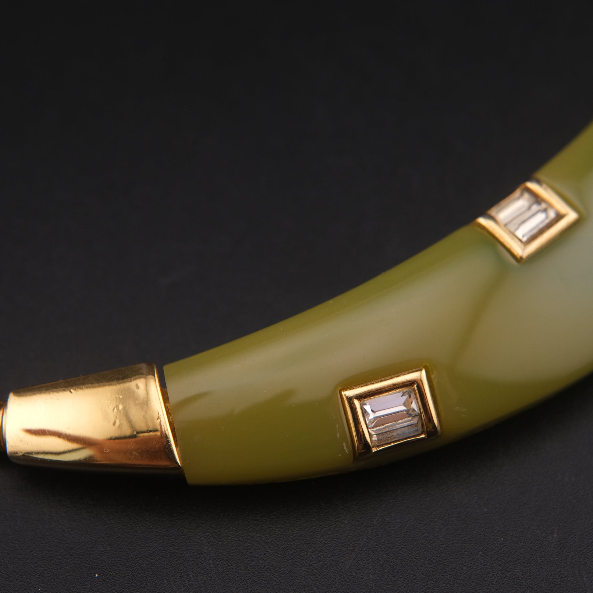 Add a rare designer statement to your collection with this bold vintage Givenchy choker necklace. The design features a curved centerpiece crafted in smooth green resin with a gradient of olive to jade tones. Embedded along the arc are six rectangular baguette-cut rhinestones arranged in three pairs, set in gold-tone frames for a modern, structured elegance.