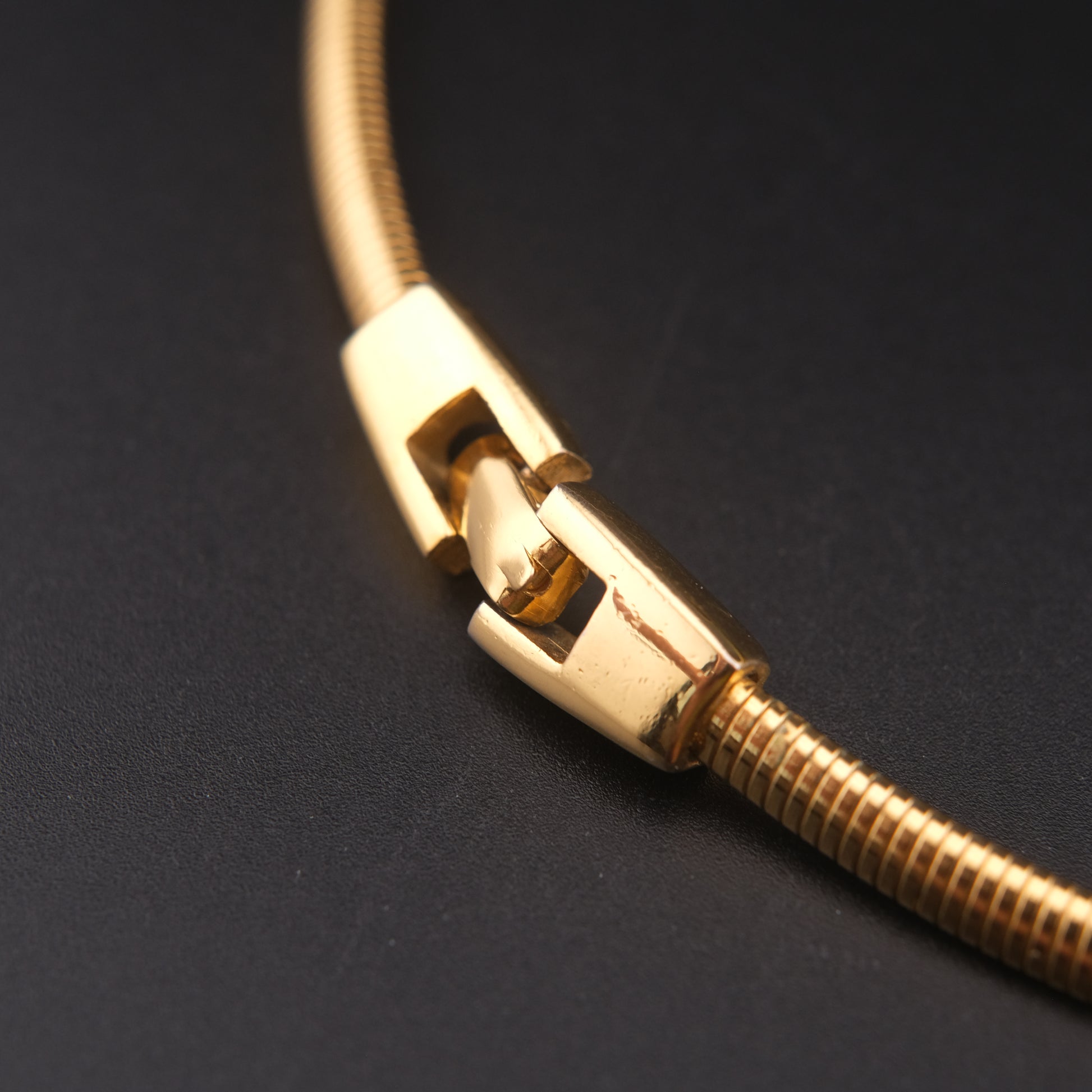 The centerpiece flows seamlessly into a flexible gold-tone snake chain, secured with a sturdy box clasp. Distinctive and collectible, this necklace embodies Givenchy’s sophisticated sculptural style from the late 1980s–1990s.
