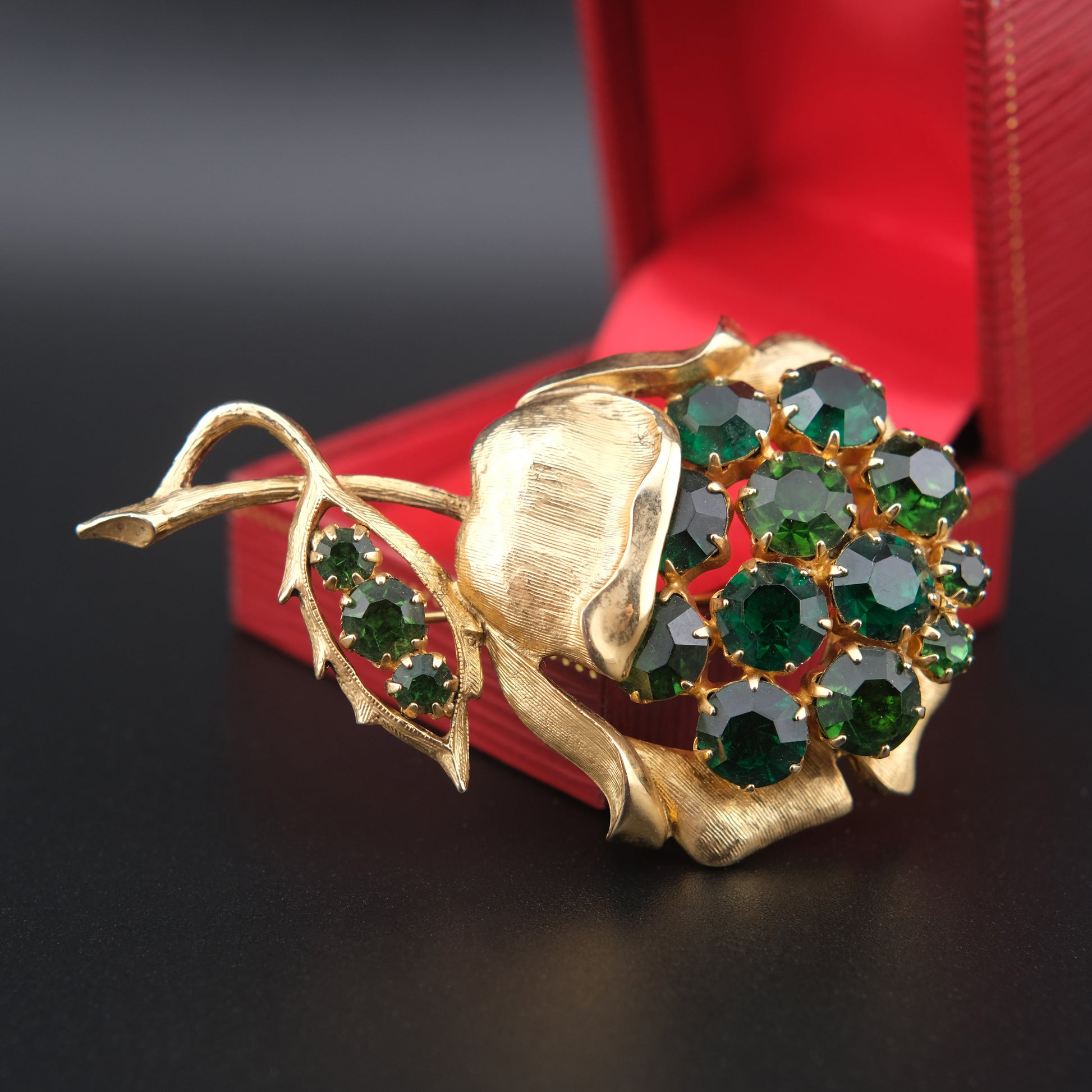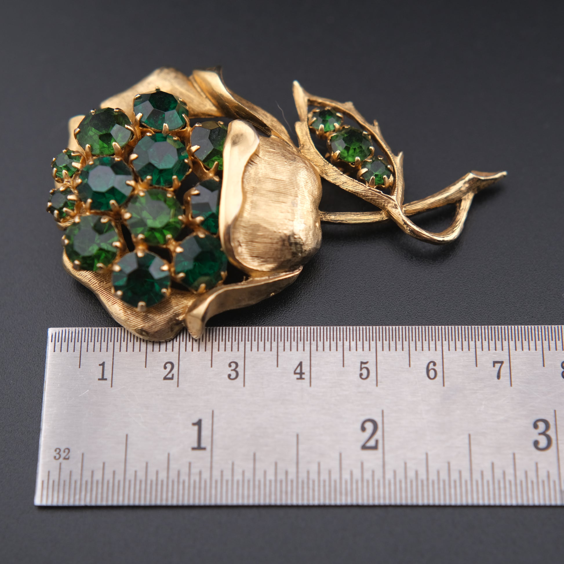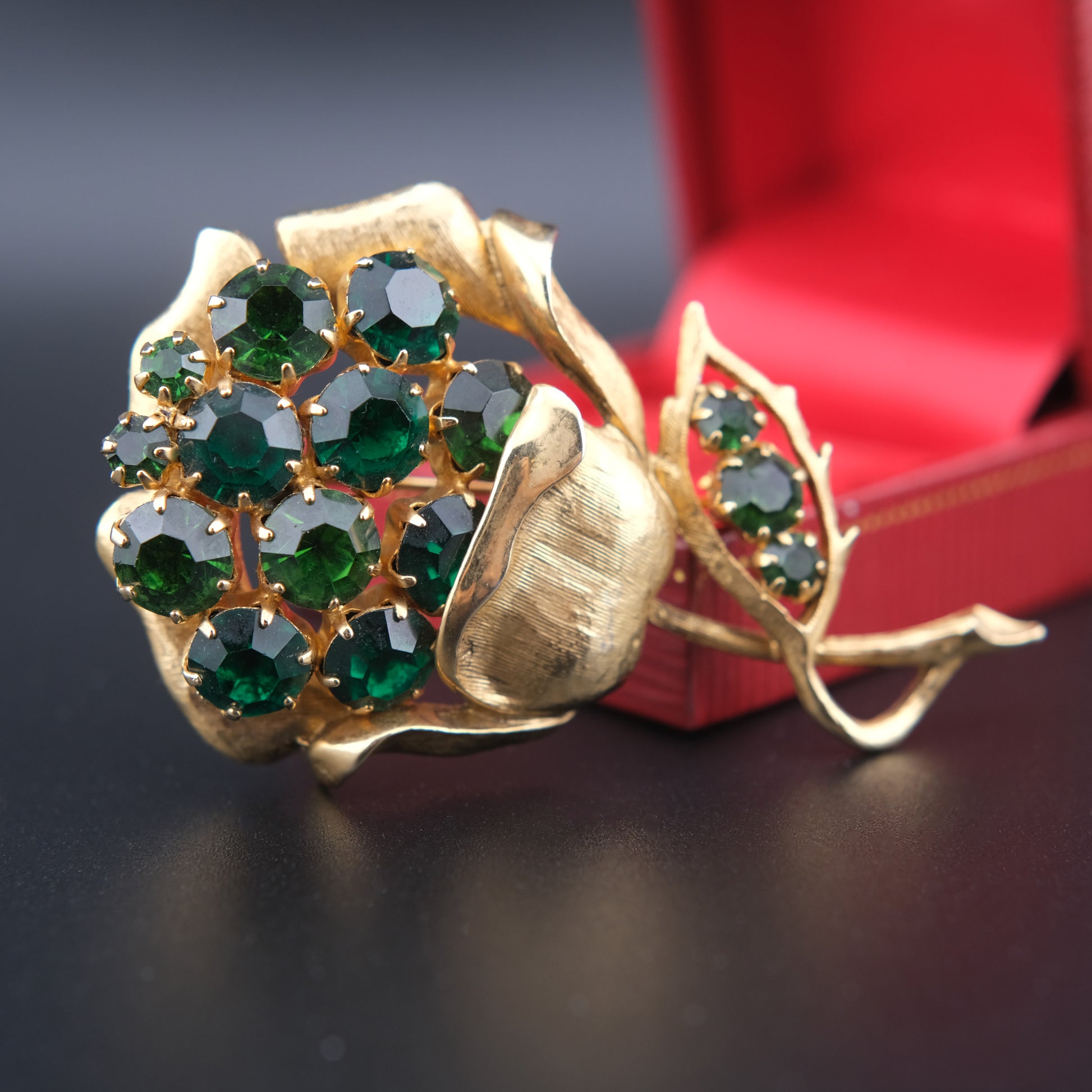 Add a touch of timeless elegance to your outfit with this exquisite vintage brooch. Crafted in a rich gold-tone finish, the brooch features a beautifully sculpted flower design, adorned with vivid emerald-green rhinestones that sparkle brilliantly against the textured petals and leaves. Measuring approximately 2.5" in length, this piece makes a bold yet refined statement on a lapel, dress, or scarf. A classic collectible accessory in excellent condition, perfect for gifting or adding to your vintage jewelry collection.