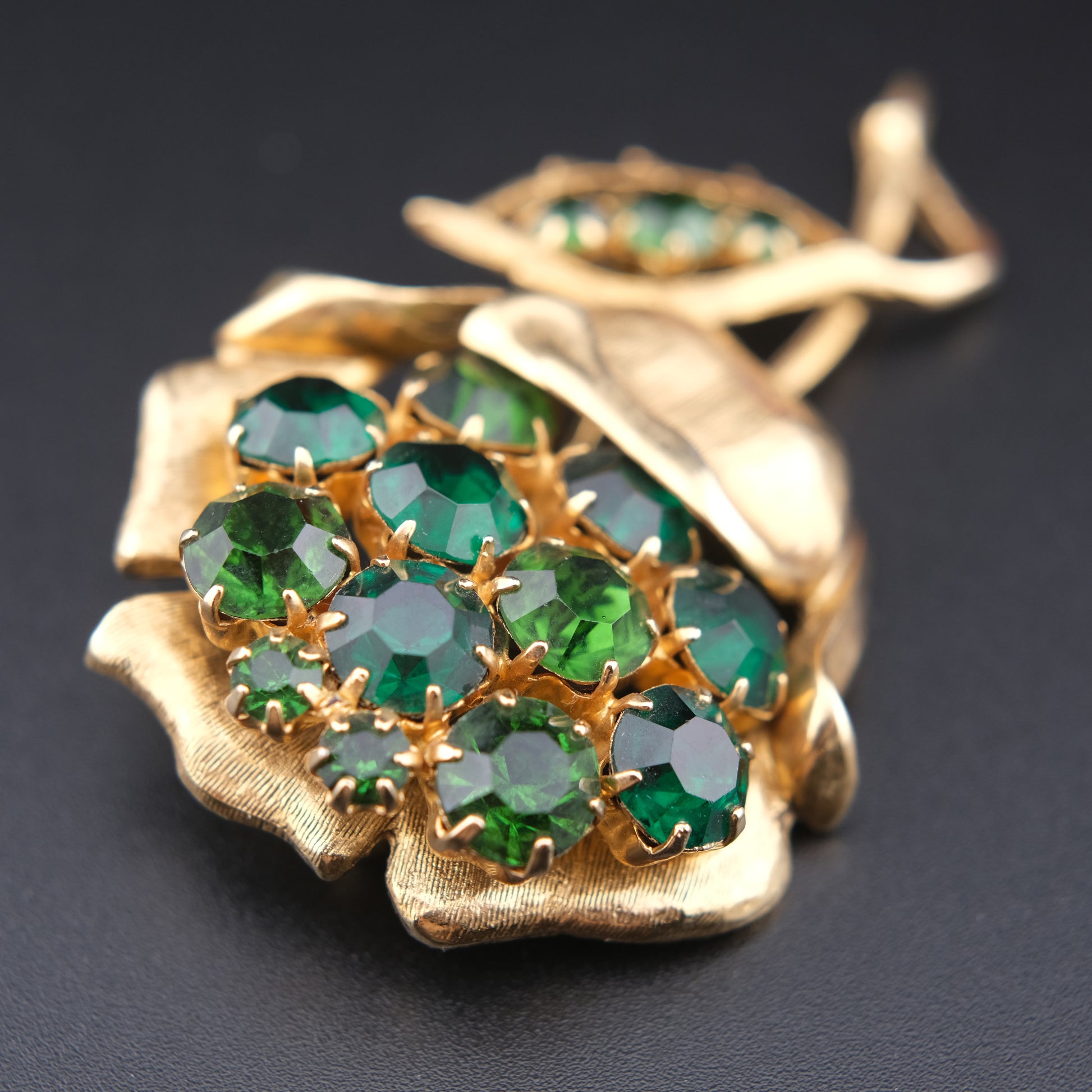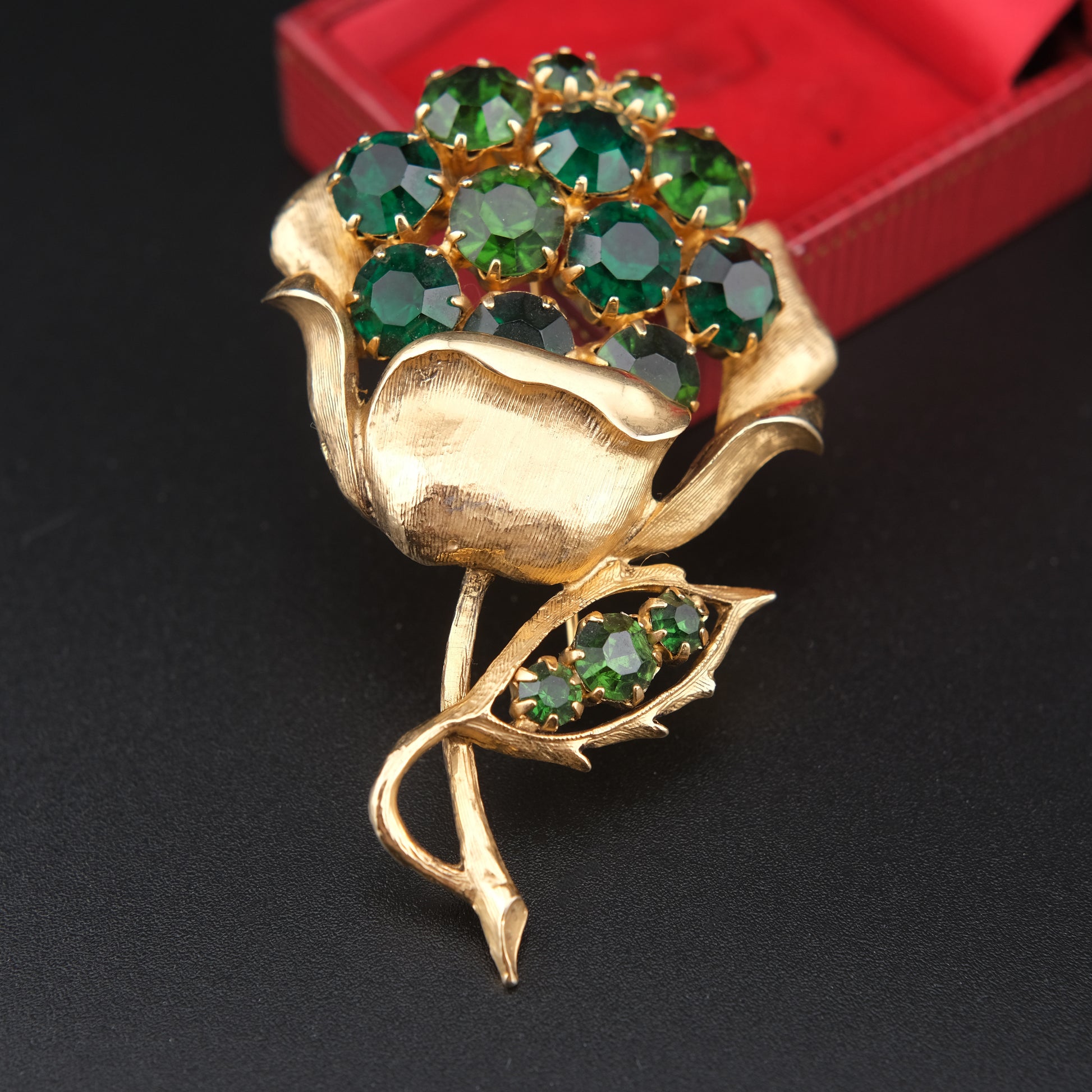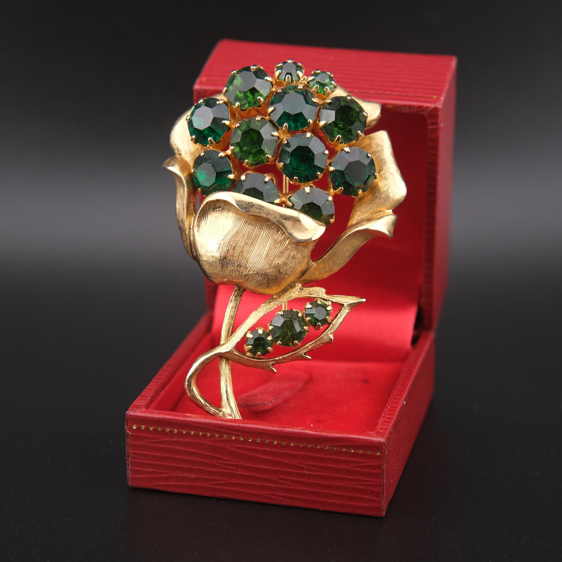 Add a touch of timeless elegance to your outfit with this exquisite vintage brooch. Crafted in a rich gold-tone finish, the brooch features a beautifully sculpted flower design, adorned with vivid emerald-green rhinestones that sparkle brilliantly against the textured petals and leaves. Measuring approximately 2.5" in length, this piece makes a bold yet refined statement on a lapel, dress, or scarf. A classic collectible accessory in excellent condition, perfect for gifting or adding to your vintage jewelry collection.