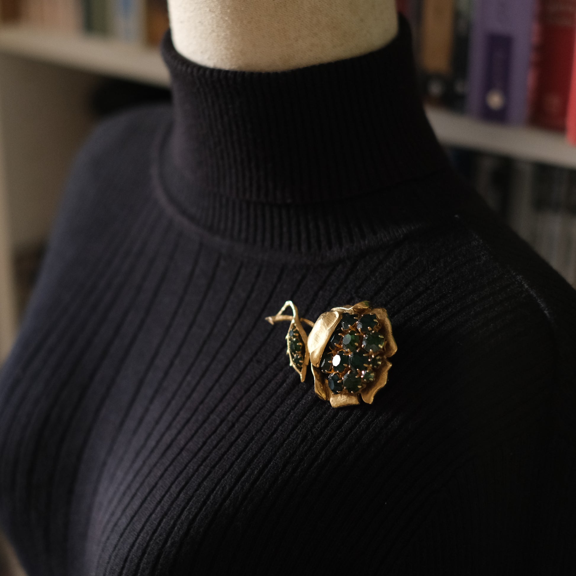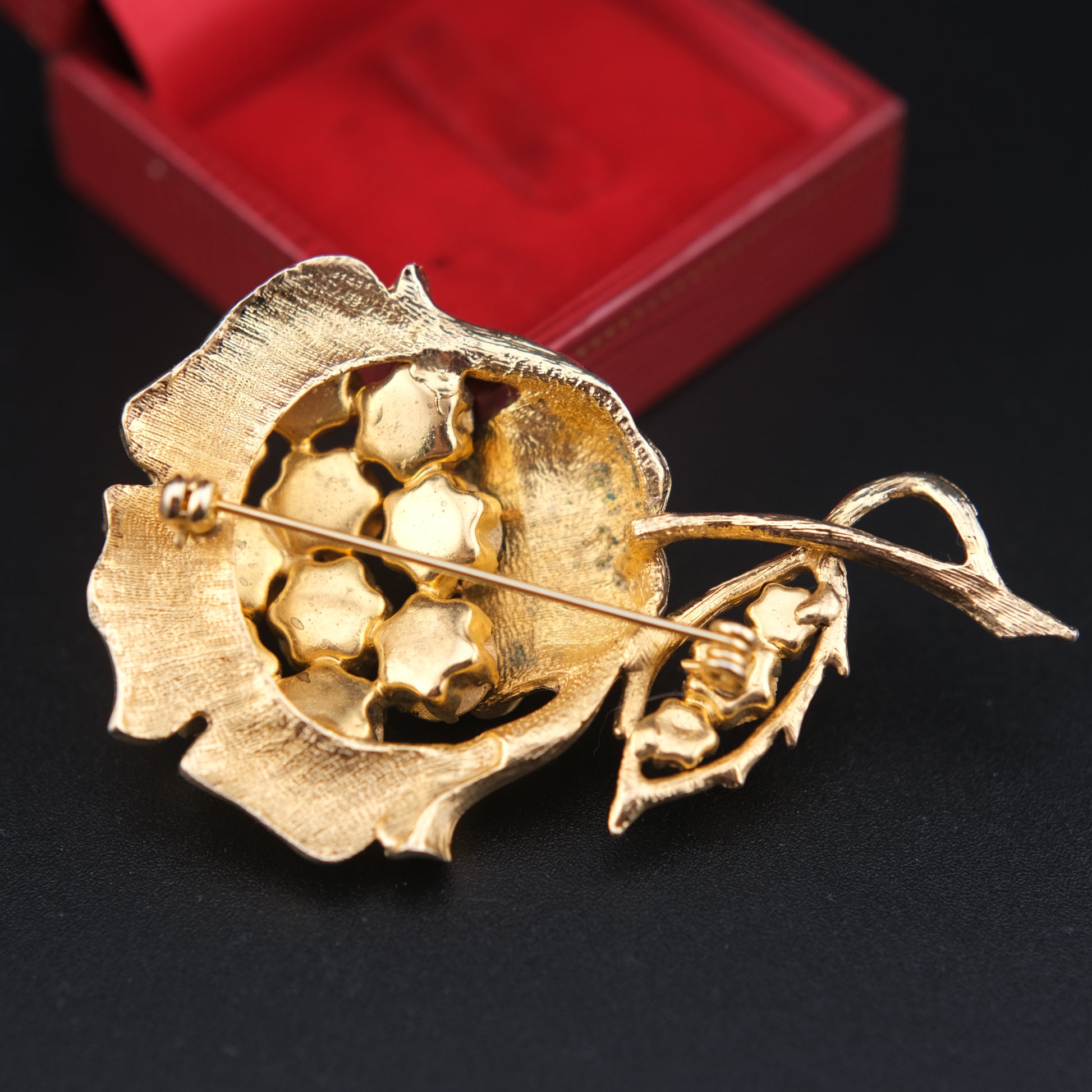 - Design: Floral brooch with cluster of rhinestones in bloom and accent stones on leaf