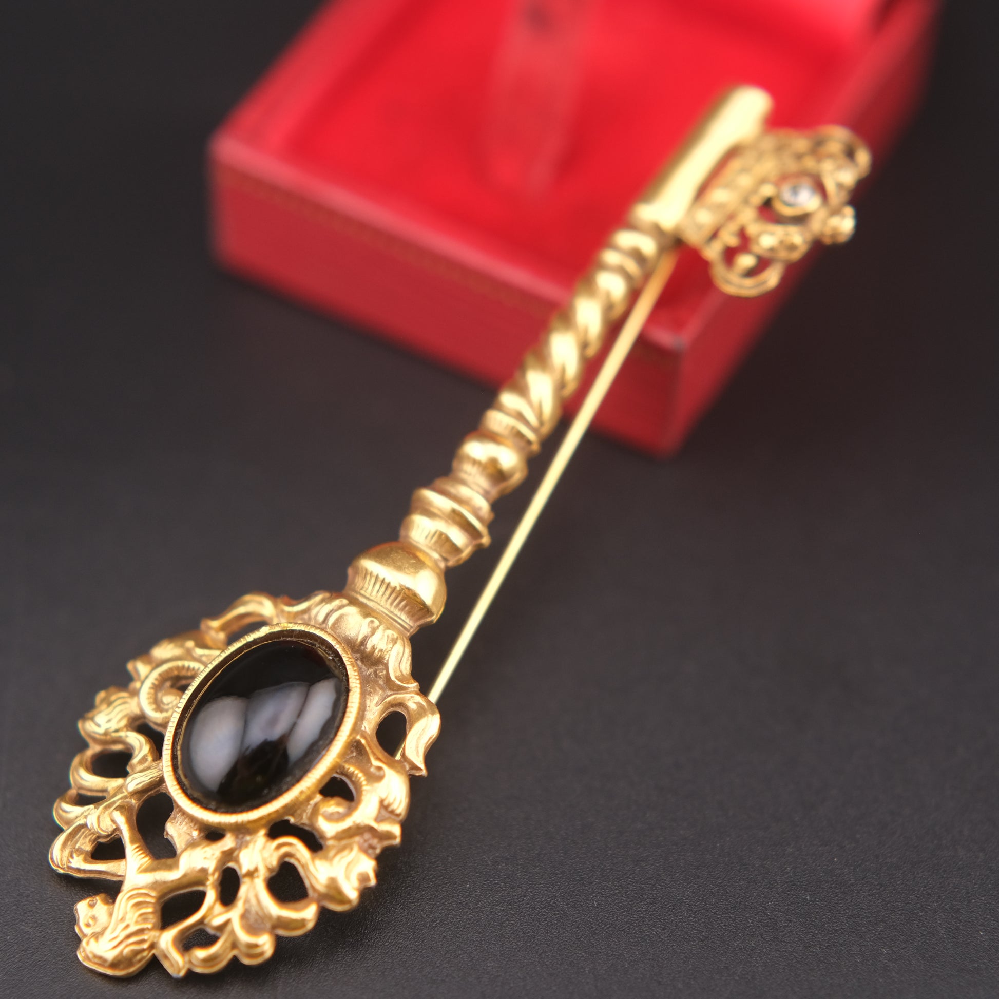 Unlock timeless elegance with this statement vintage brooch in the form of a regal key. Crafted in rich gold-tone metal, the brooch features a twisted shaft, crown-shaped key bow, and an ornate openwork head adorned with a glossy black oval cabochon at its center. The crown is embellished with a small clear rhinestone, adding a touch of royal sparkle.