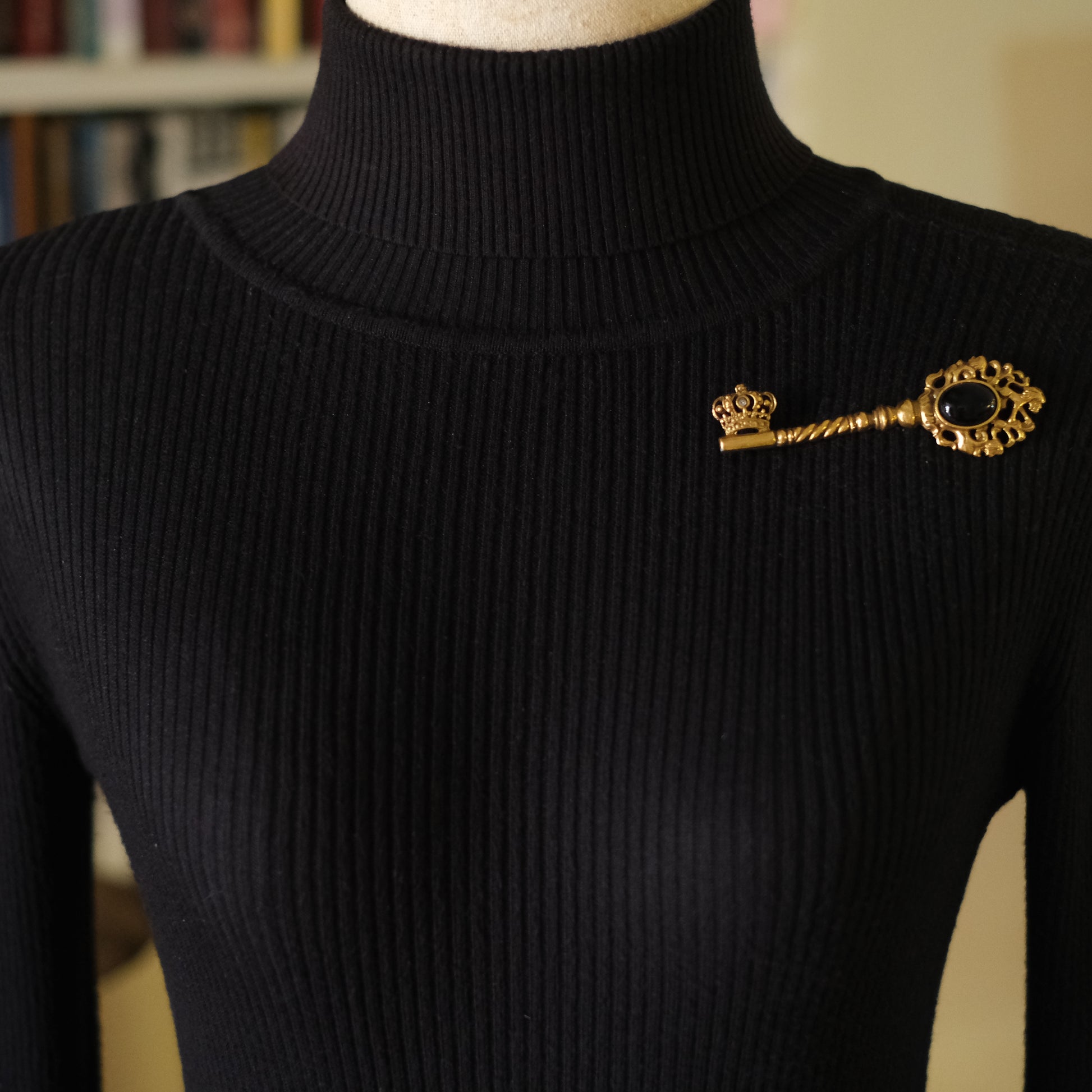 Vintage Gold-Tone Key Brooch with Black Cabochon and Crown Detail
