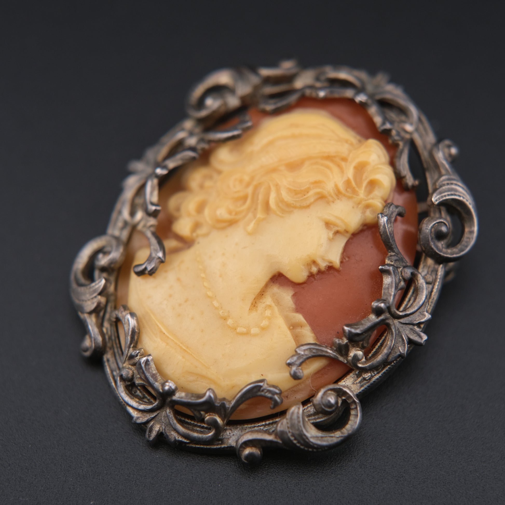 Vintage Hand-Carved Cameo Brooch & Pendant in Ornate Silver-Tone Frame – Signed & Engraved