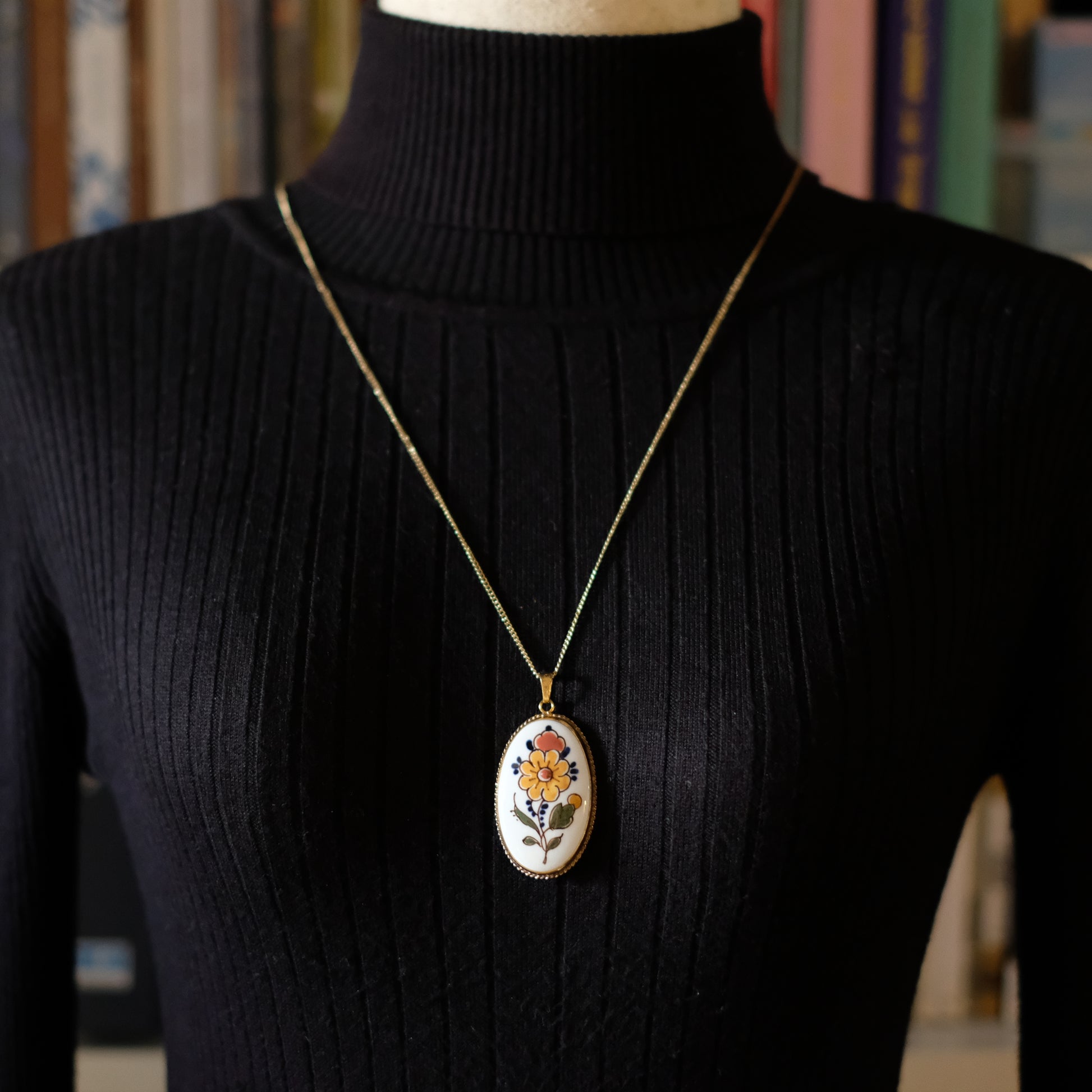 This charming vintage pendant necklace showcases the artistry of Delft porcelain, hand-painted with a vibrant floral motif. The oval porcelain plaque features a cheerful yellow flower with coral, green, and navy accents, set against a crisp white background. The piece is framed in a gold-tone bezel with a delicate rope-edge design, giving it an elegant vintage touch.