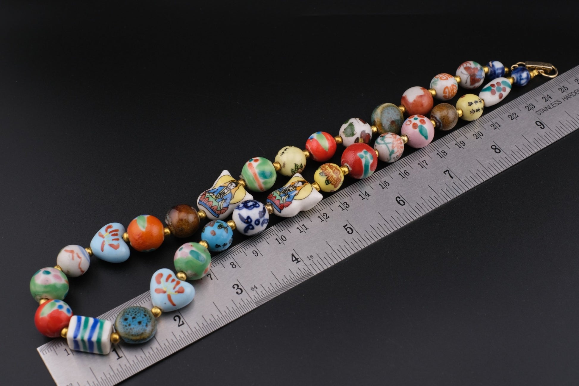 - Material: Hand-painted porcelain beads, gold-tone spacer beads