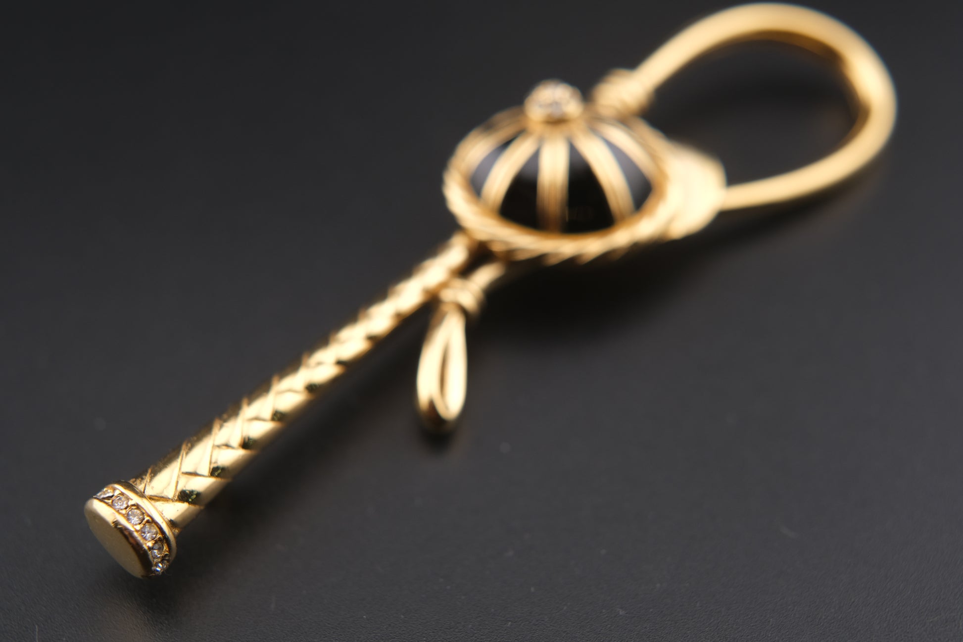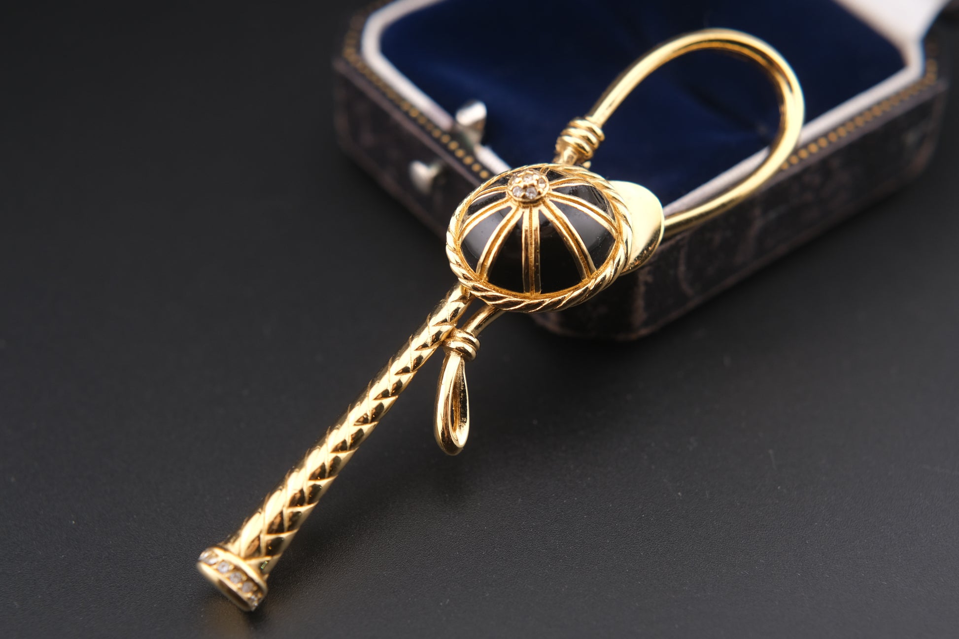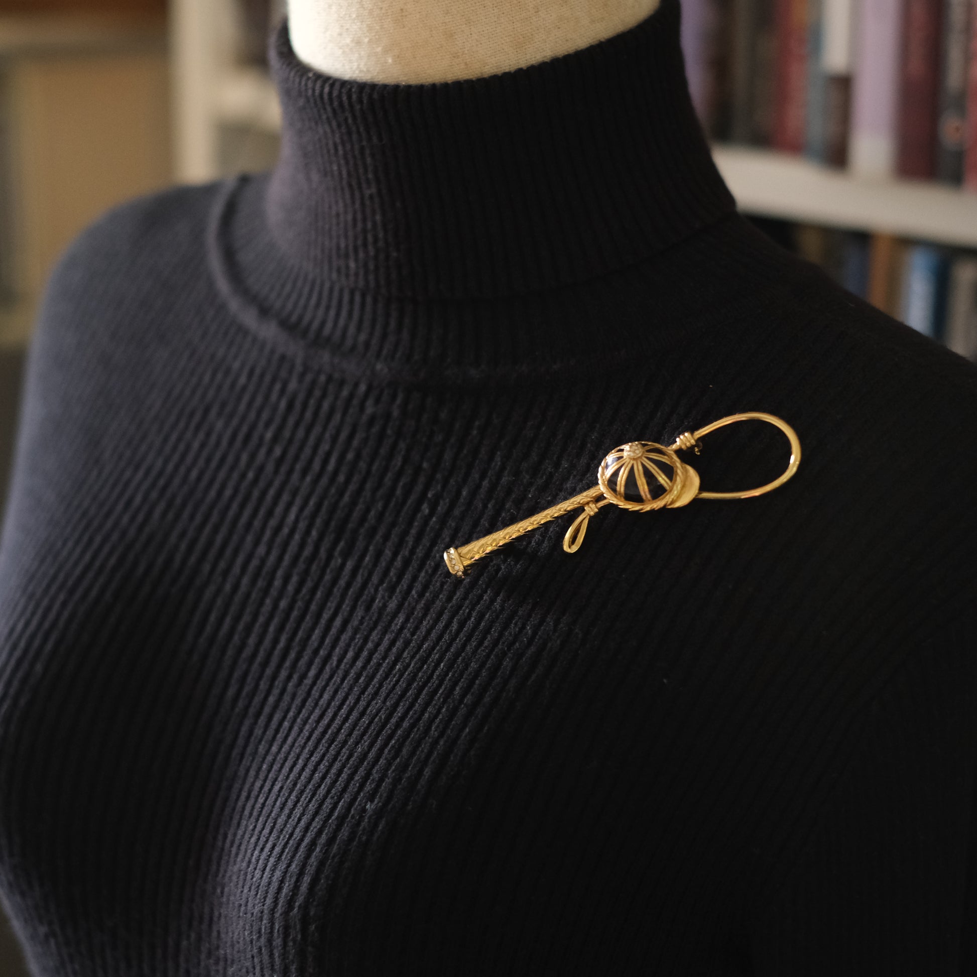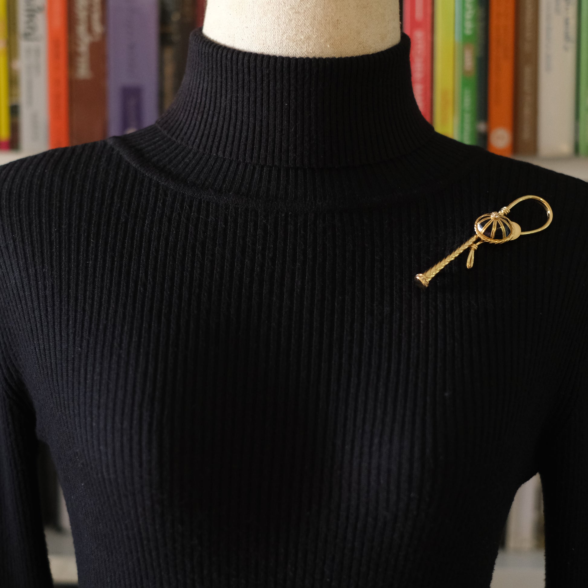 Celebrate equestrian elegance with this striking vintage brooch by Henkel & Grossé, renowned German makers known for their craftsmanship and long-time collaboration with Dior. Designed in the shape of a jockey cap paired with a detailed horse whip handle, this rare piece perfectly captures the spirit of equestrian style. The jockey cap features a glossy black enamel dome encased in a golden cage, topped with sparkling clear crystals, while the whip is finished with a textured braided design and crystal accents at the end. A sophisticated accessory that embodies refinement and charm, ideal for collectors and horse-riding enthusiasts alike.