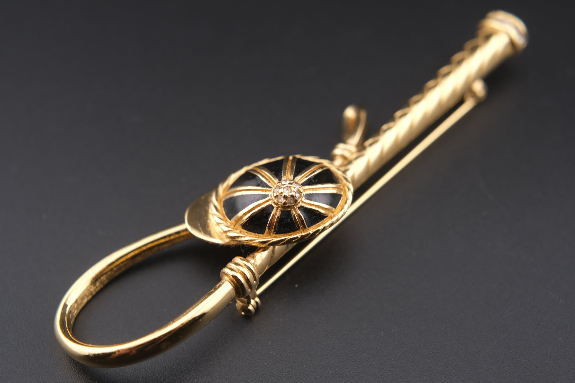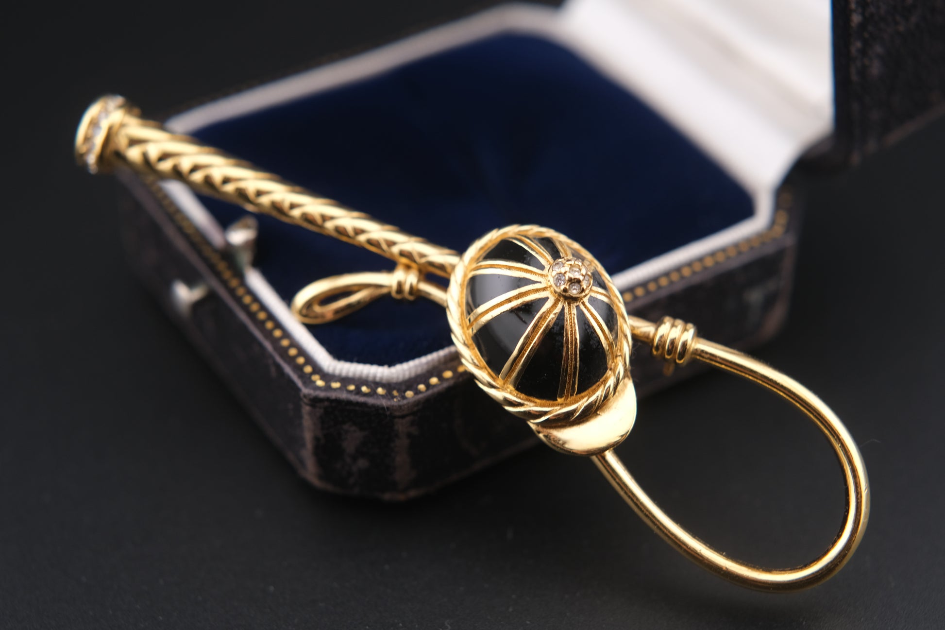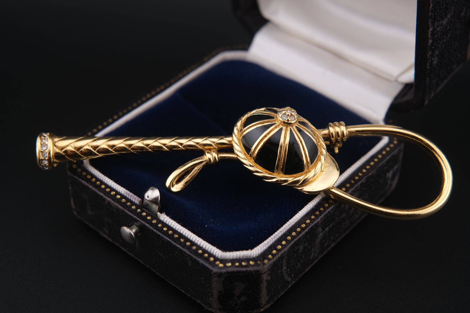 - Design: Equestrian-themed brooch featuring a jockey cap with domed enamel and crystal detail, paired with a braided horse whip handle set with crystals