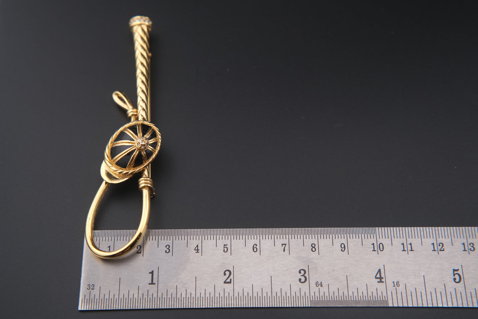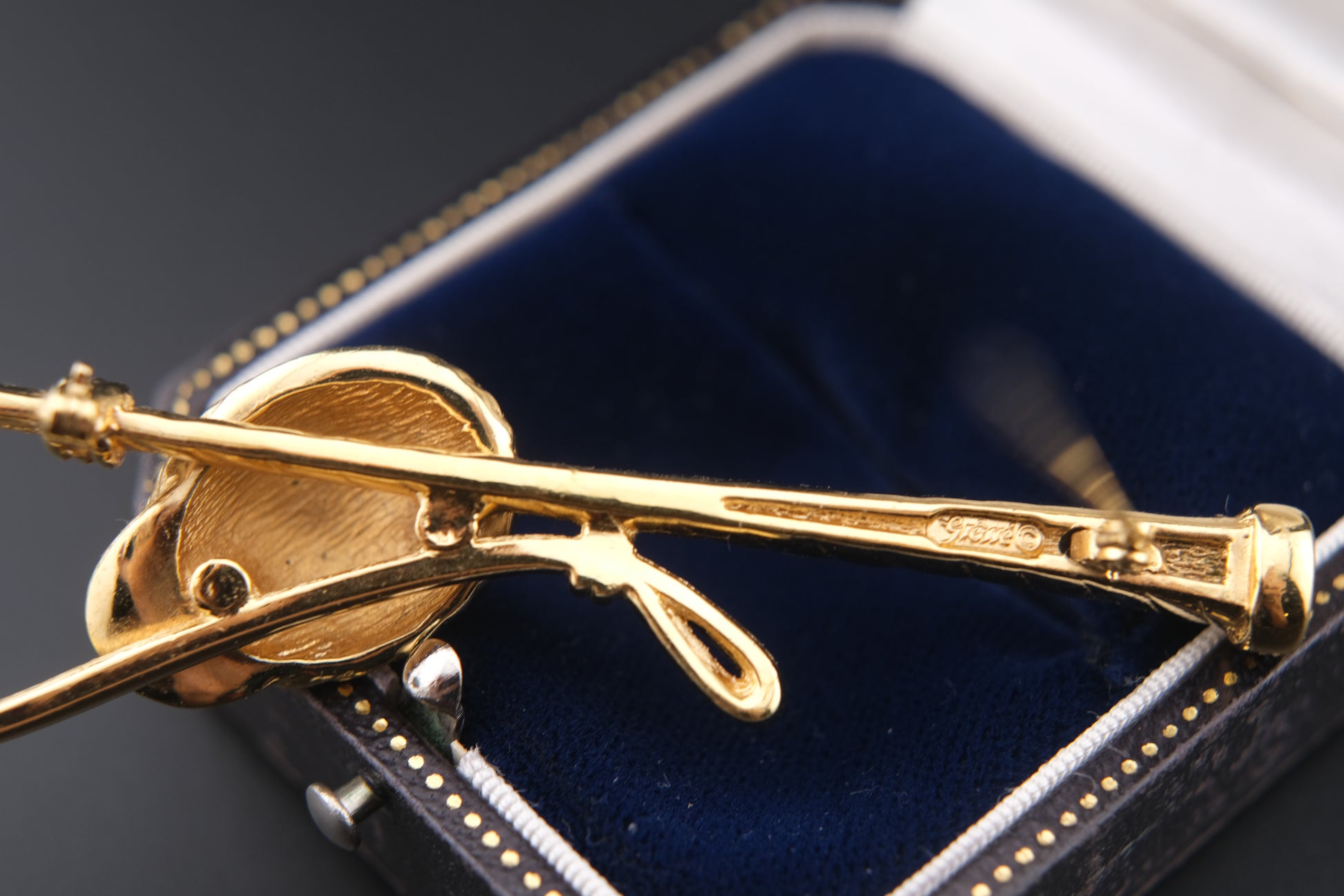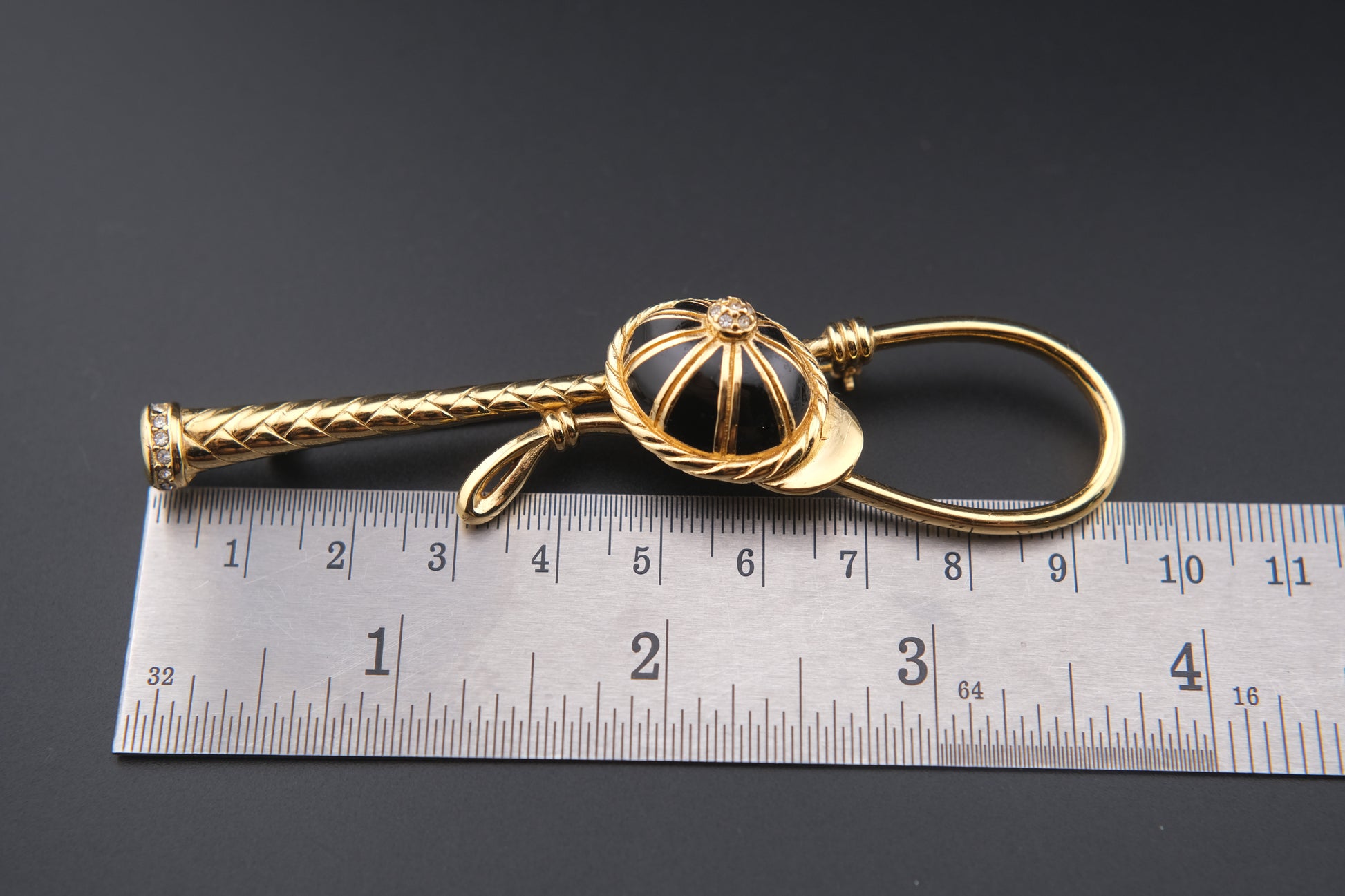 - Design: Equestrian-themed brooch featuring a jockey cap with domed enamel and crystal detail, paired with a braided horse whip handle set with crystals