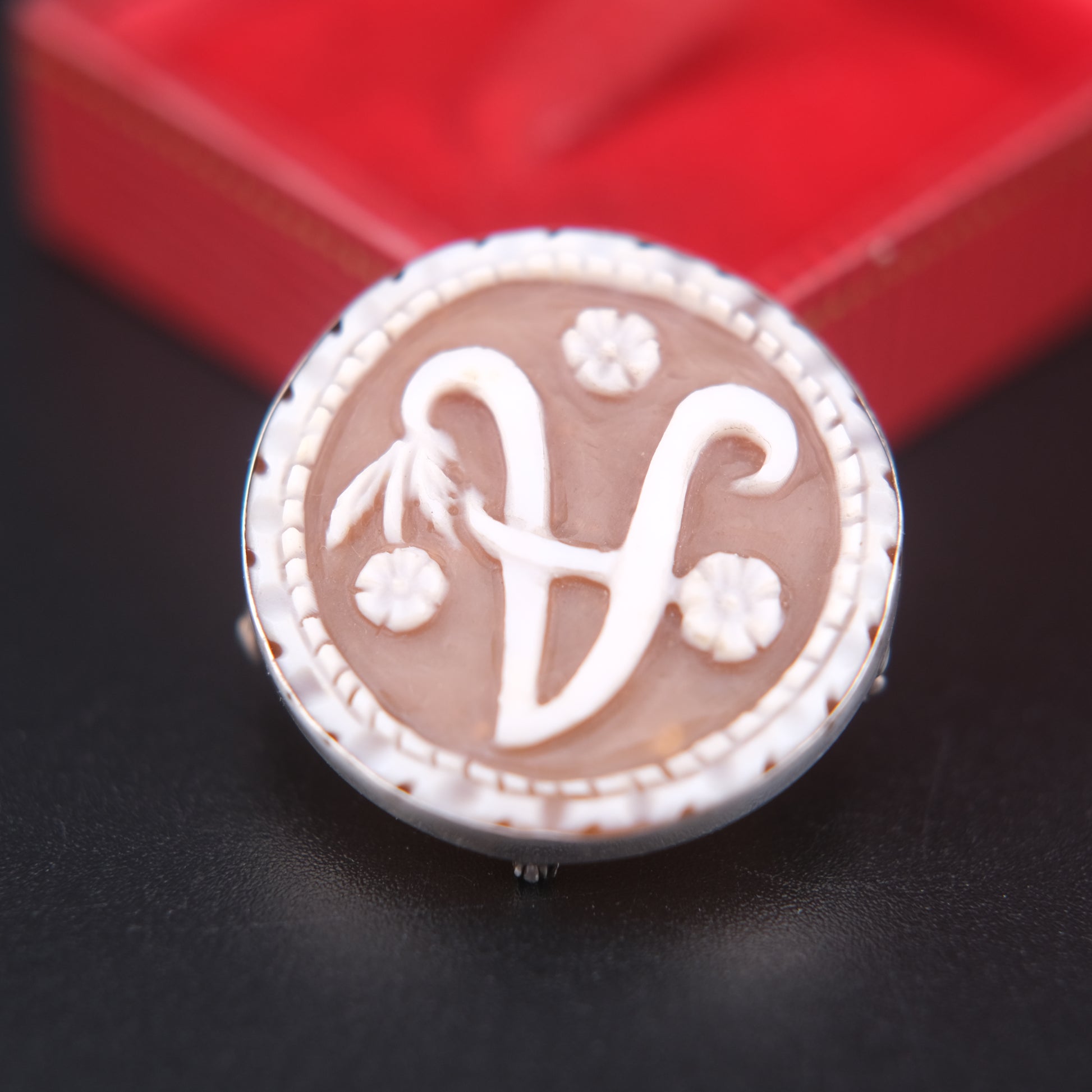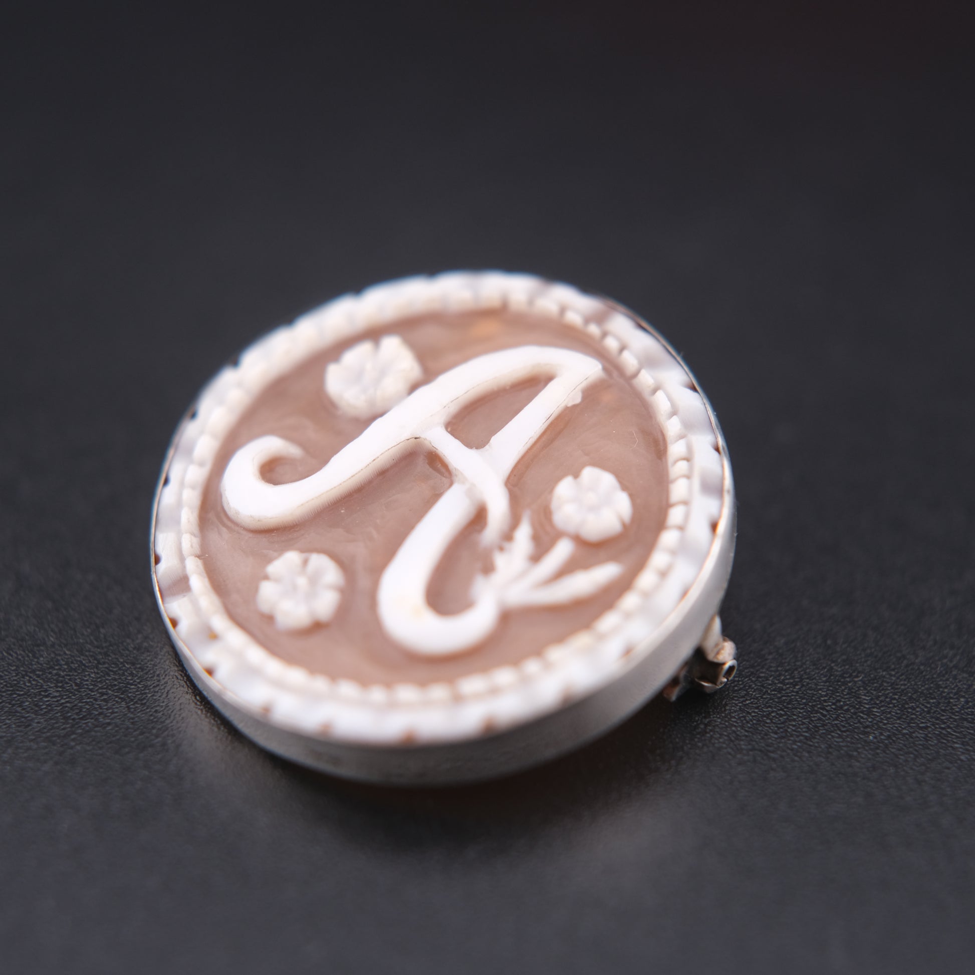 This beautifully hand-carved shell cameo features a bold monogram “A” framed by delicate floral motifs. Set in a sterling silver 925 frame, the piece is designed with a dual-use mount, allowing it to be worn both as a pendant and as a brooch.