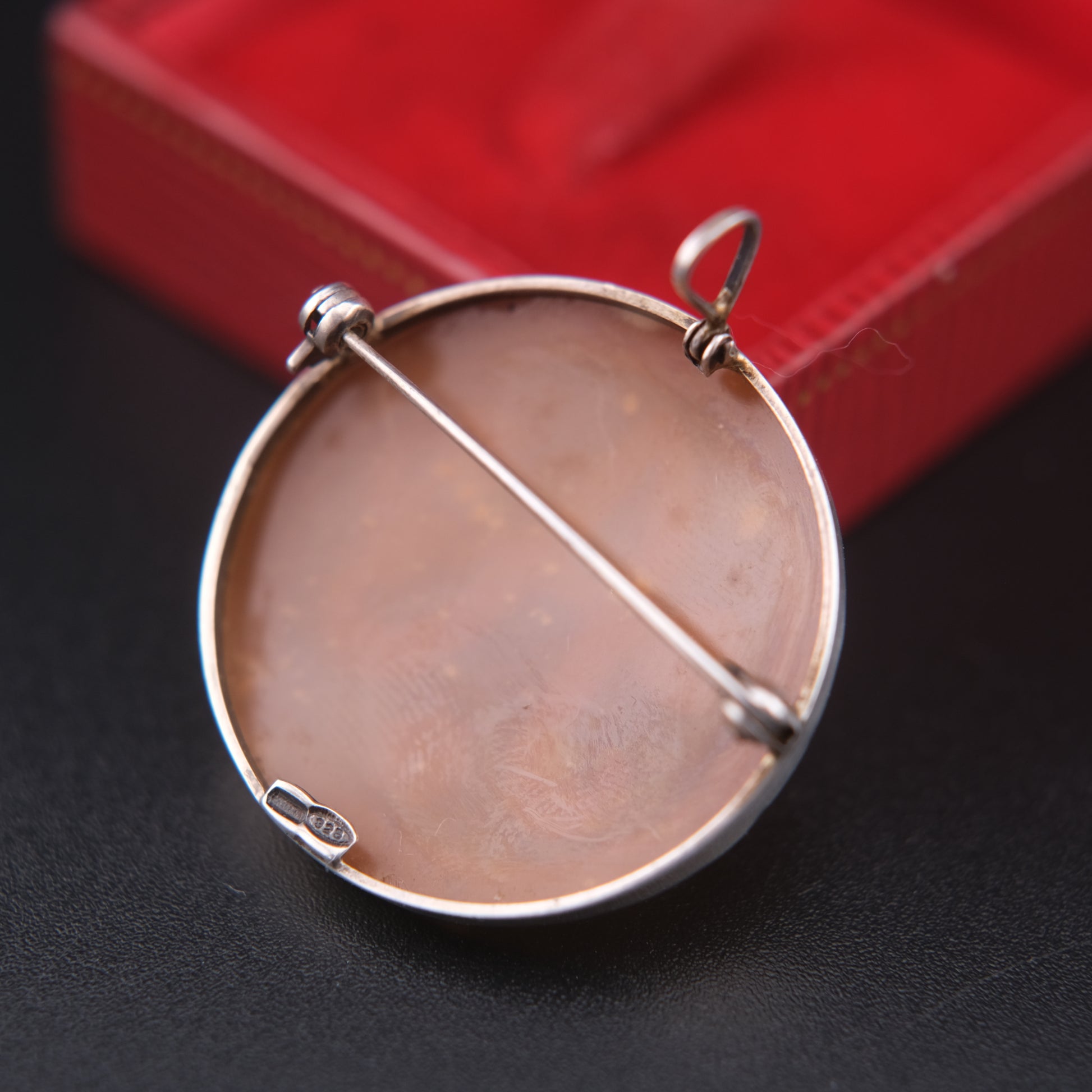 - Closure: Hinged pin for brooch, bail for pendant