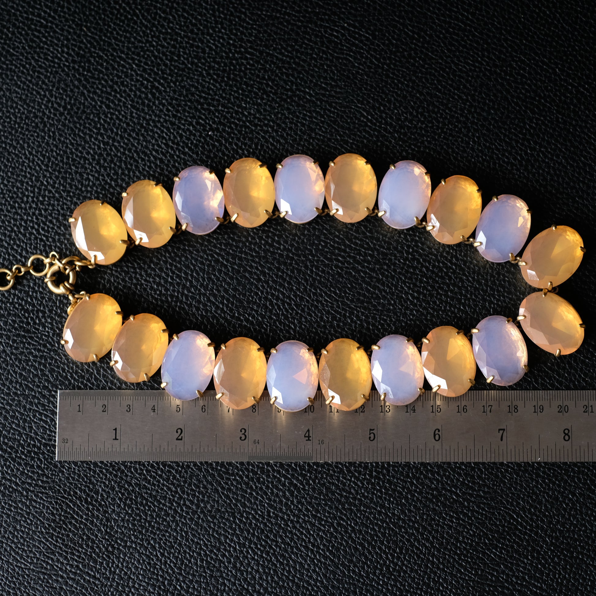 Elevate your look with this stunning vintage J.Crew statement necklace, featuring large faceted oval glass stones in a mesmerizing opalescent finish that shifts between soft lavender and golden amber hues under the light. The bold design is set in a warm gold-tone frame, making it a perfect accessory for both evening wear and modern chic styling.