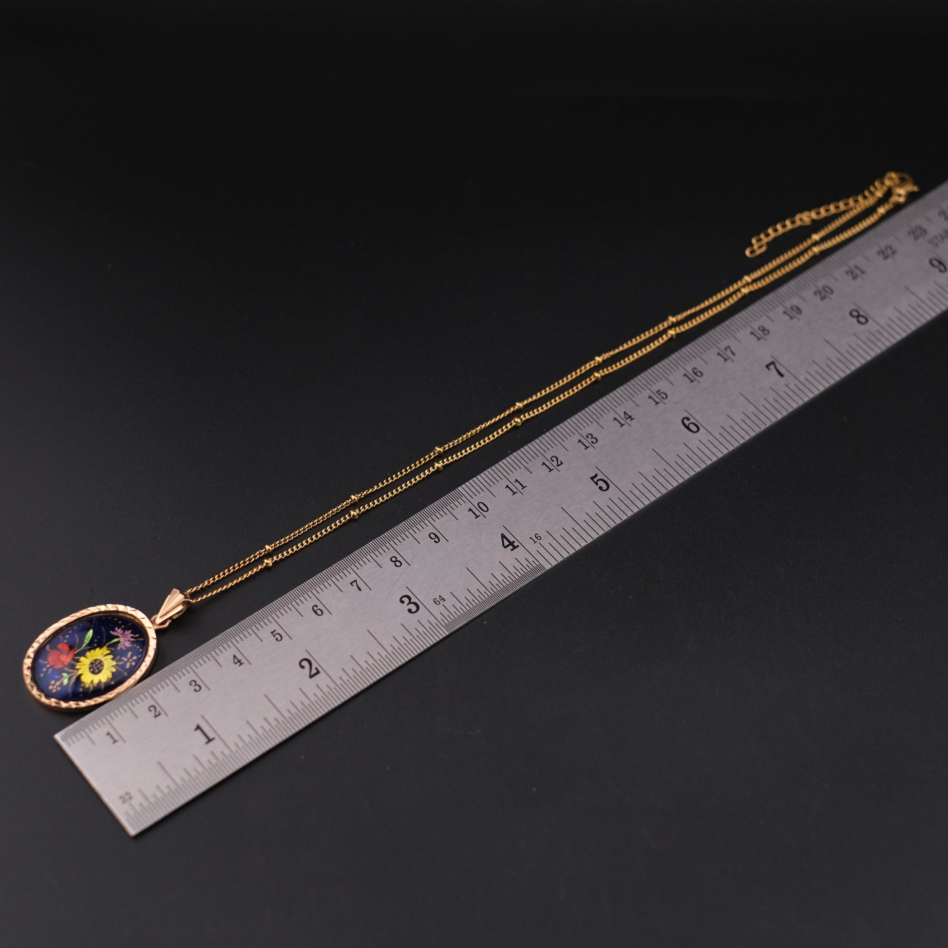 - Design: Oval pendant with sunflower, poppy, and wildflower motif on cobalt blue background