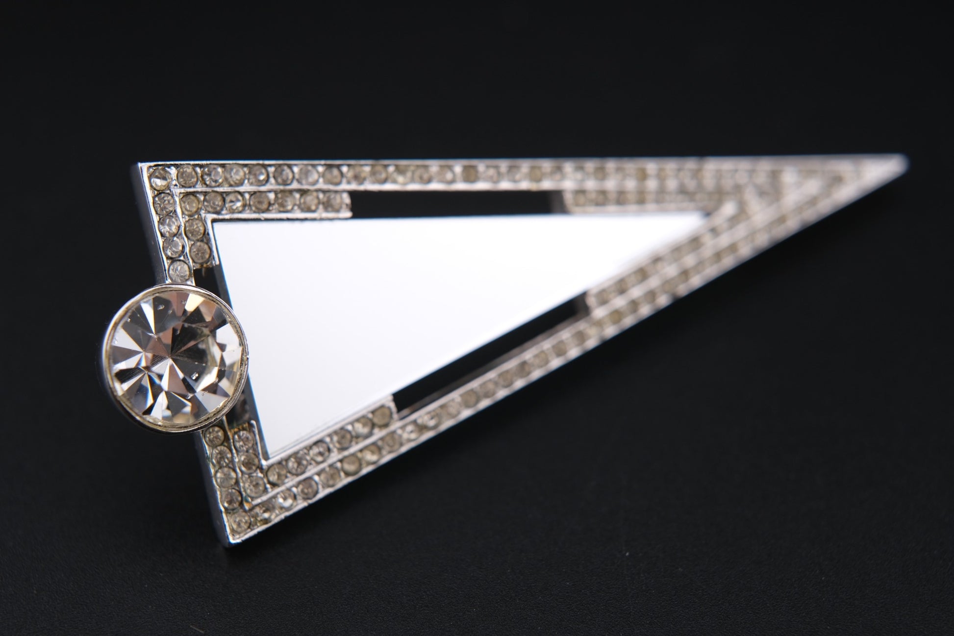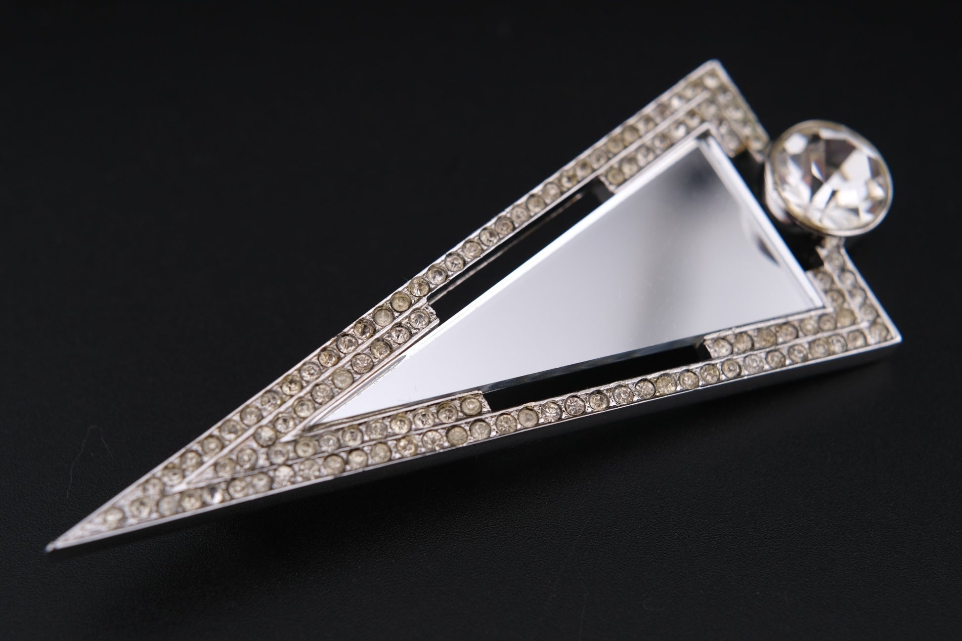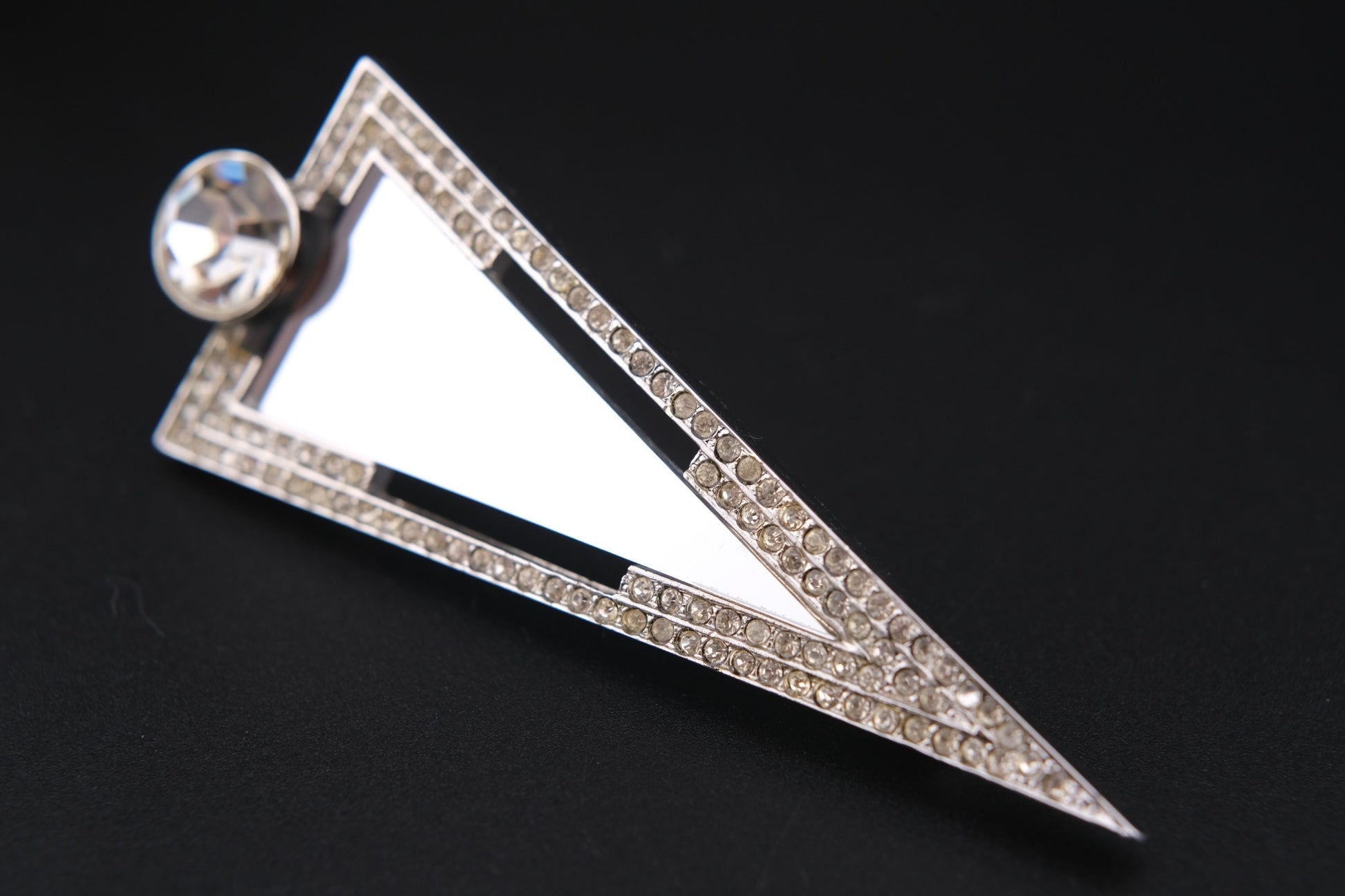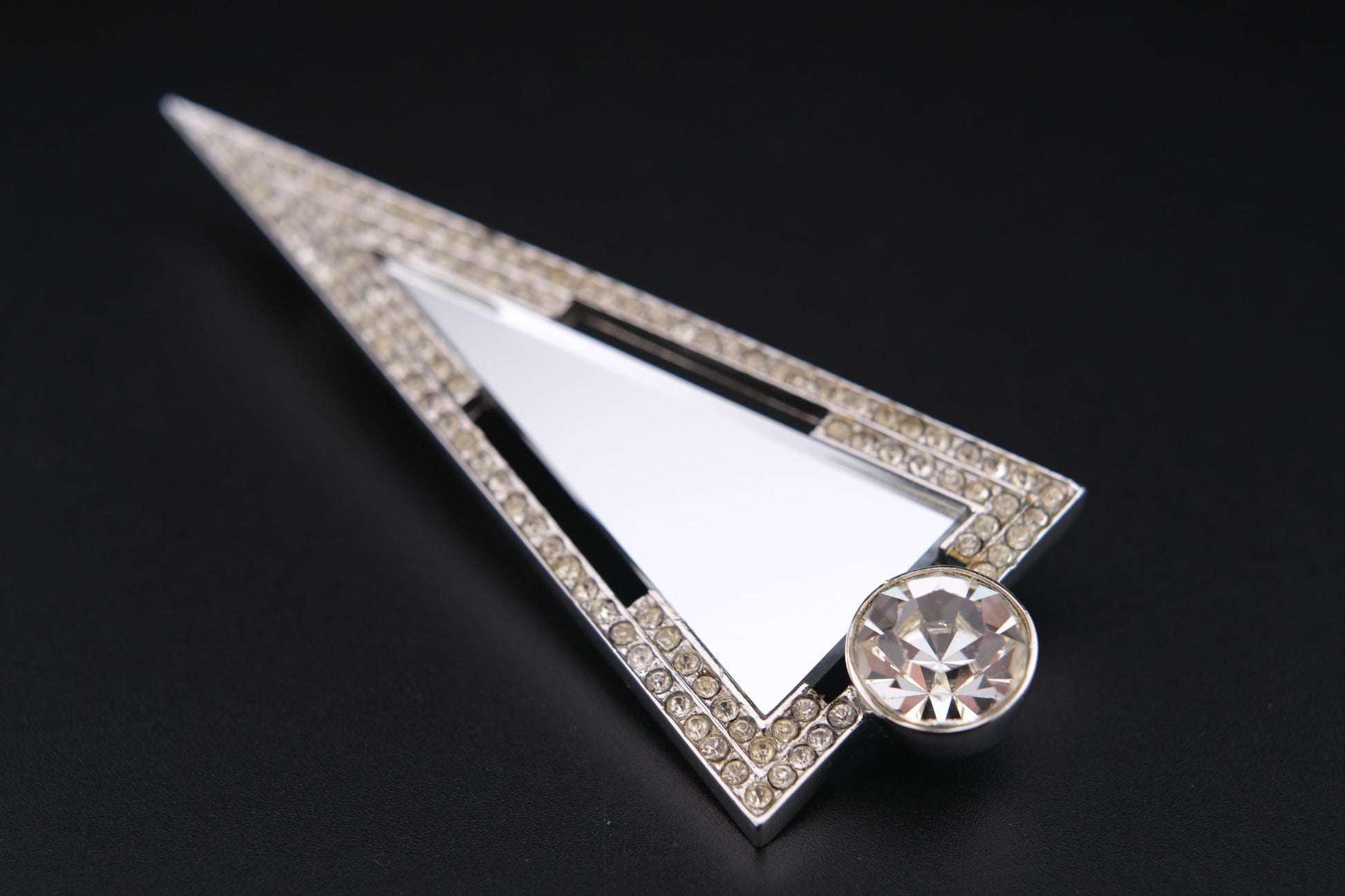 Elevate your collection with this striking Jean Louis Scherrer vintage brooch, a bold statement piece that perfectly captures the designer’s avant-garde aesthetic. Crafted in a sleek triangular form, the brooch features a mirror-like center framed with sparkling clear rhinestones, finished with a large round crystal accent at the top. Its sharp geometric design embodies the modernist style of Parisian couture jewelry, making it both wearable art and a collectible treasure.