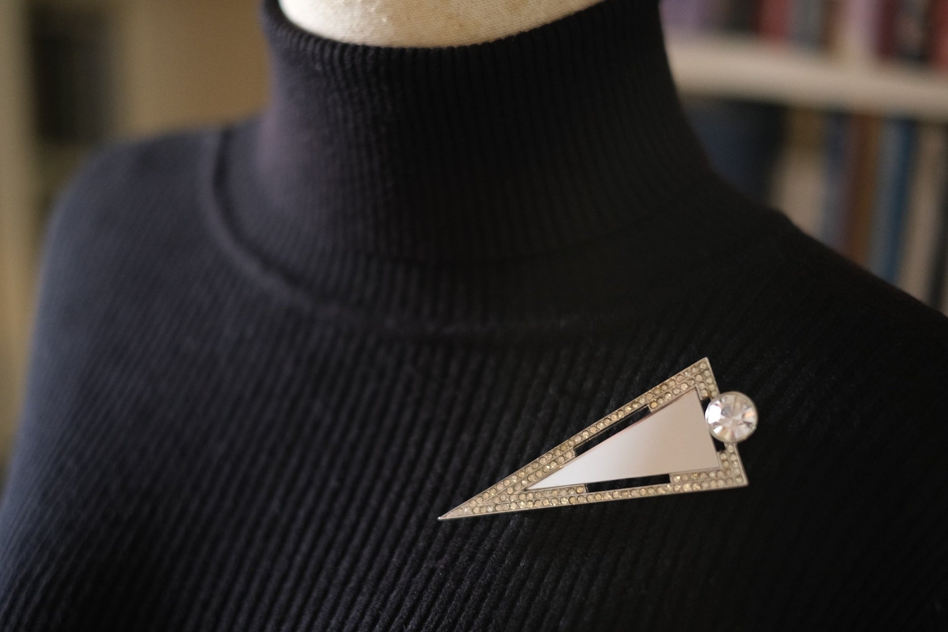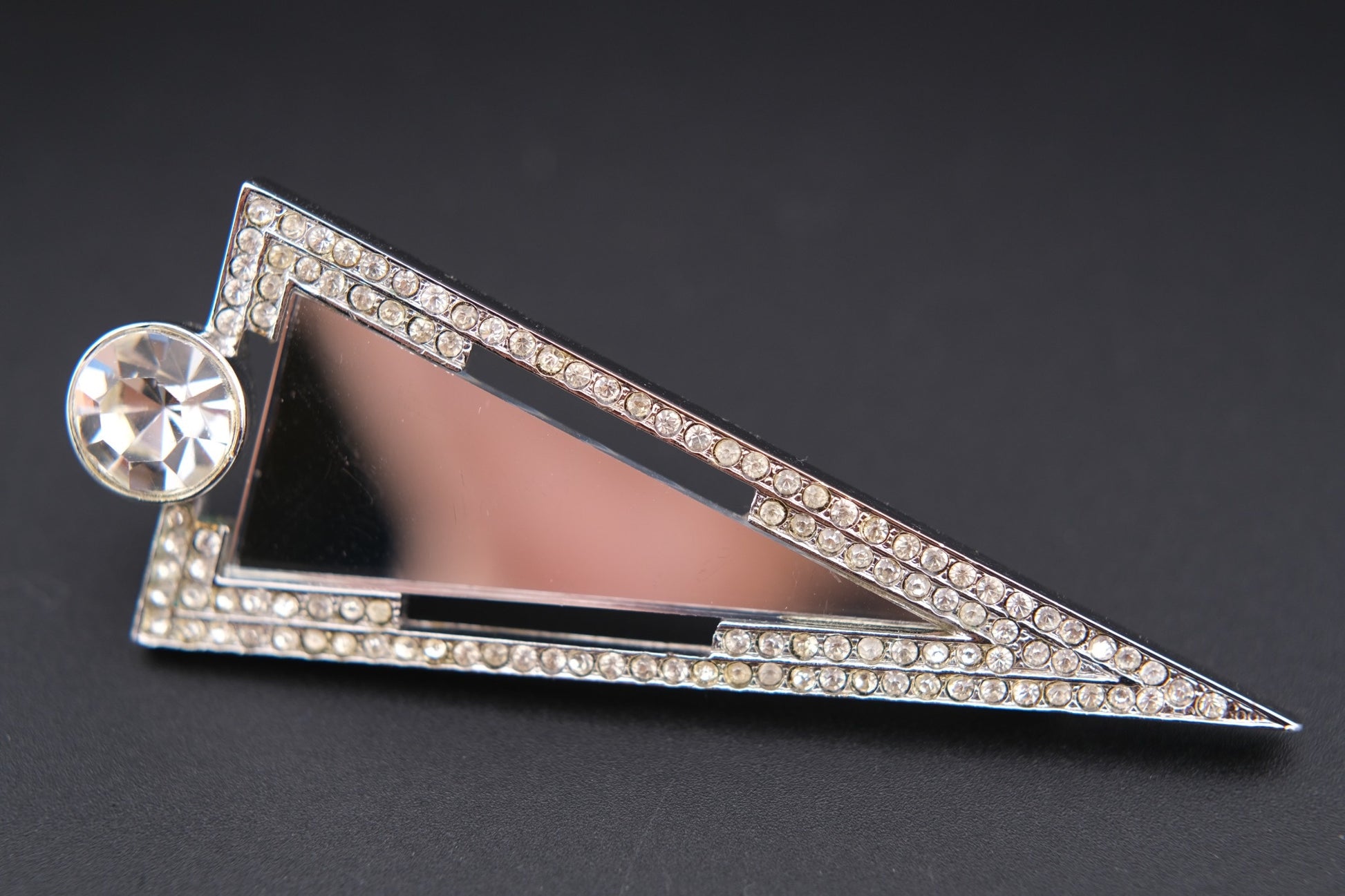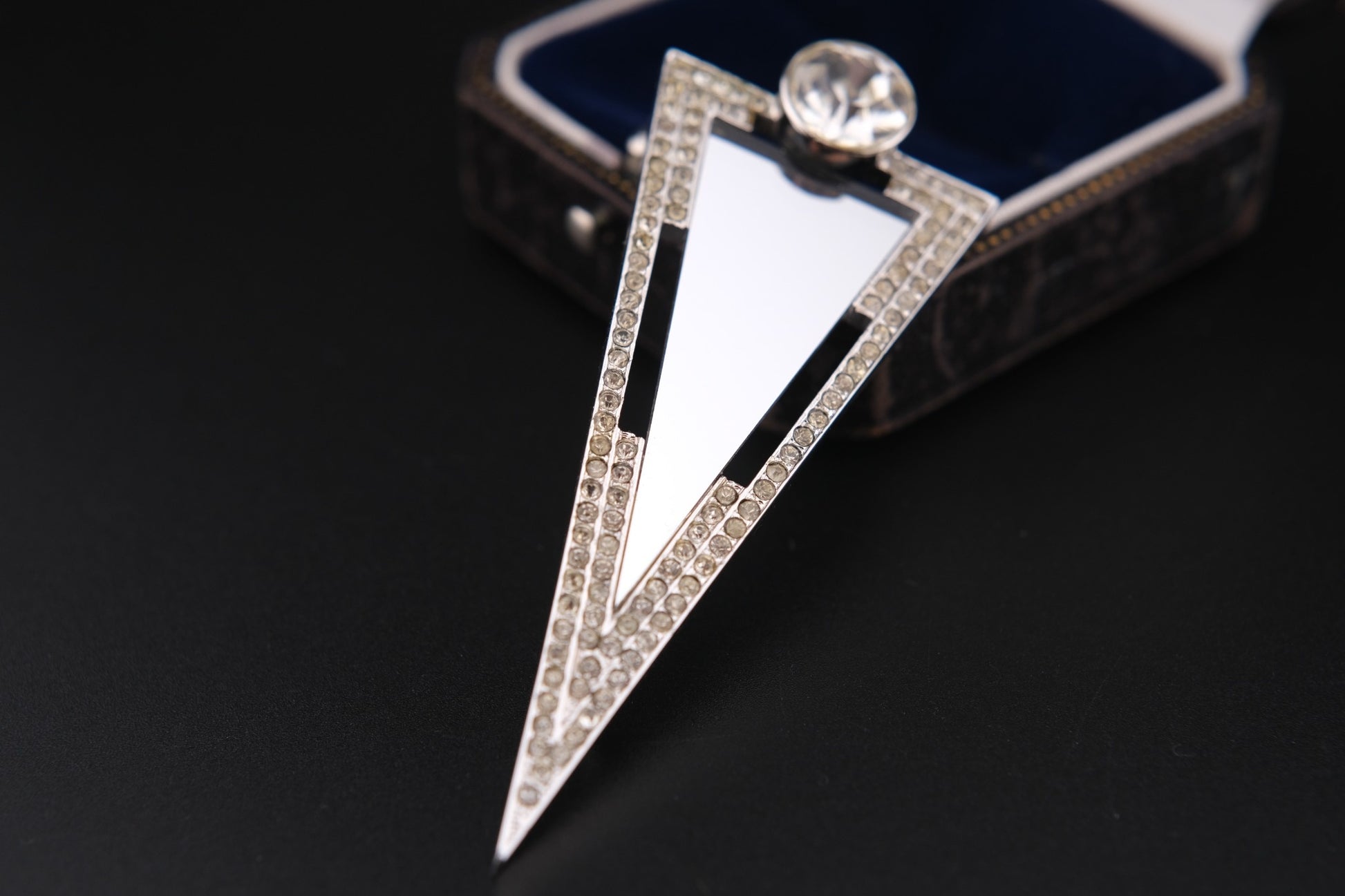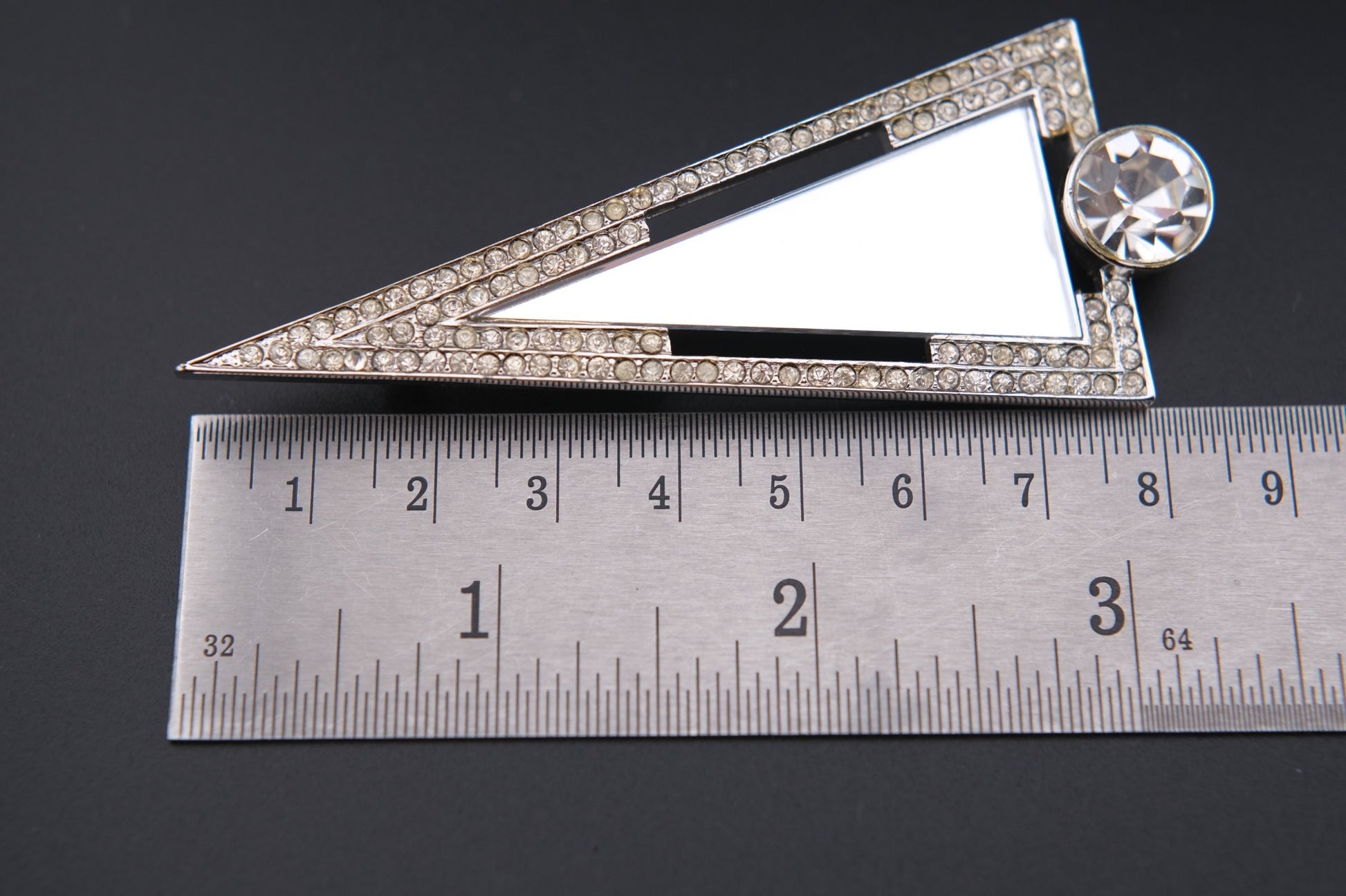 Elevate your collection with this striking Jean Louis Scherrer vintage brooch, a bold statement piece that perfectly captures the designer’s avant-garde aesthetic. Crafted in a sleek triangular form, the brooch features a mirror-like center framed with sparkling clear rhinestones, finished with a large round crystal accent at the top. Its sharp geometric design embodies the modernist style of Parisian couture jewelry, making it both wearable art and a collectible treasure.