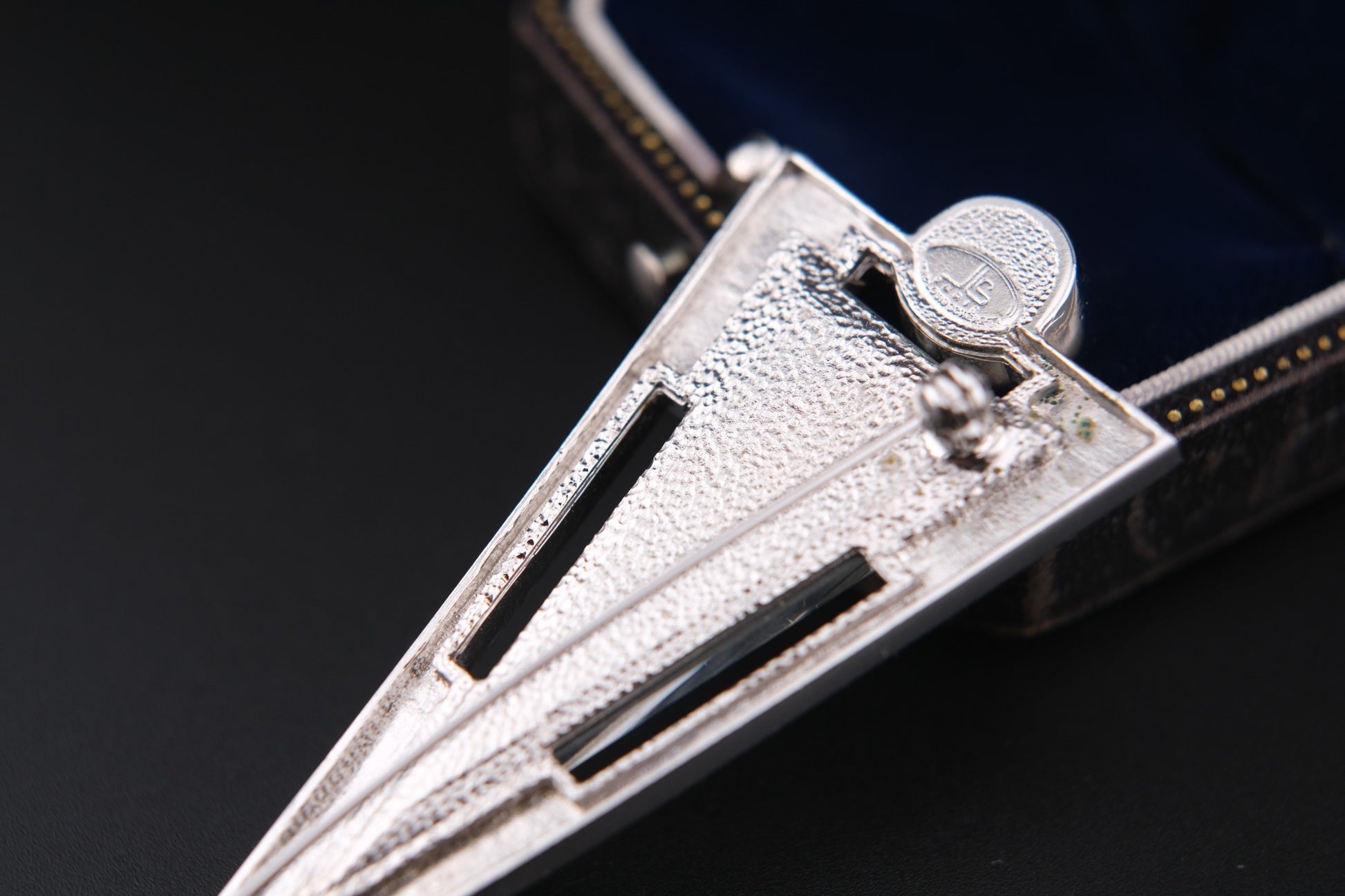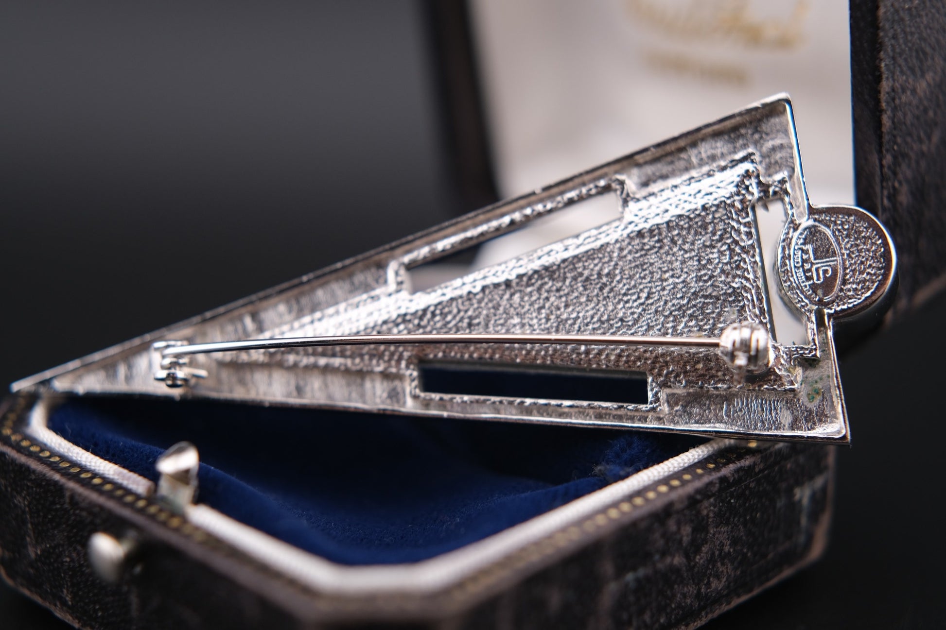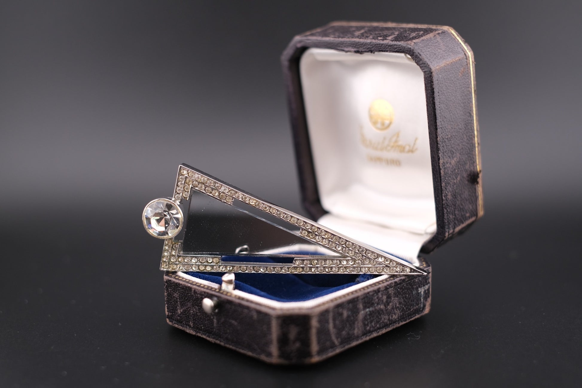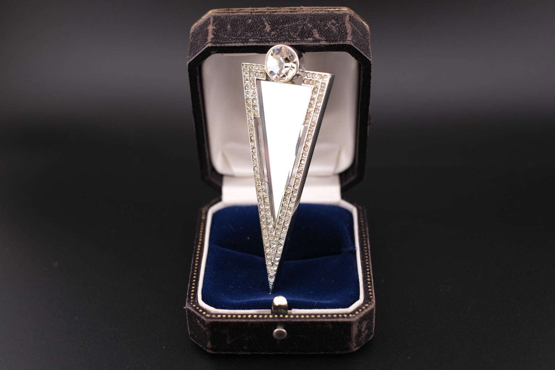 Elevate your collection with this striking Jean Louis Scherrer vintage brooch, a bold statement piece that perfectly captures the designer’s avant-garde aesthetic. Crafted in a sleek triangular form, the brooch features a mirror-like center framed with sparkling clear rhinestones, finished with a large round crystal accent at the top. Its sharp geometric design embodies the modernist style of Parisian couture jewelry, making it both wearable art and a collectible treasure.