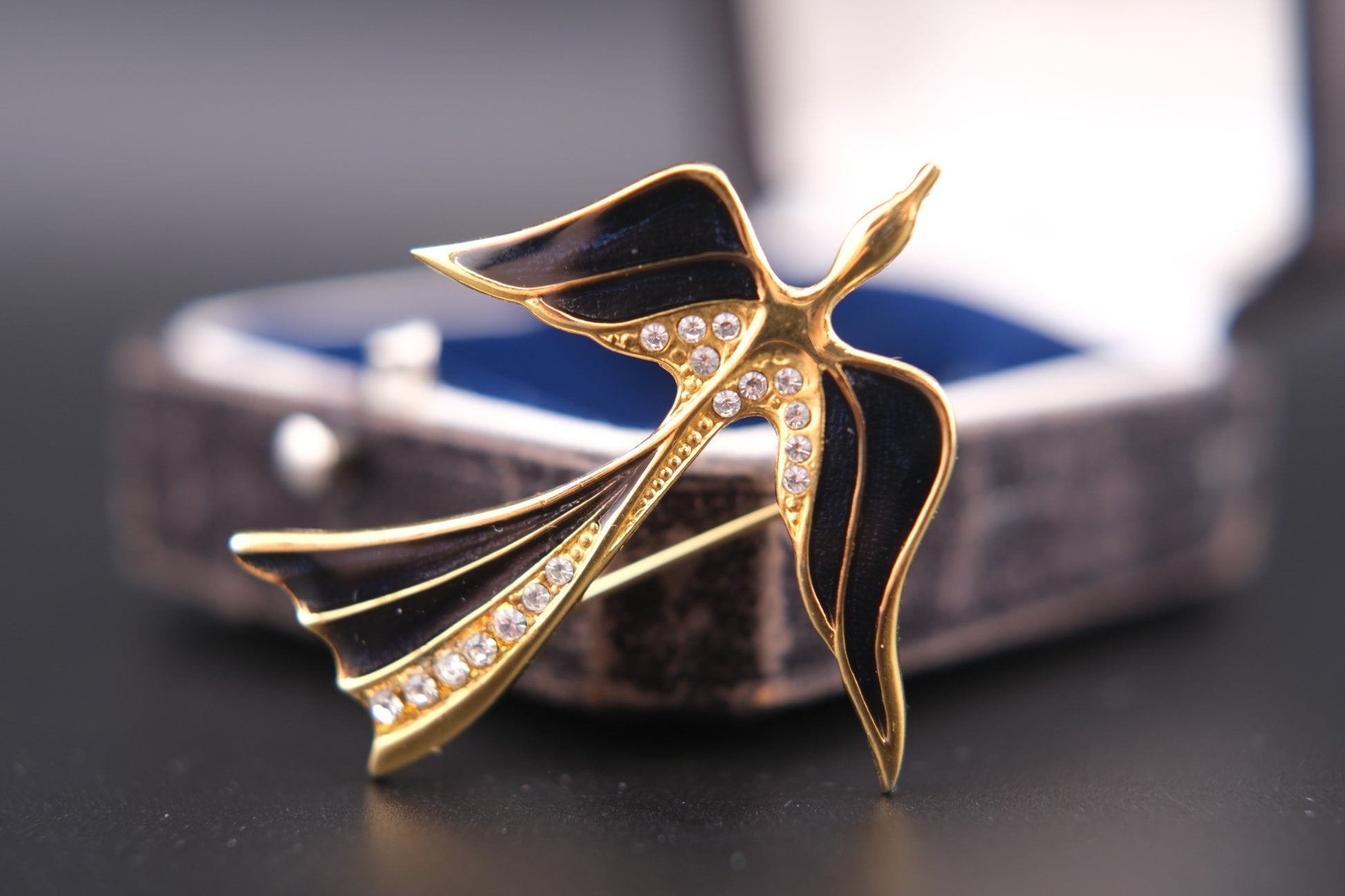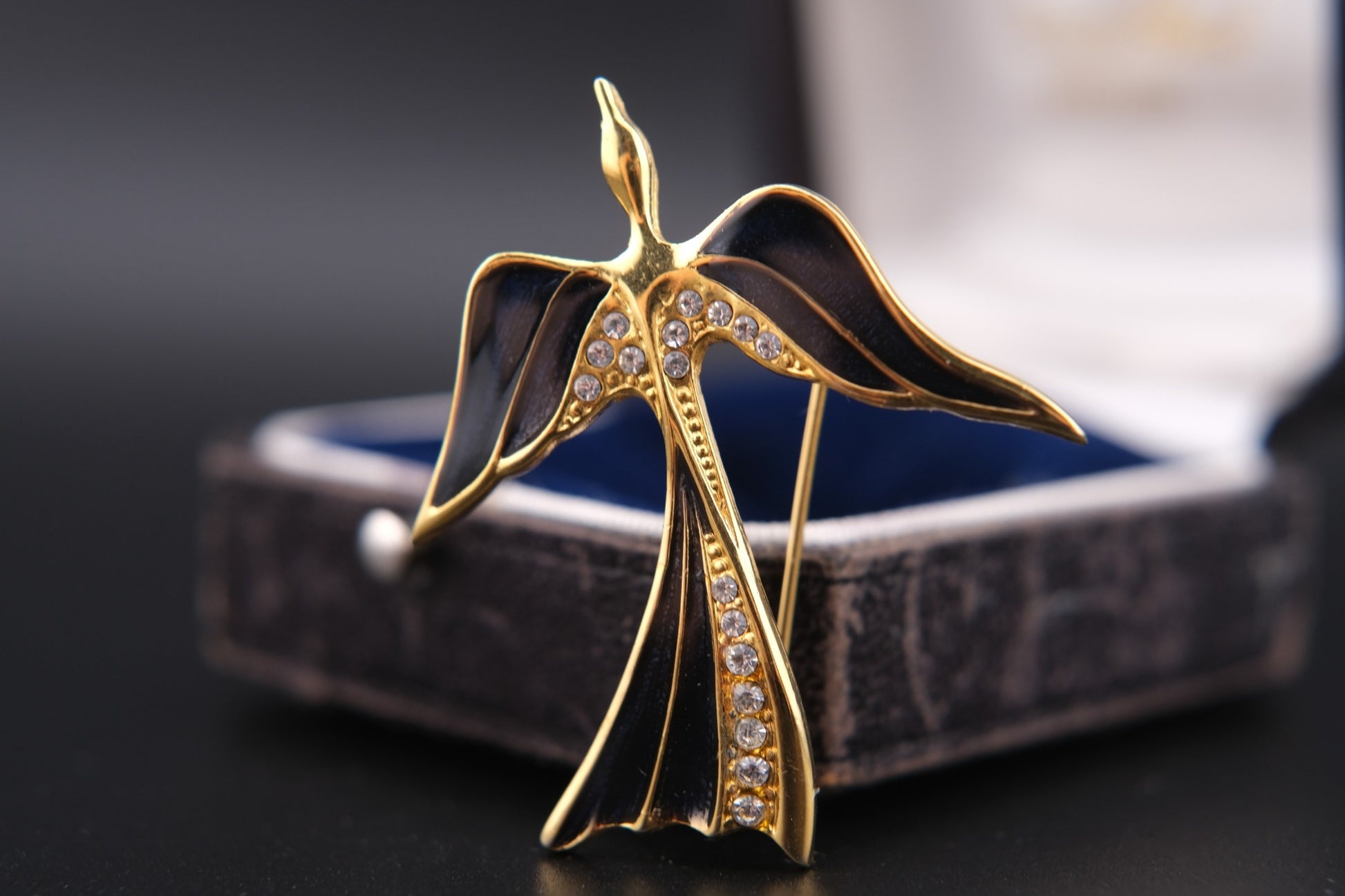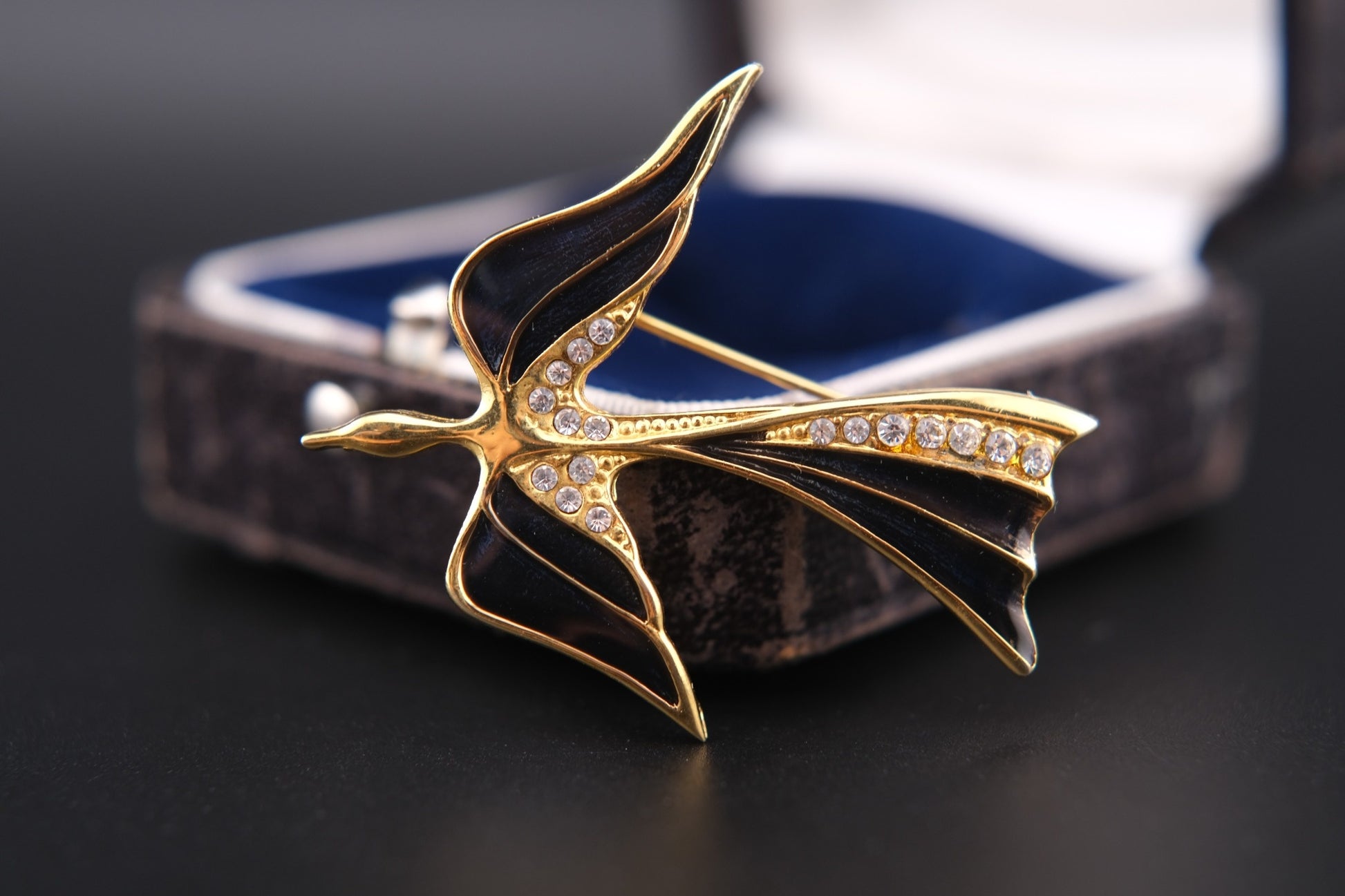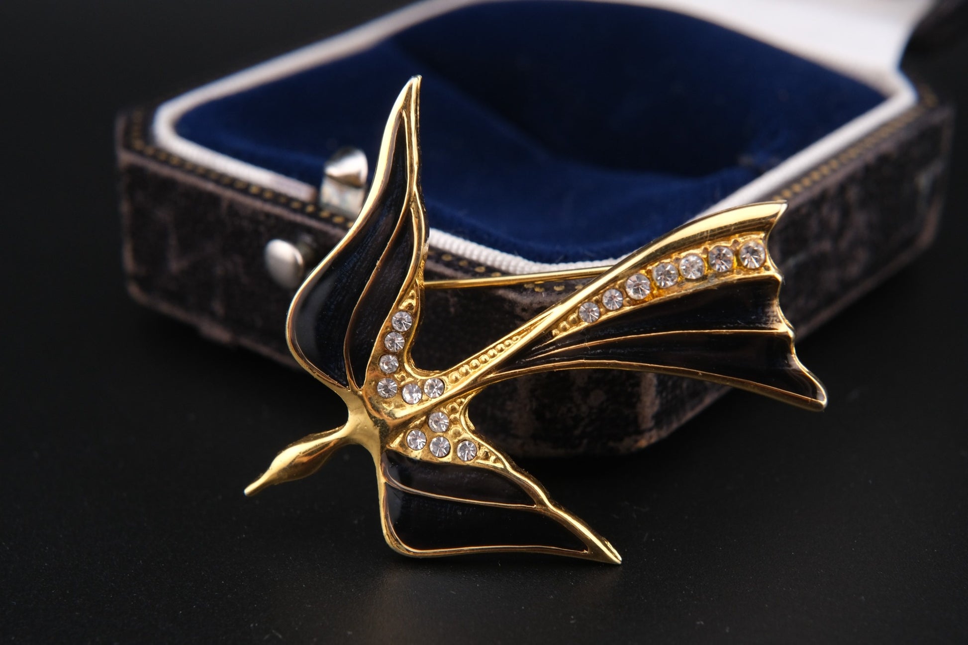 Vintage Karl Lagerfeld Black Enamel & Rhinestone Swallow Brooch – Gold-Tone, Signed