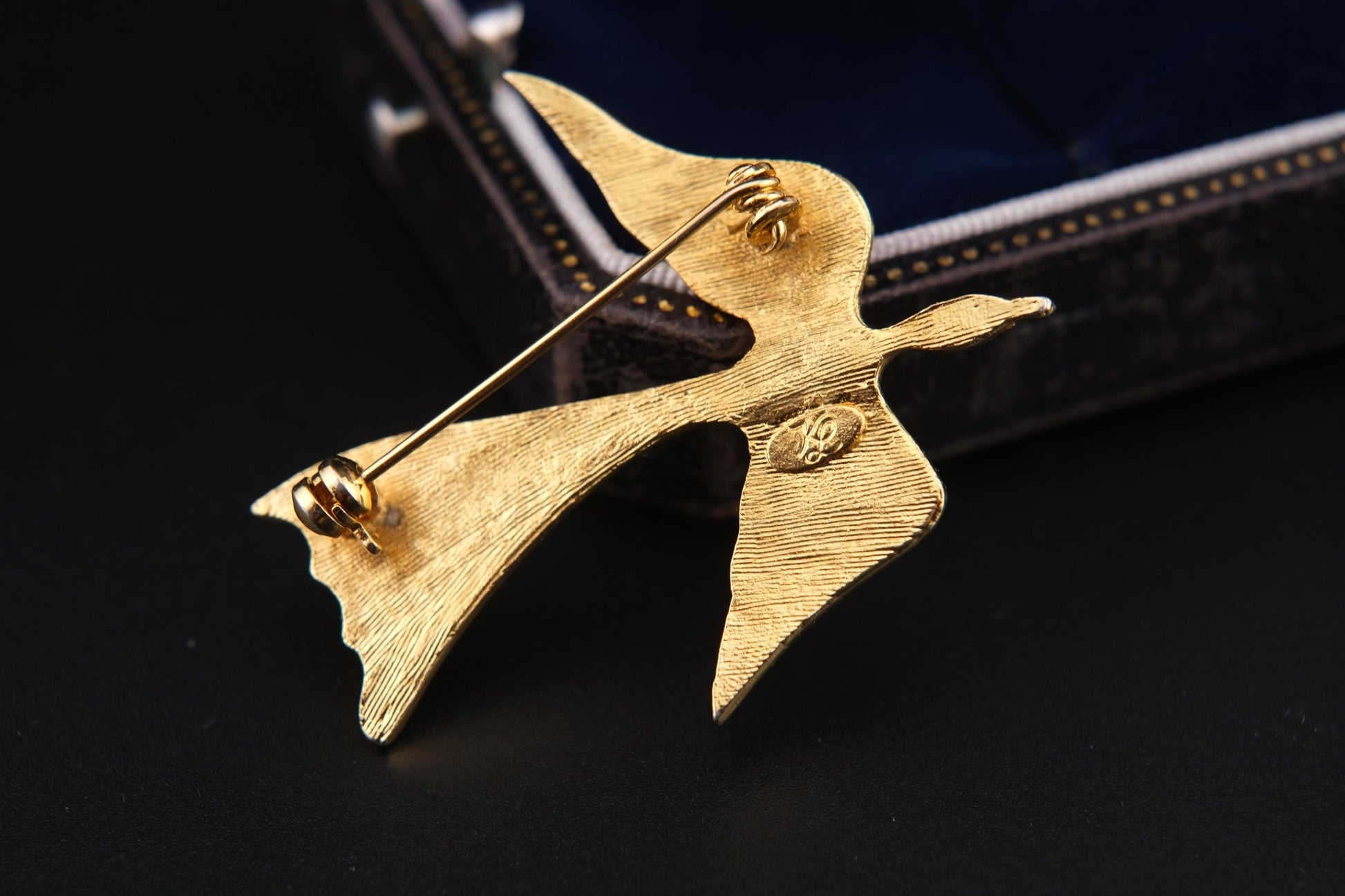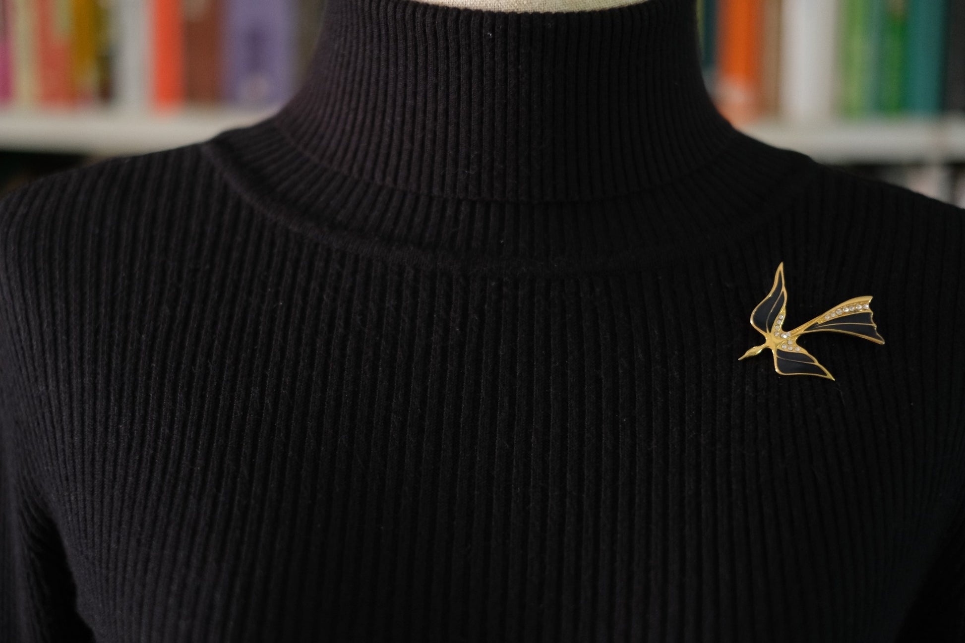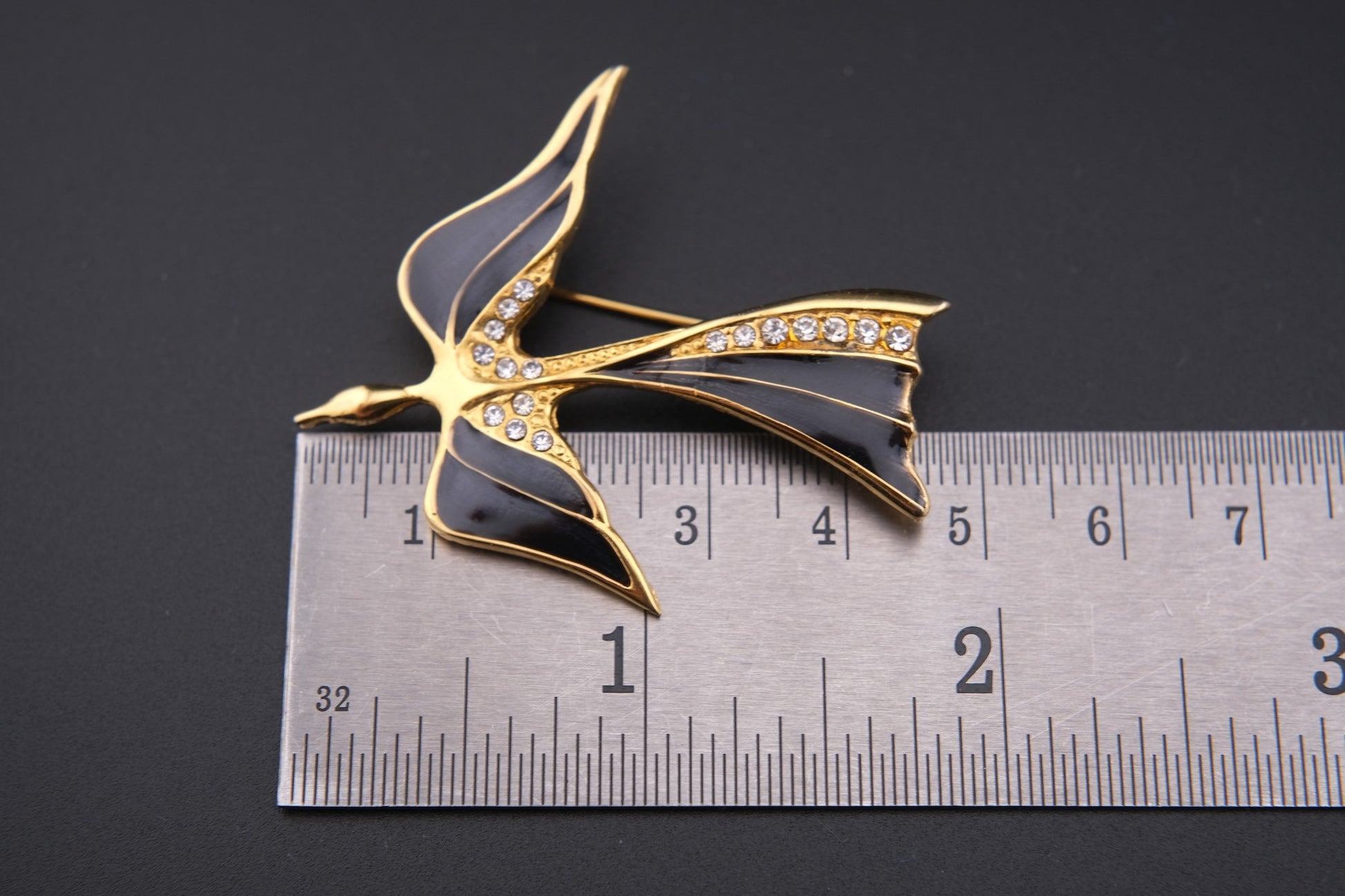- Design: Swallow bird in flight with black enamel and rhinestone accents