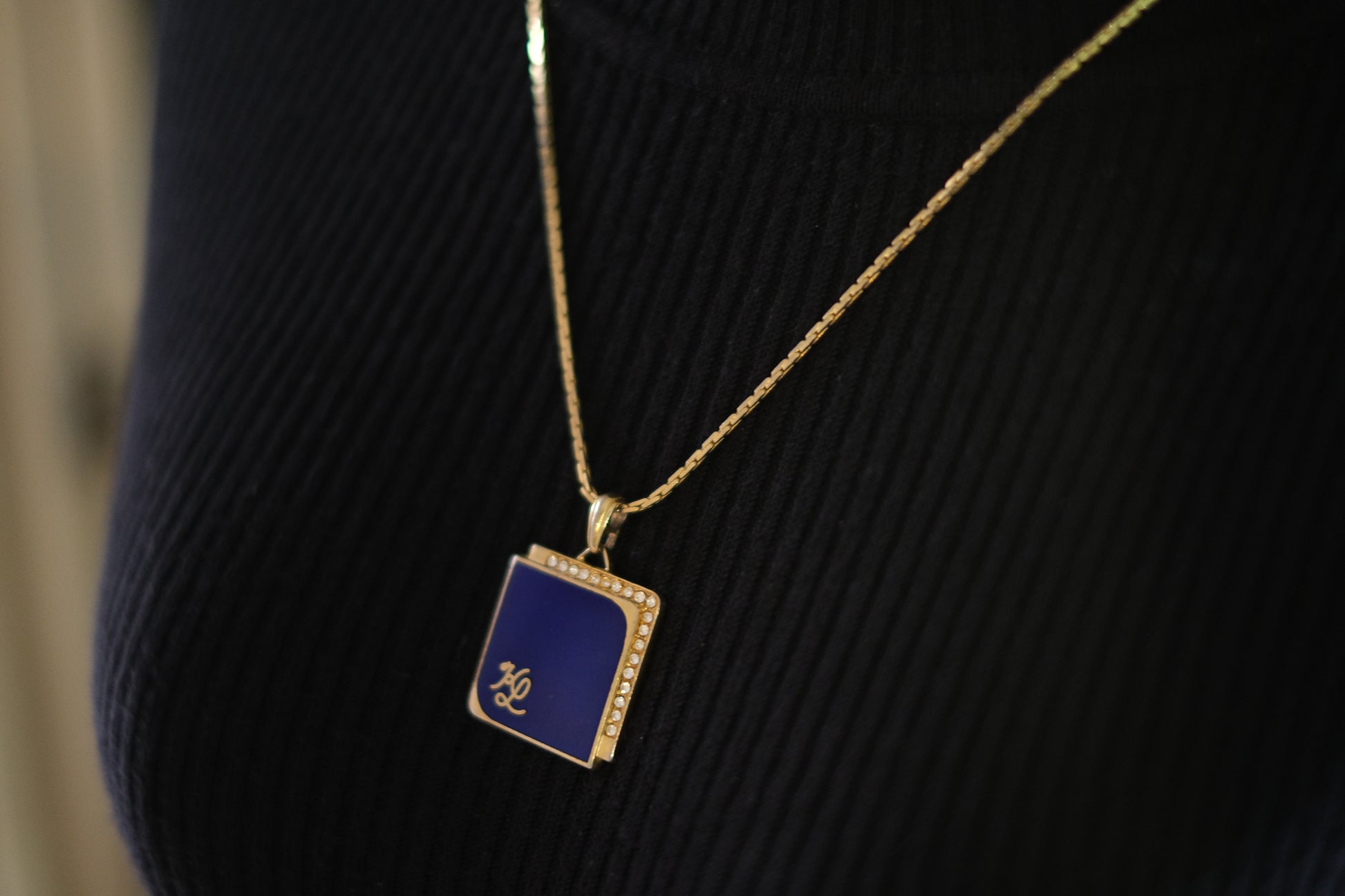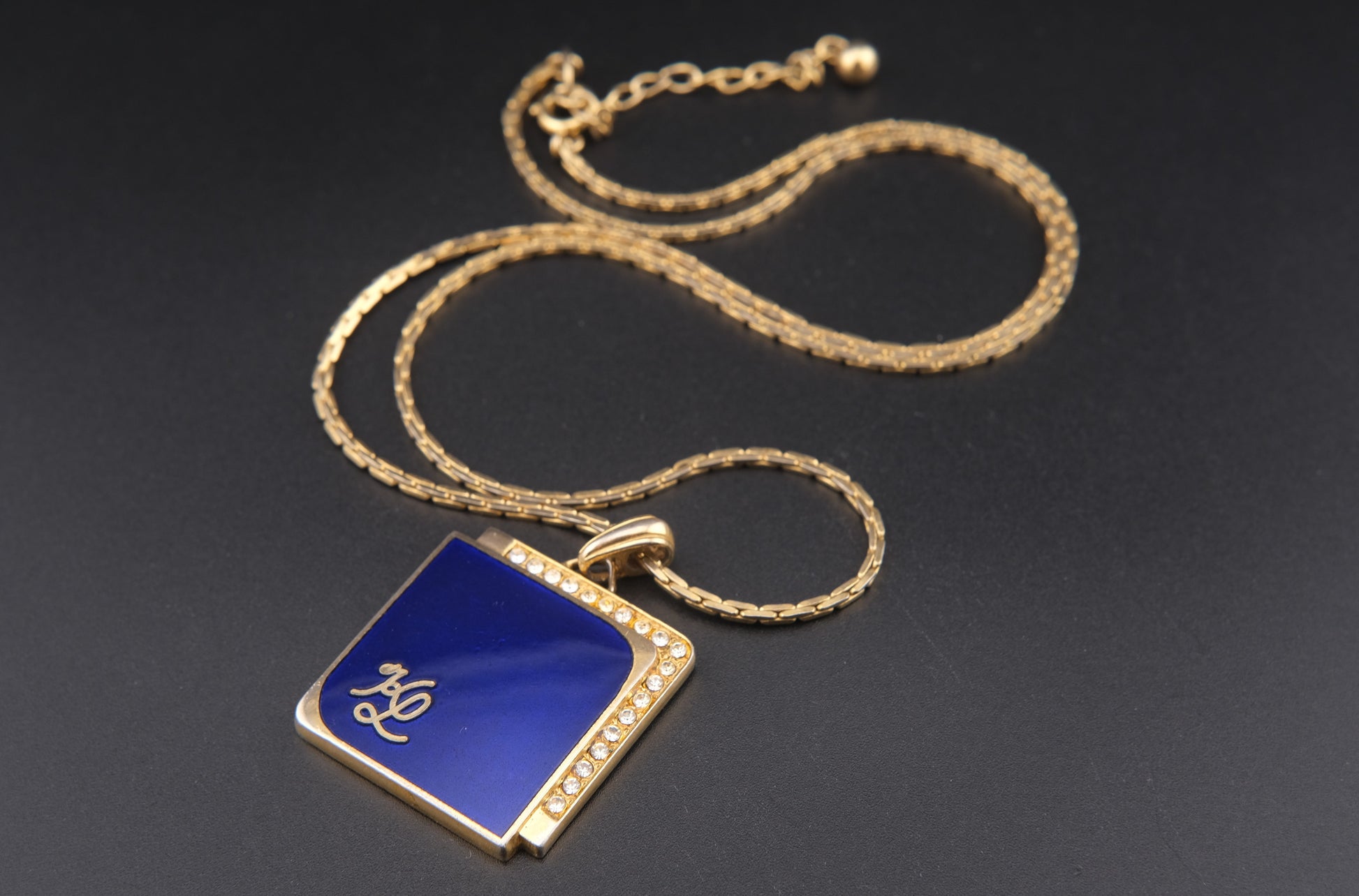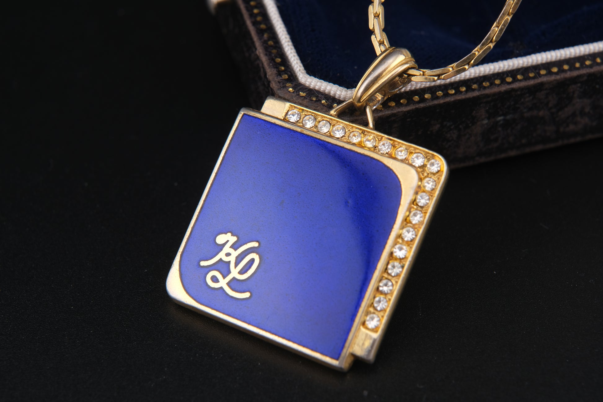 Vintage KL Enamel Pendant Necklace by Karl Lagerfeld – Royal Blue with Pavé Rhinestones