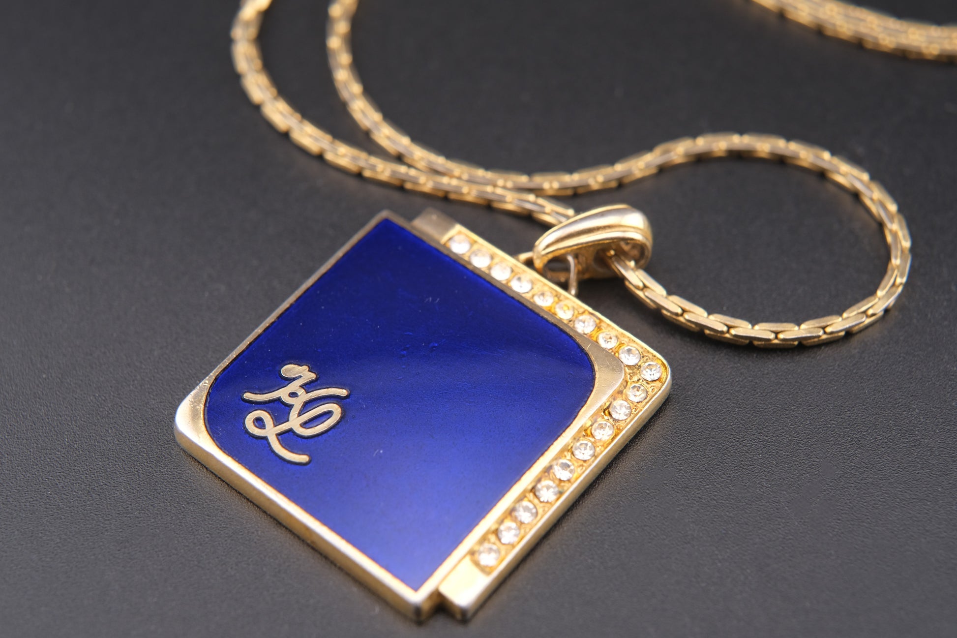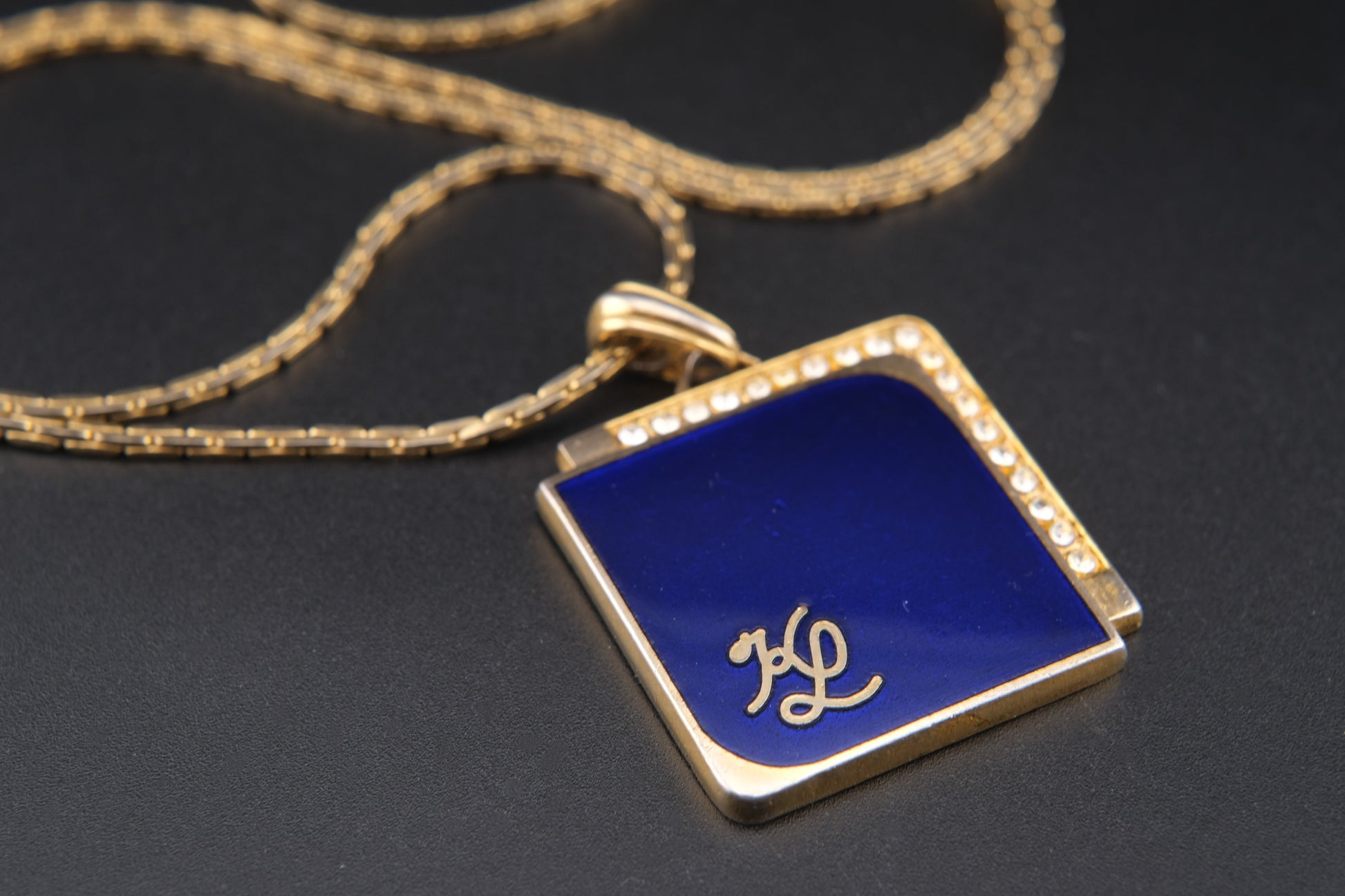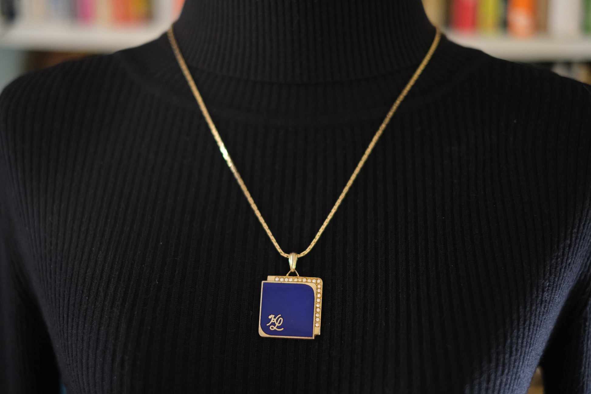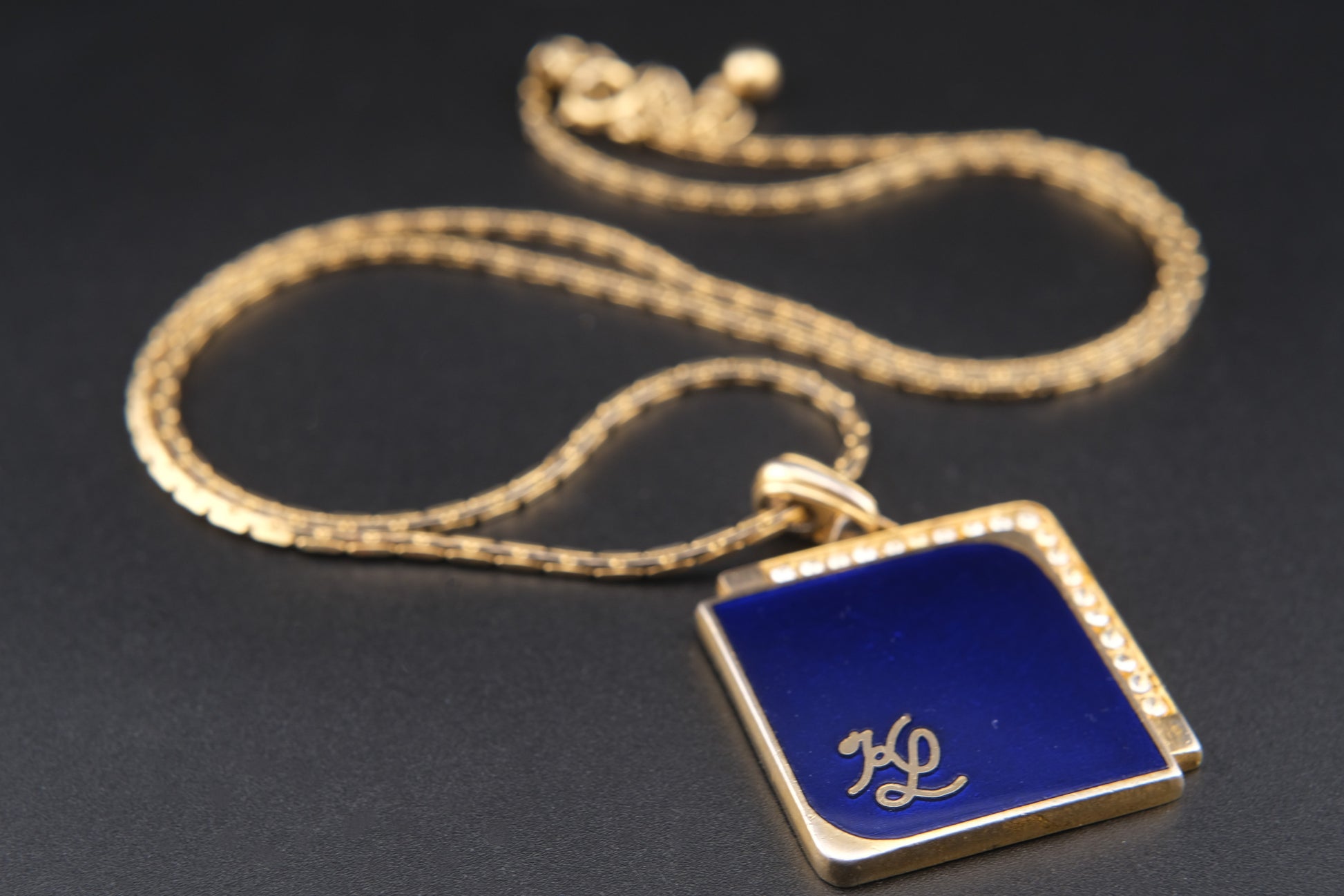 Vintage KL Enamel Pendant Necklace by Karl Lagerfeld – Royal Blue with Pavé Rhinestones