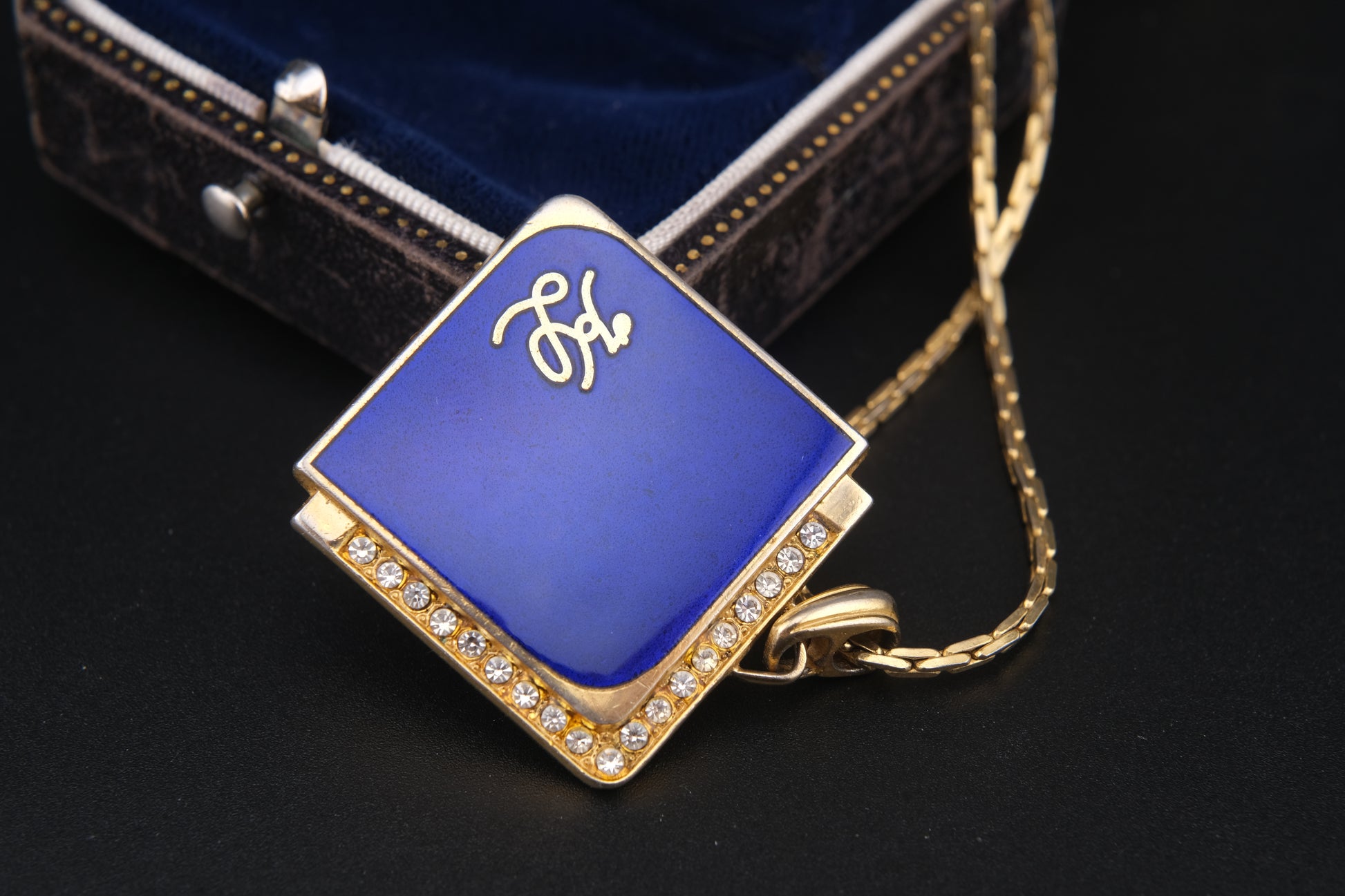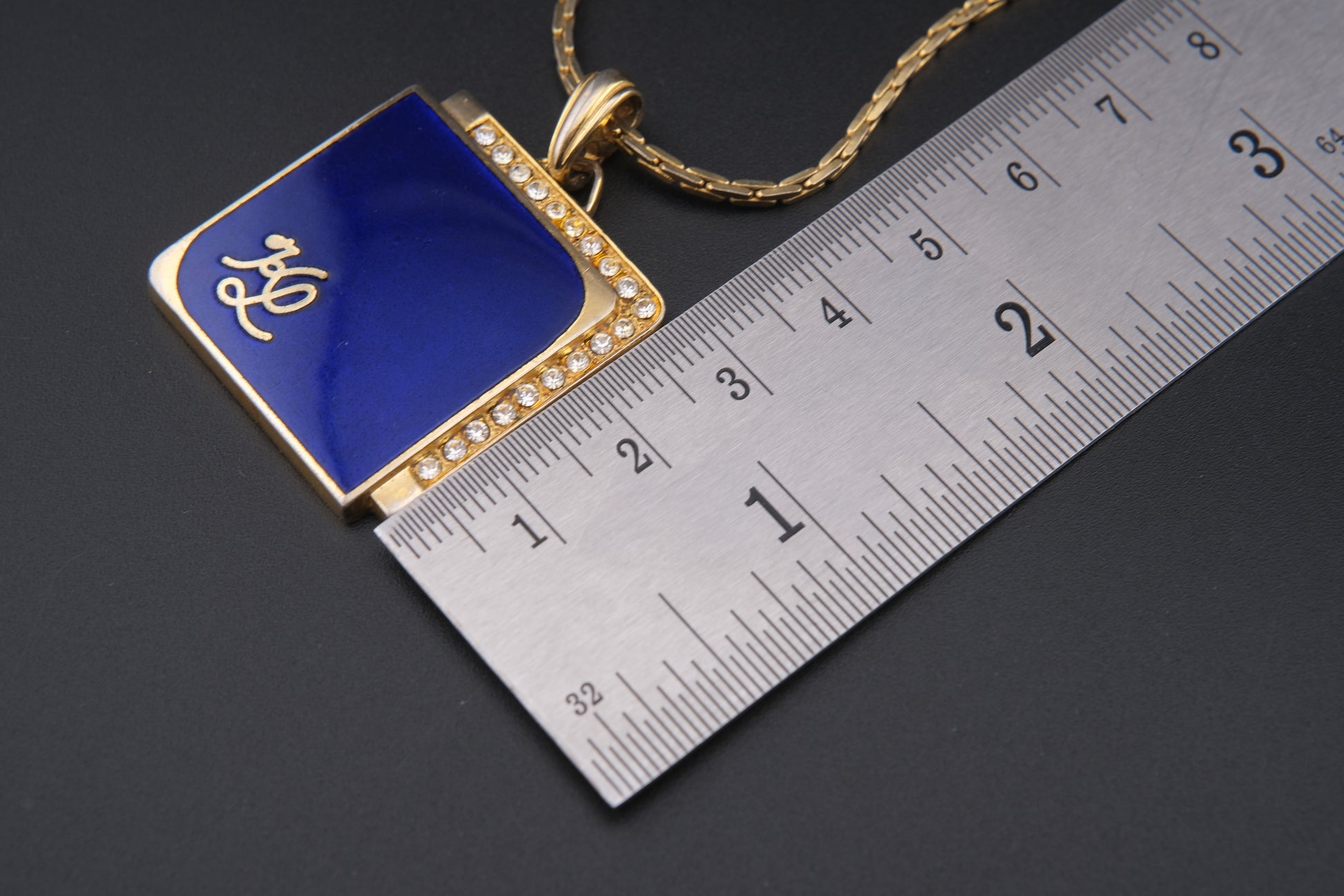- Design: Square geometric pendant with royal blue enamel and pavé rhinestone border