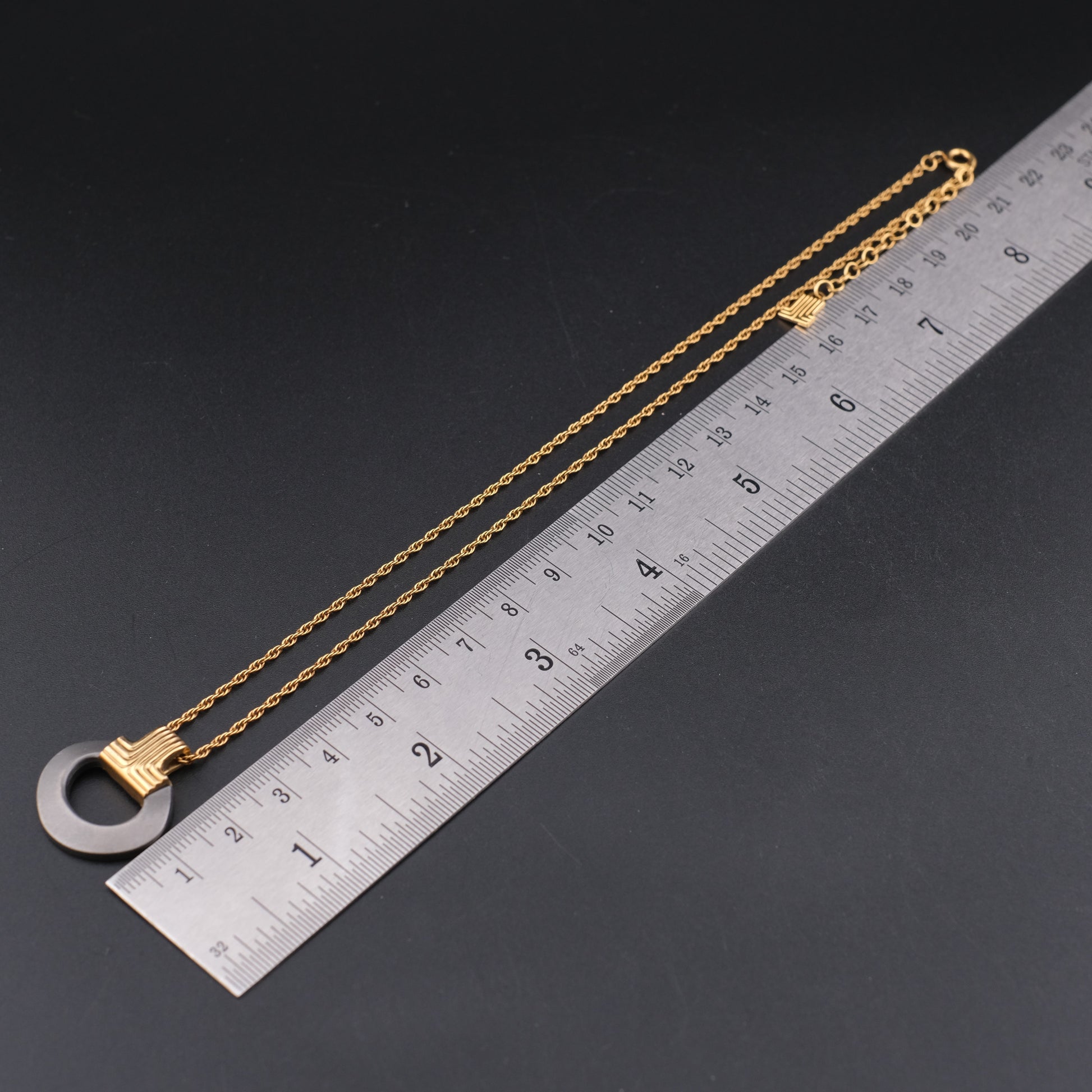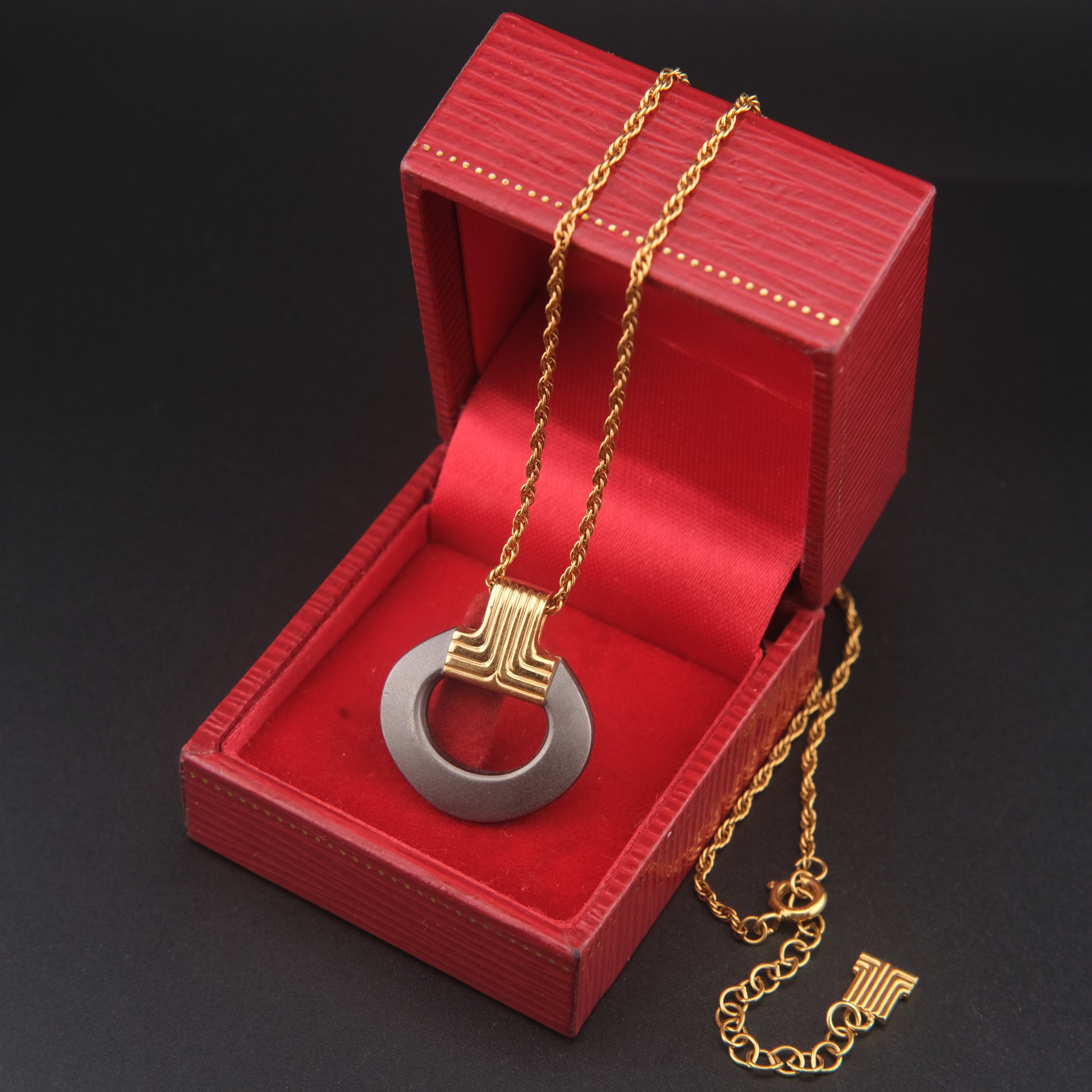 Vintage Lanvin Modernist Pendant Necklace, Gold & Matte Gunmetal Circle, 1980s Designer Jewelry