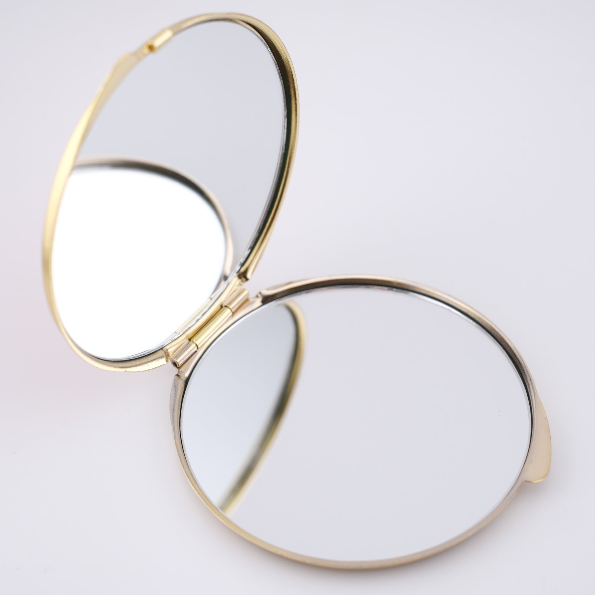 A striking vintage compact mirror by Lanvin Parfums, featuring a vivid red enamel lid adorned with the brand’s gold lettering. The mirror opens to reveal two clear mirrors, ideal for daily touch-ups or display as a collectible beauty accessory. The gold-tone frame adds an elegant finish, making it both practical and timelessly chic.