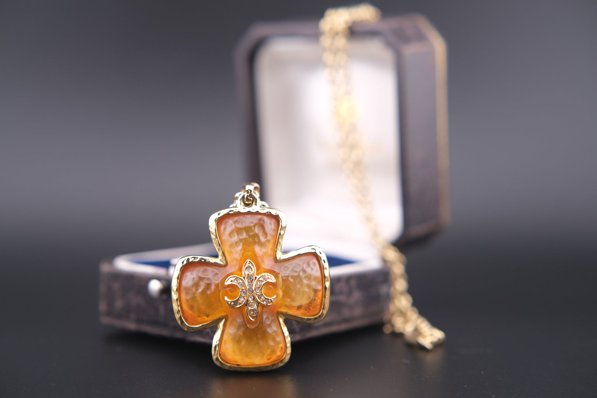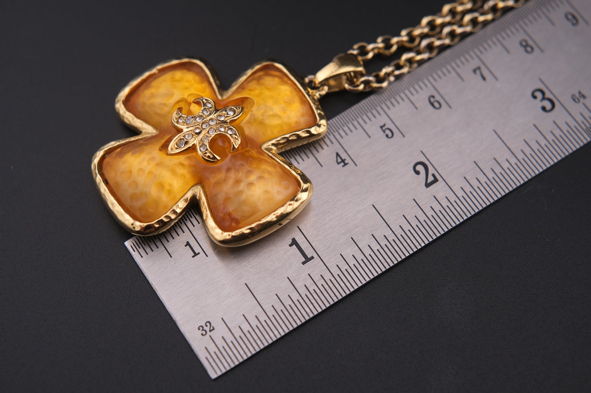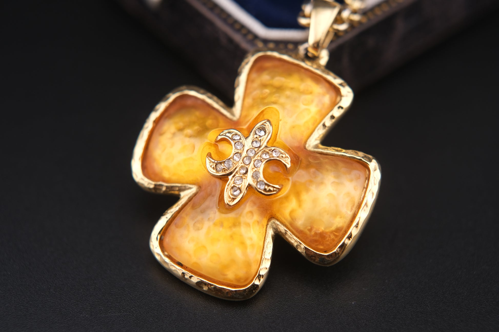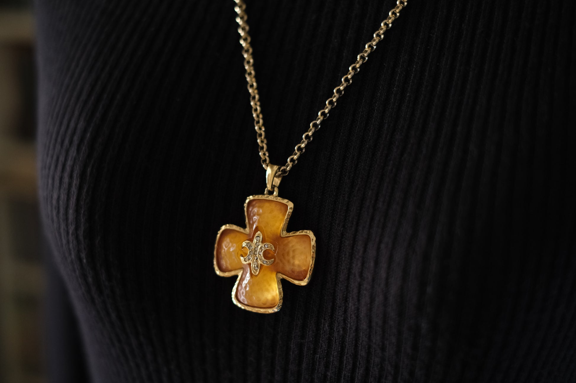 - Design: Bold cross pendant with a honey-yellow textured resin inlay, centered with a pavé-set rhinestone fleur-de-lis, suspended from a coordinating gold-tone chain