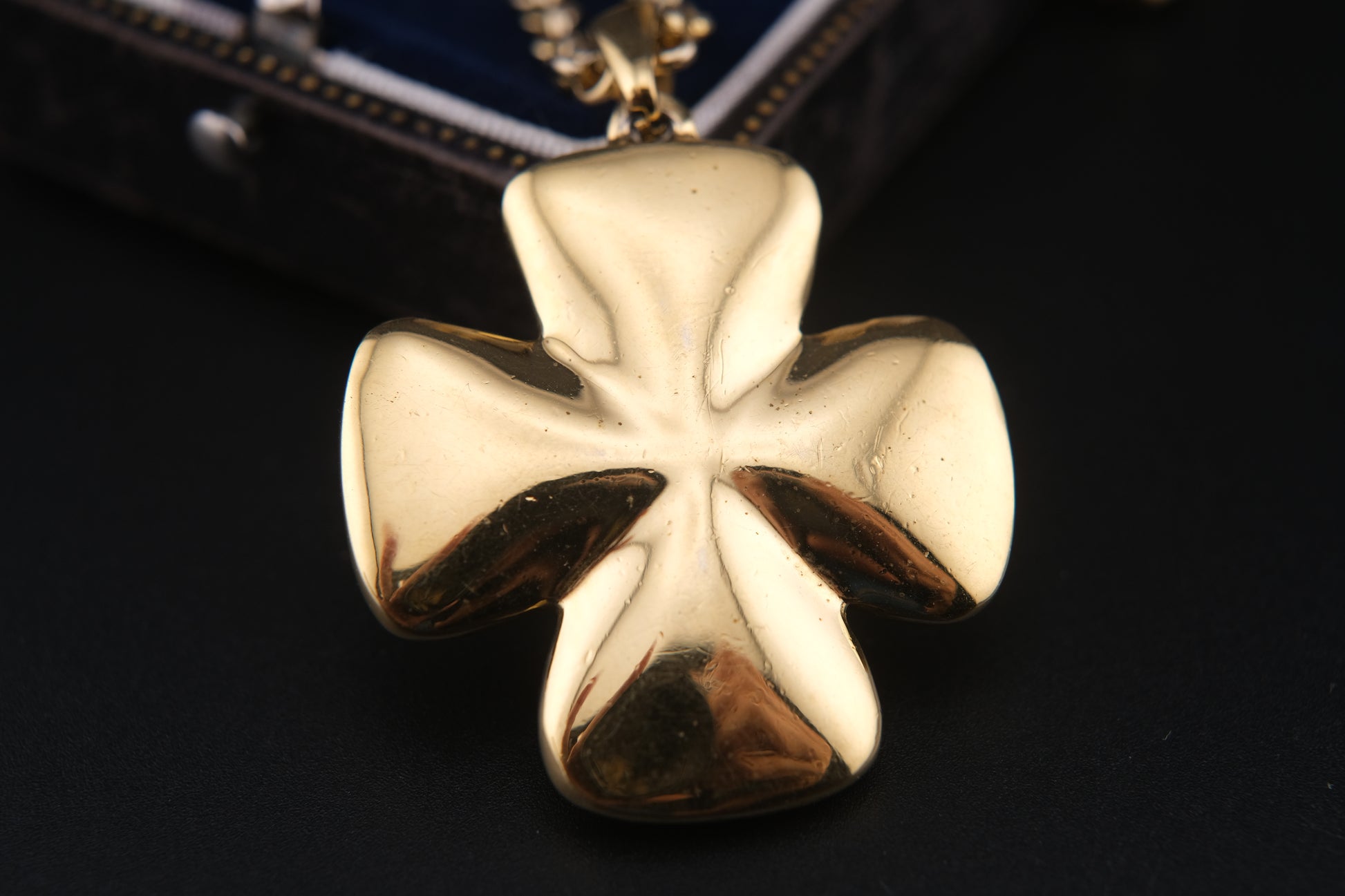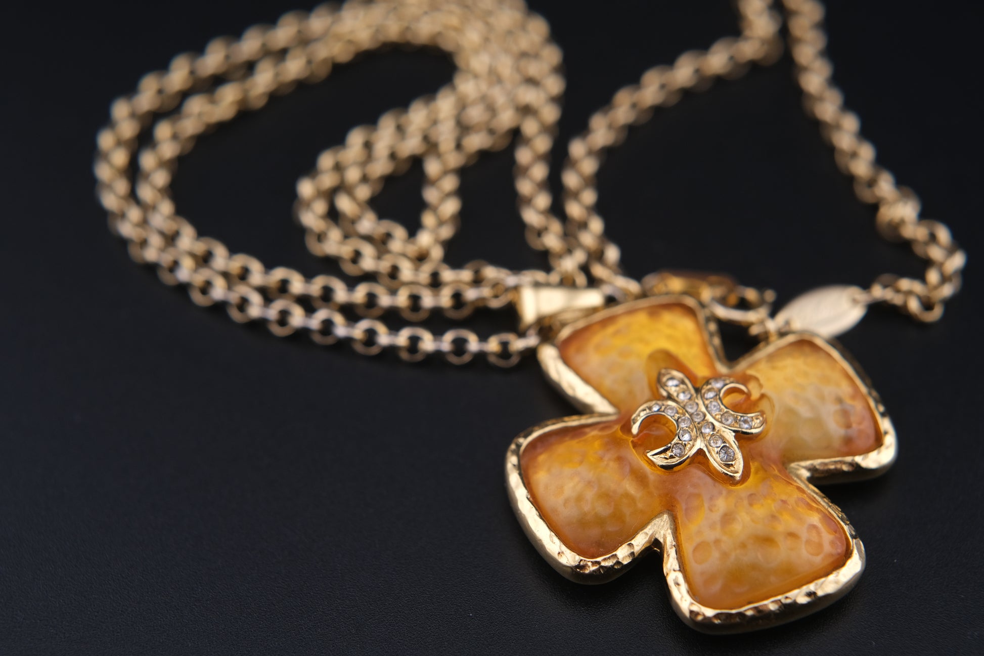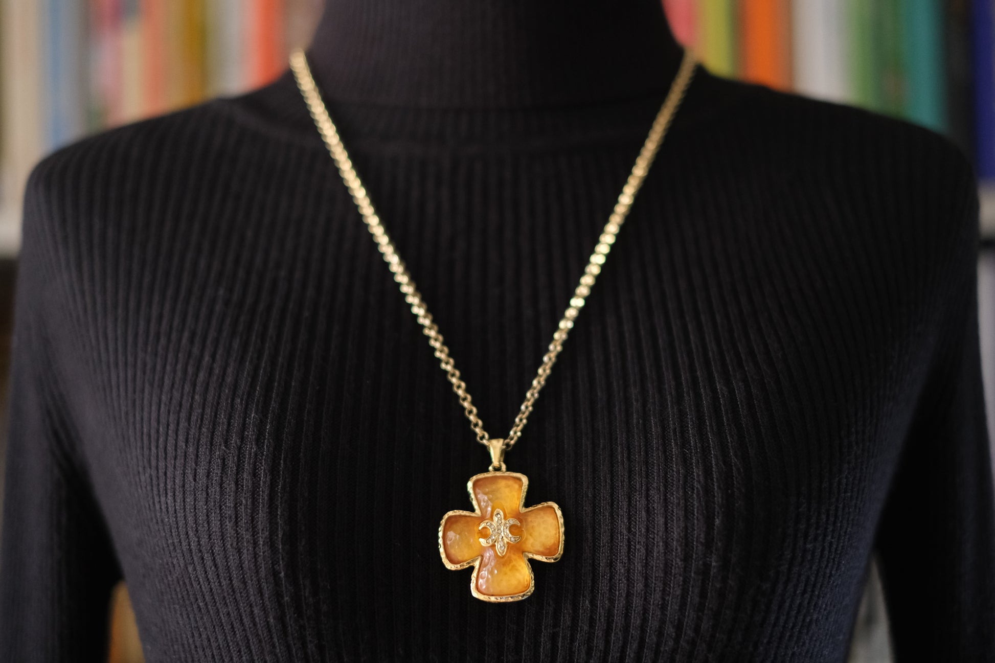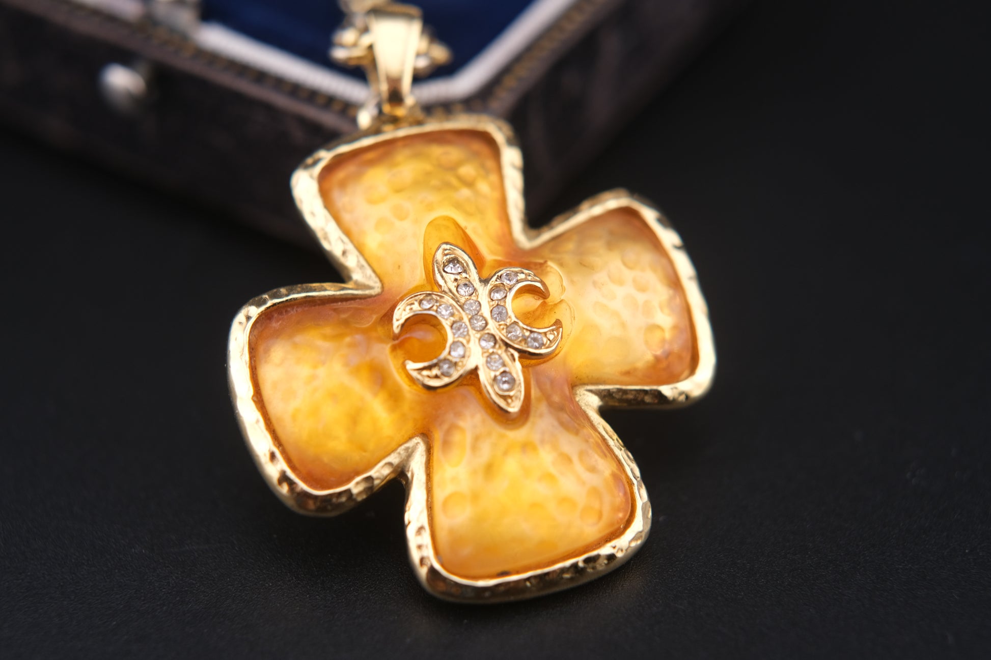 - Design: Bold cross pendant with a honey-yellow textured resin inlay, centered with a pavé-set rhinestone fleur-de-lis, suspended from a coordinating gold-tone chain