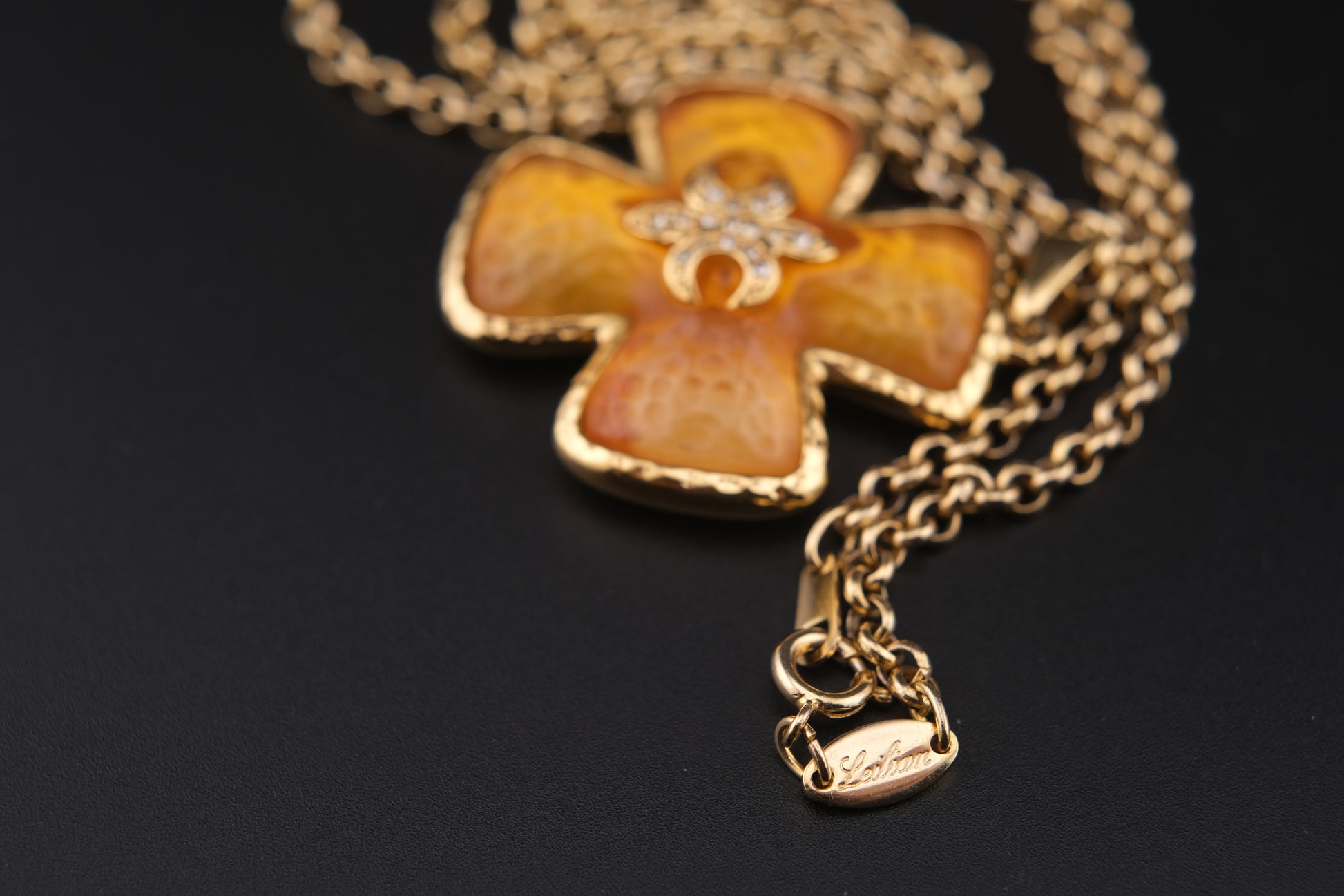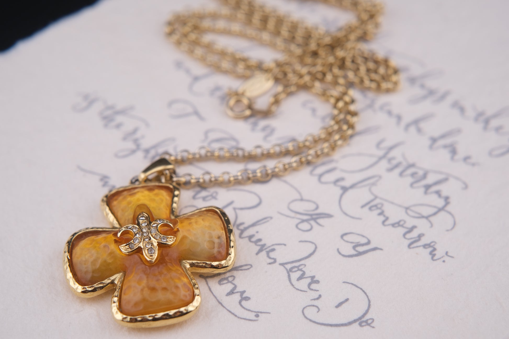 Elevate your style with this eye-catching vintage Leilian pendant necklace. The cross-shaped pendant features a beautifully textured honey-yellow resin center, framed by rich gold-tone metal for a warm, luxurious look. Adorned with a sparkling rhinestone-studded fleur-de-lis, this piece adds a regal and elegant flair to any outfit. The pendant hangs gracefully from a matching gold-tone chain with a secure clasp and signed Leilian tag.