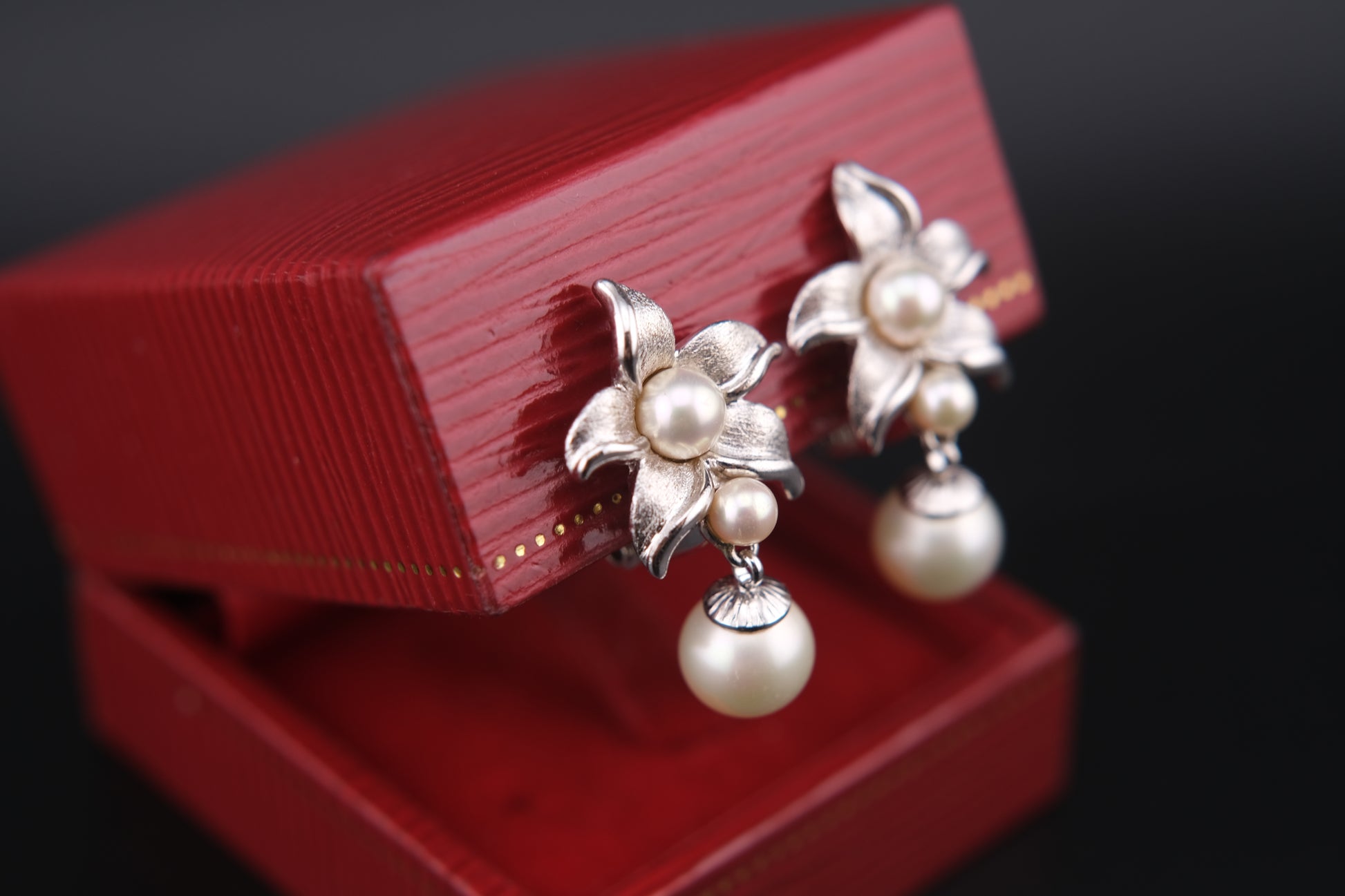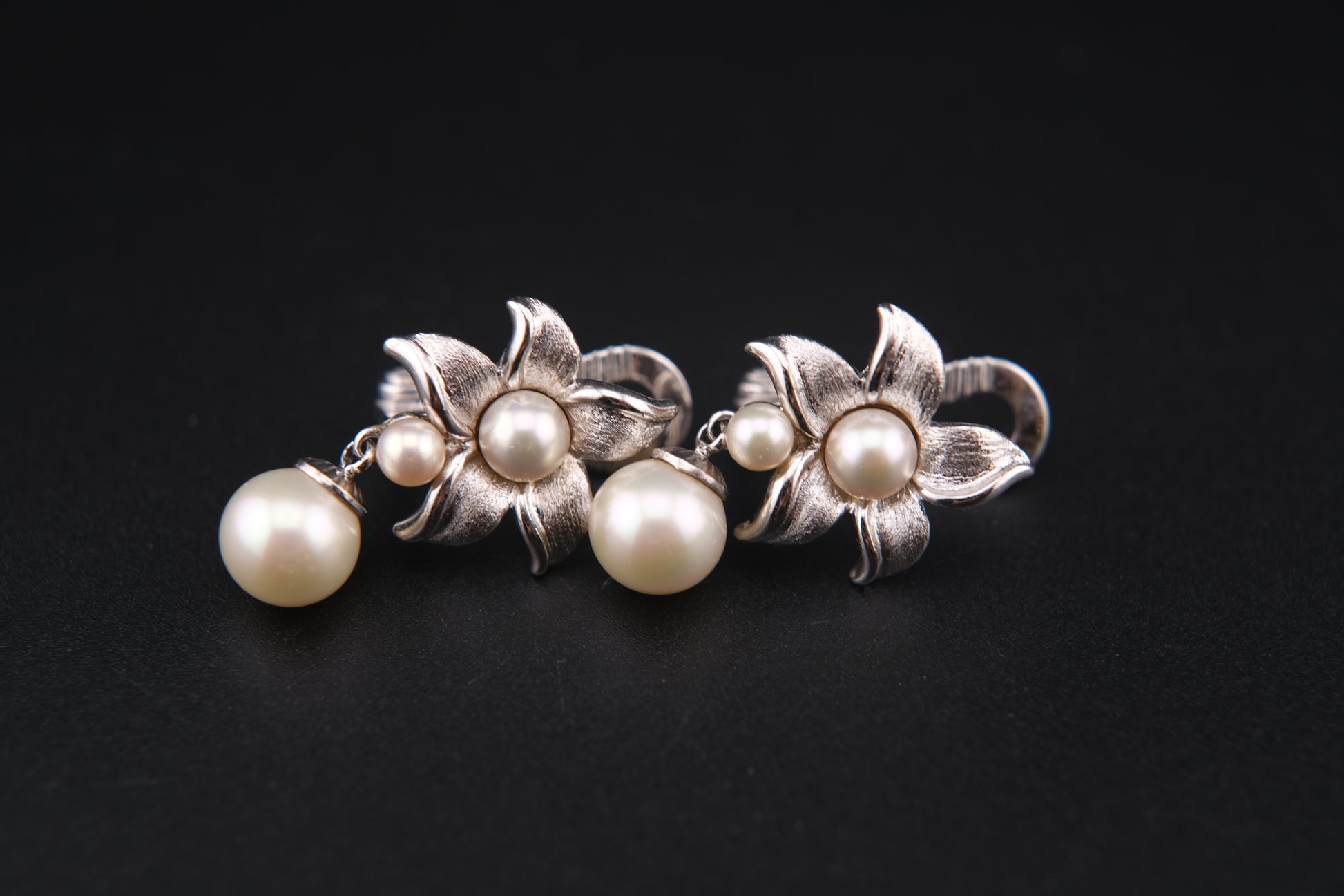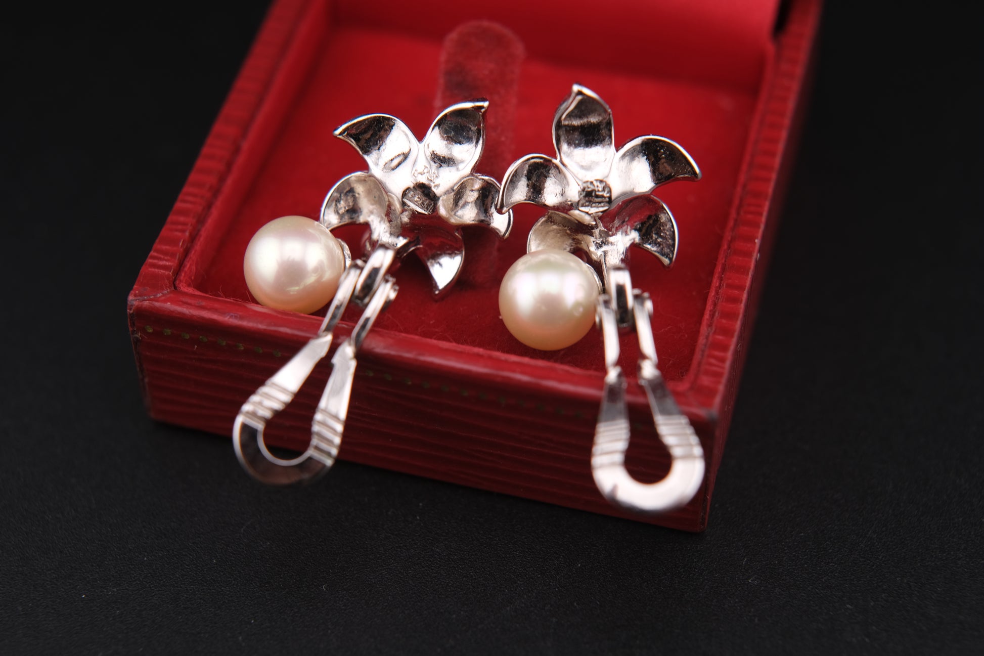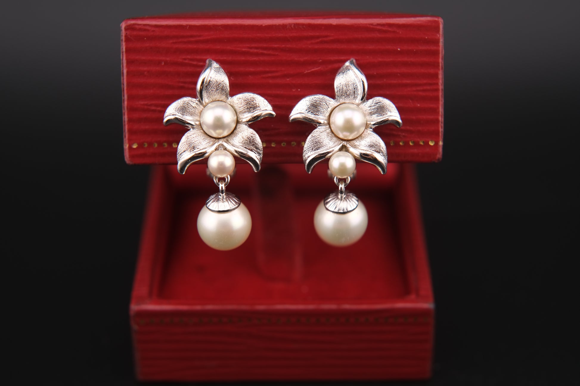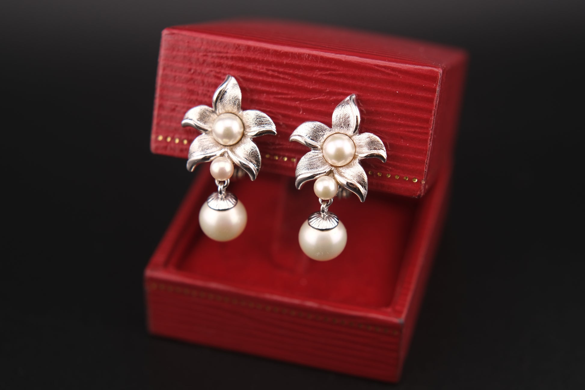 Add a touch of timeless elegance to your collection with these exquisite vintage clip-on earrings by Majorica. Designed in the 1980s, these Spanish-made earrings feature a delicate five-petal flower motif in brushed sterling silver, highlighted by luminous simulated pearls—Majorica’s signature. The sculptural form is both feminine and classic, with an elegant drop design that’s perfect for weddings, anniversaries, or special occasions.