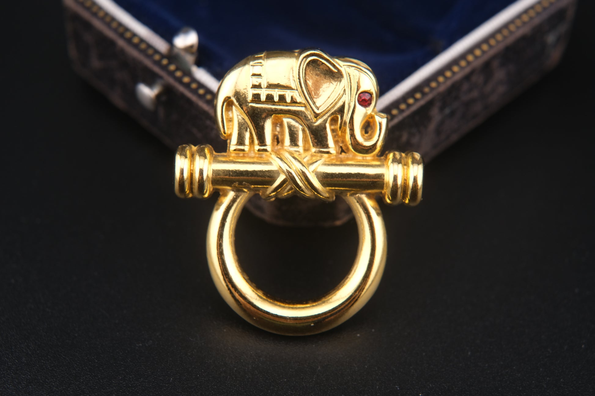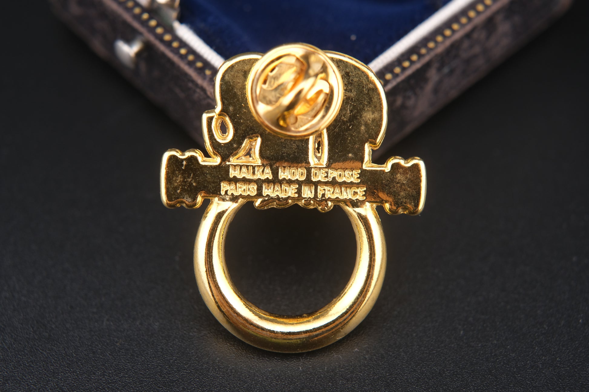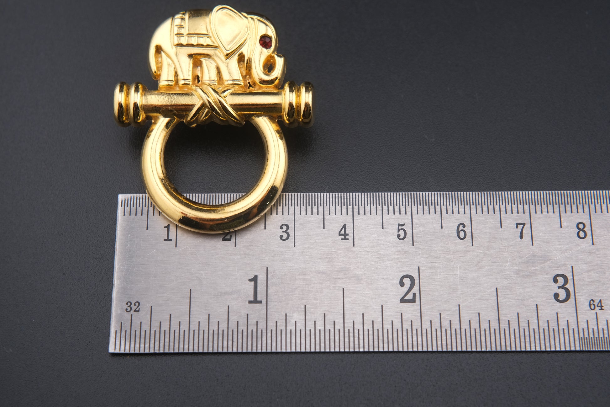 Vintage Malka Paris Elephant Pin – Gilded Gold-Tone with Red Crystal Eye, Made in France
