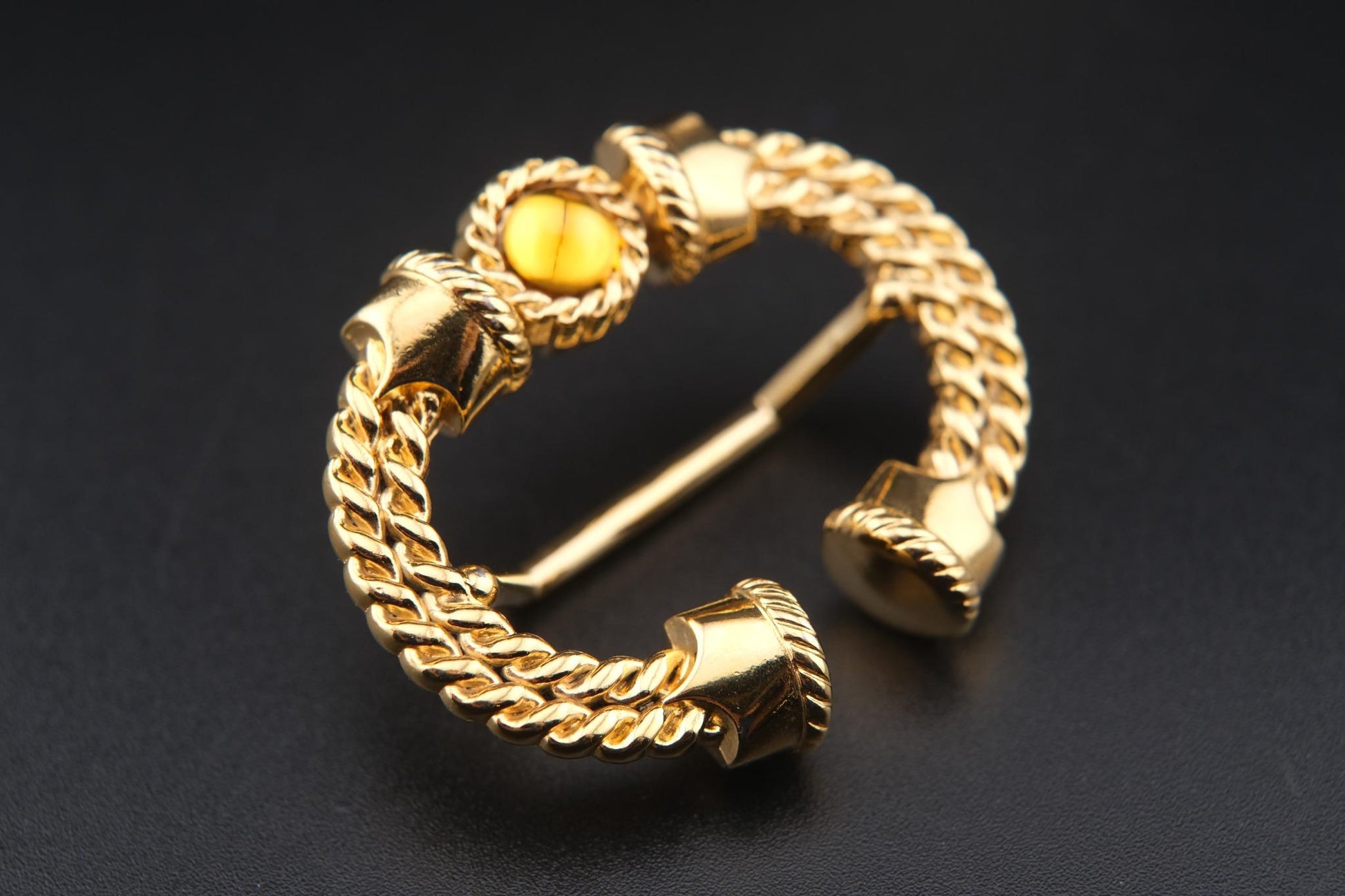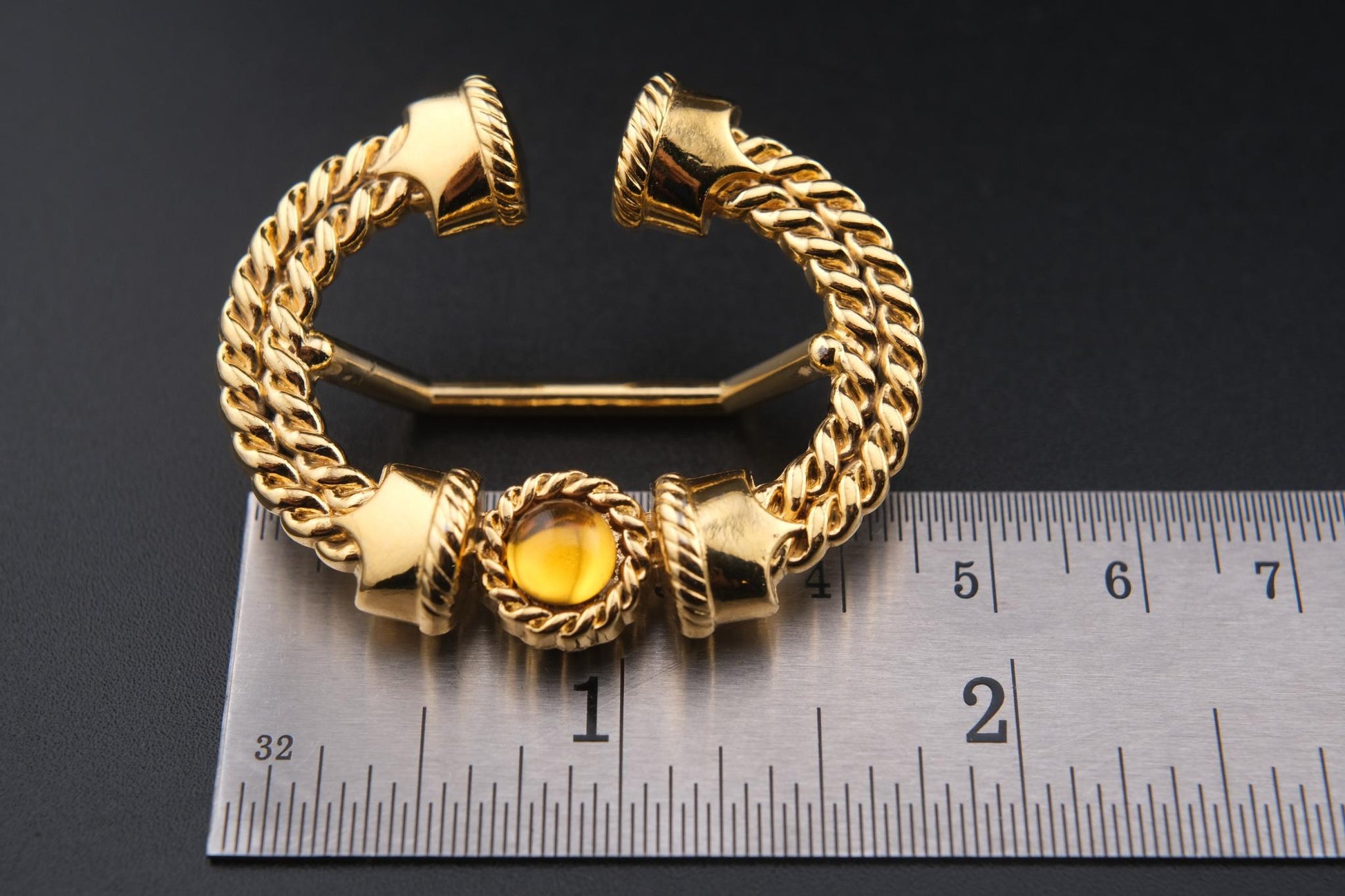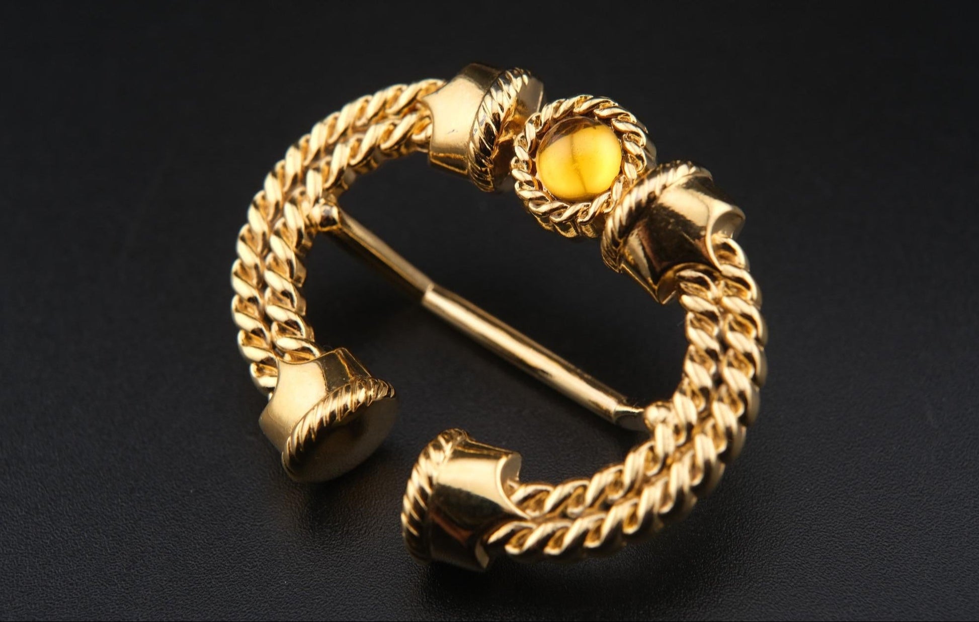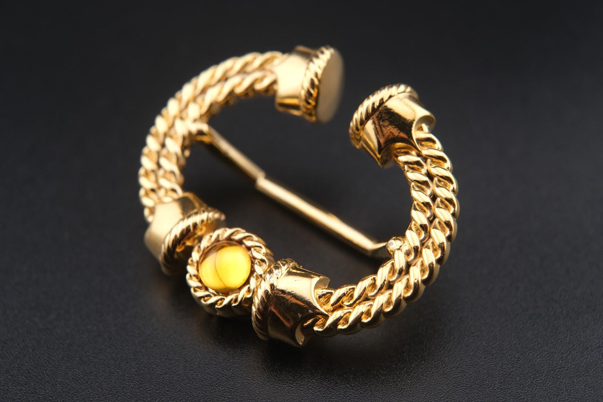Elevate your scarf styling with this exquisite vintage scarf ring from Malka Paris. Expertly crafted in France, this circular ring features a twisted rope-style gold-tone frame adorned with a glossy amber-colored cabochon at the center. A signature piece that blends French sophistication with 1980s–1990s elegance.