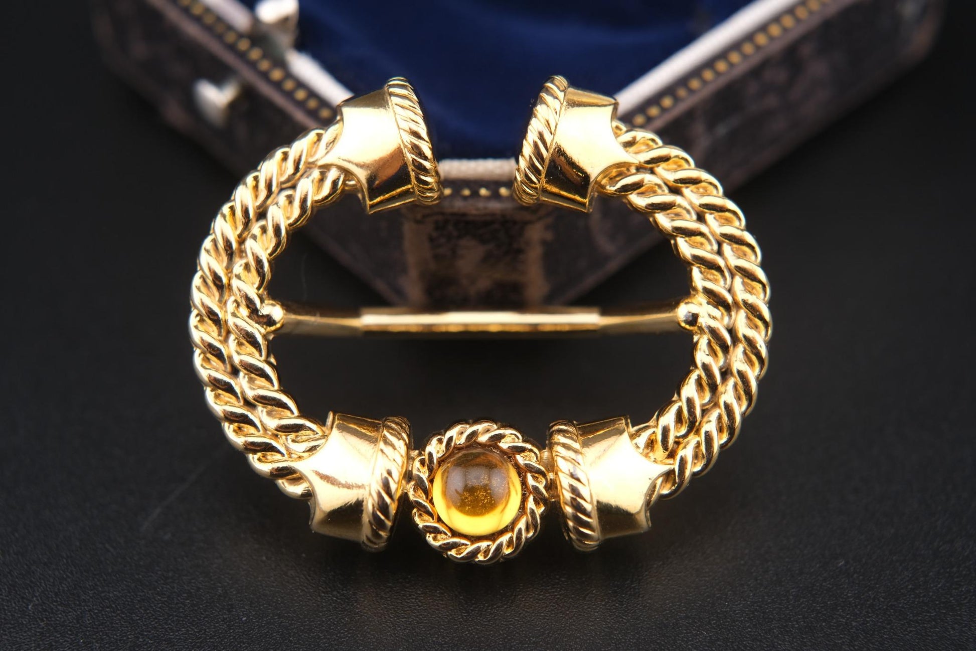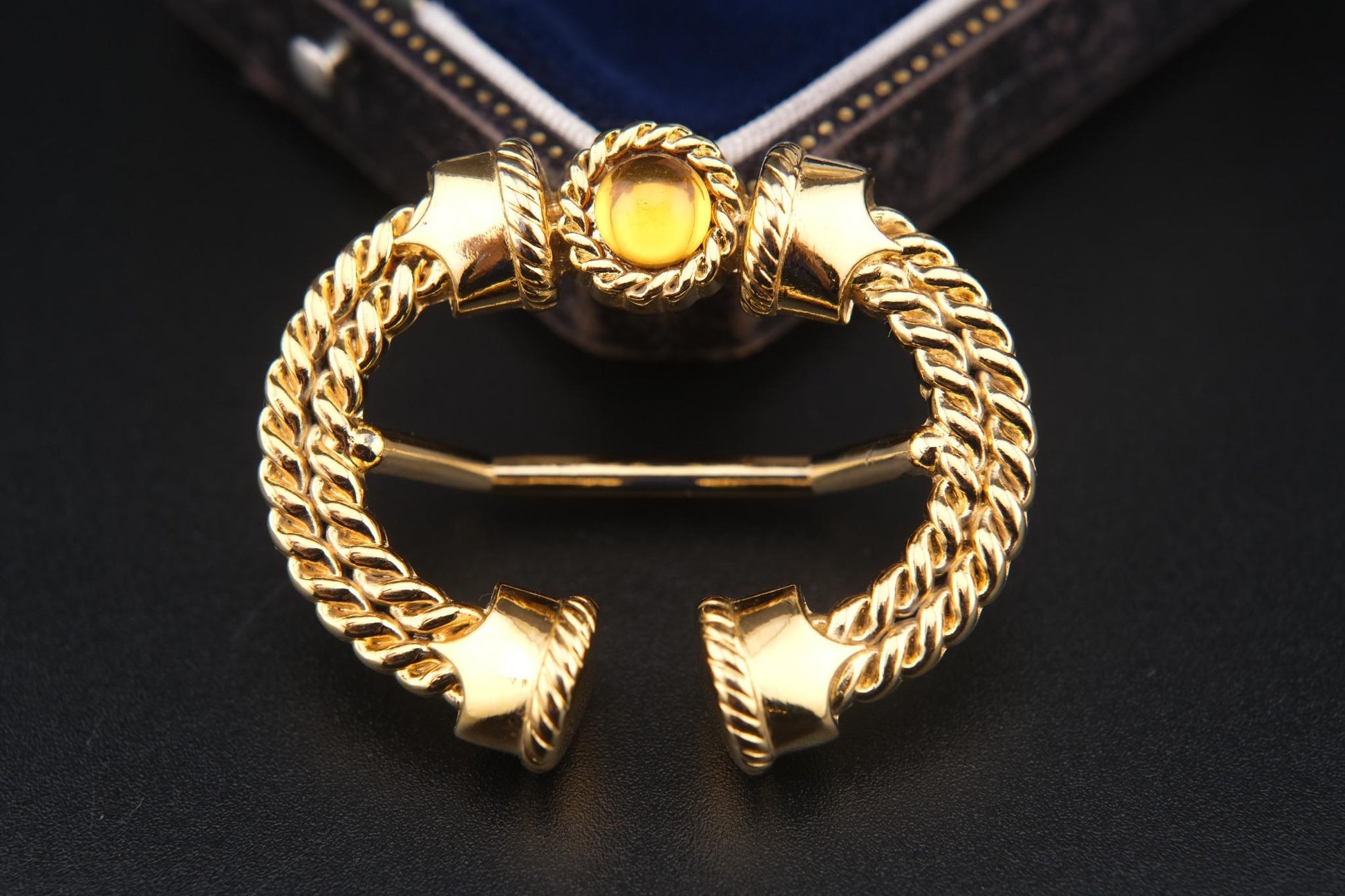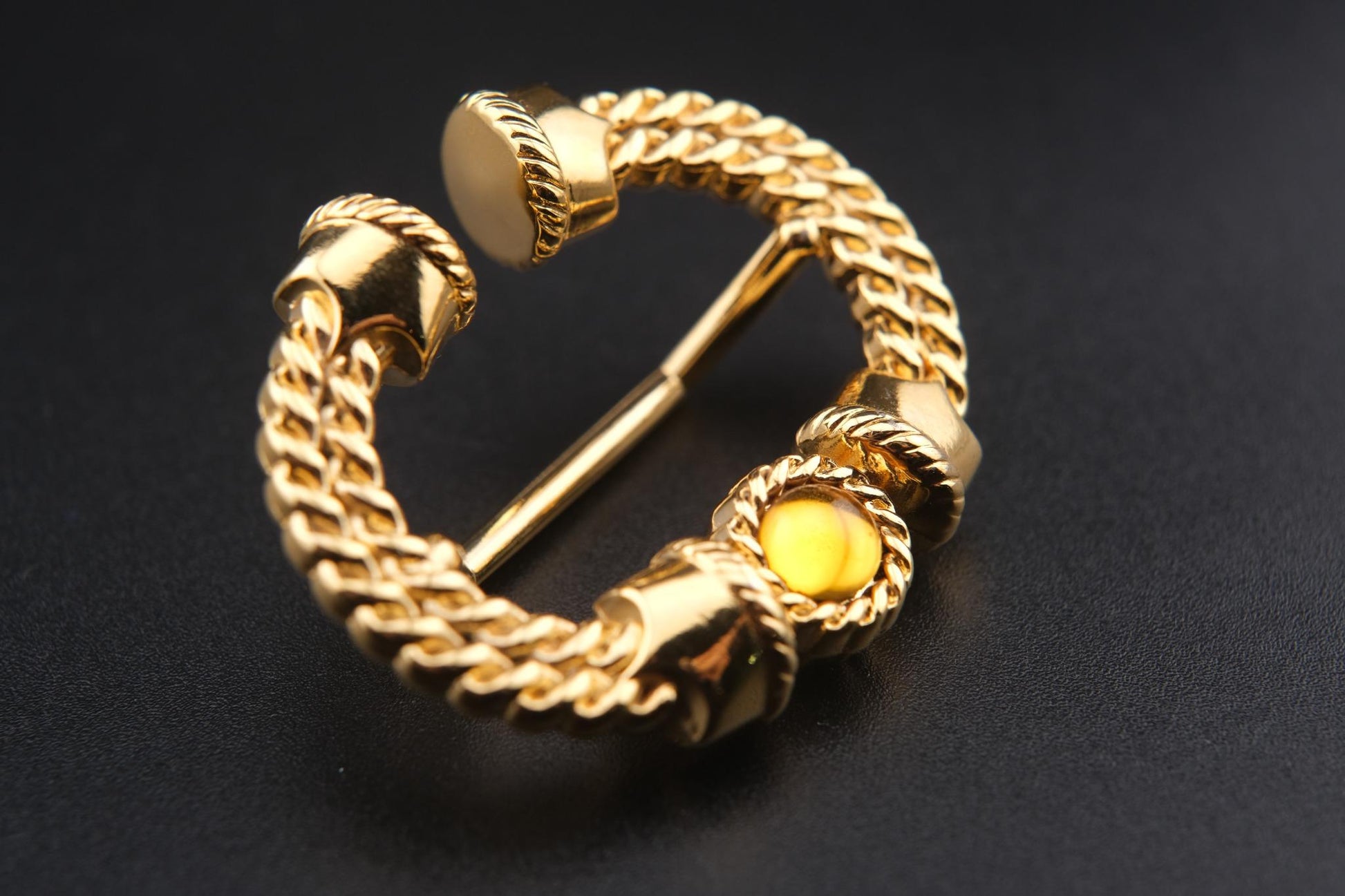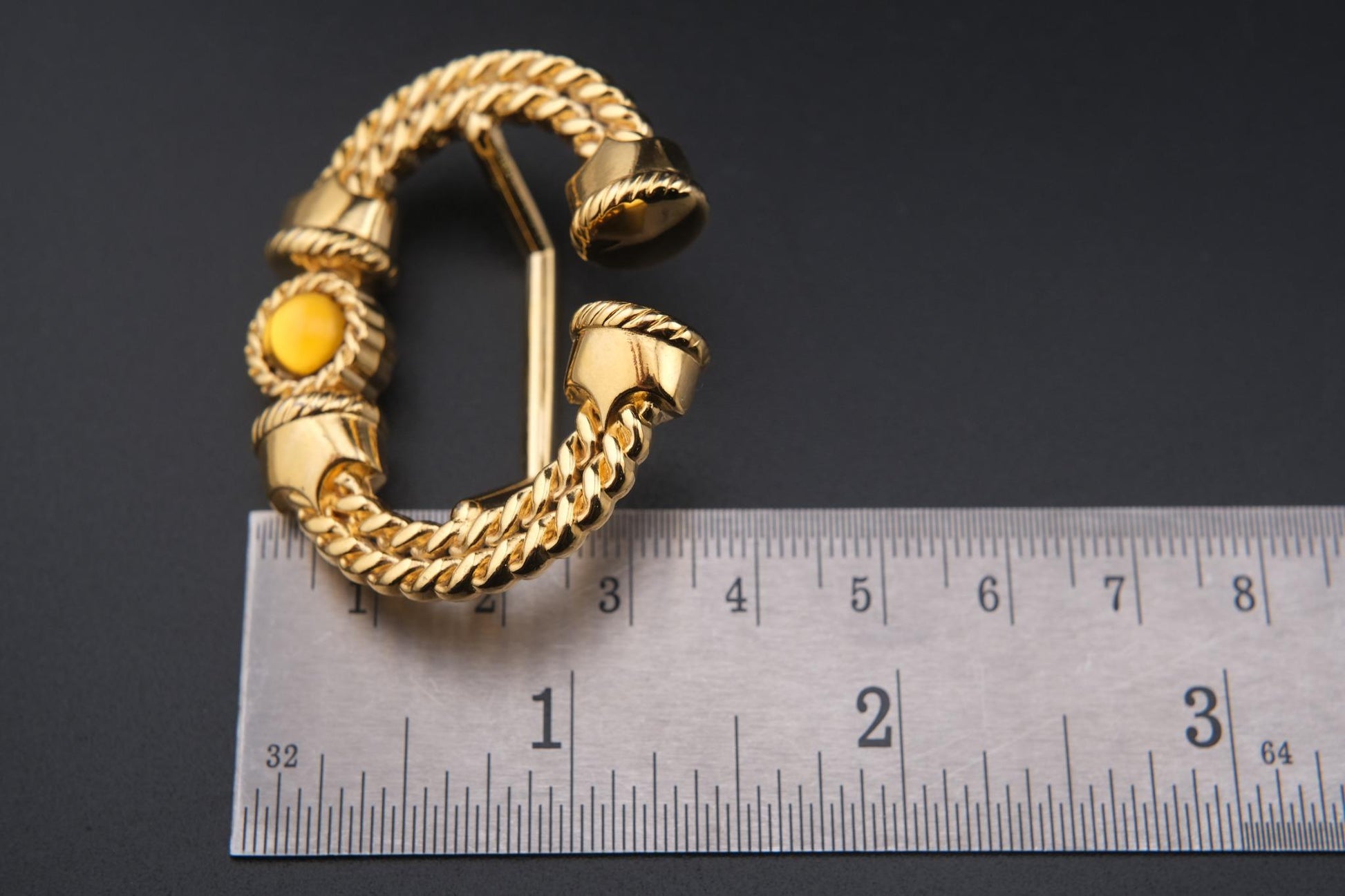 Elevate your scarf styling with this exquisite vintage scarf ring from Malka Paris. Expertly crafted in France, this circular ring features a twisted rope-style gold-tone frame adorned with a glossy amber-colored cabochon at the center. A signature piece that blends French sophistication with 1980s–1990s elegance.