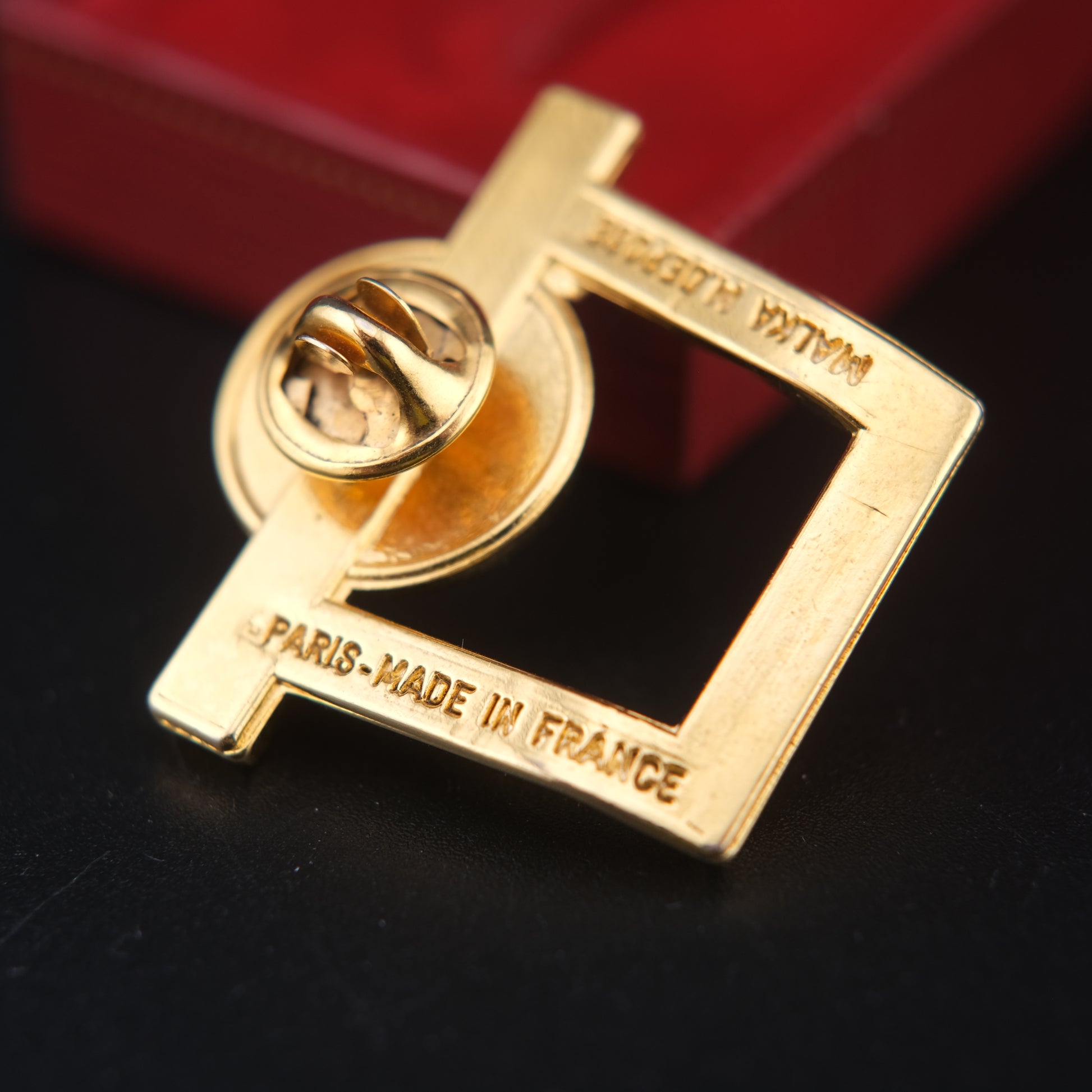 Elevate your collection with this striking vintage Malka Paris pin, crafted in France with bold artistry. Featuring a radiant lion sun medallion at its center, the design is framed by a geometric square with intricate Greek key detailing. Its rich gold-tone finish adds timeless luxury, making it a versatile accessory for blazers, scarves, bags, or as a collector’s statement piece.