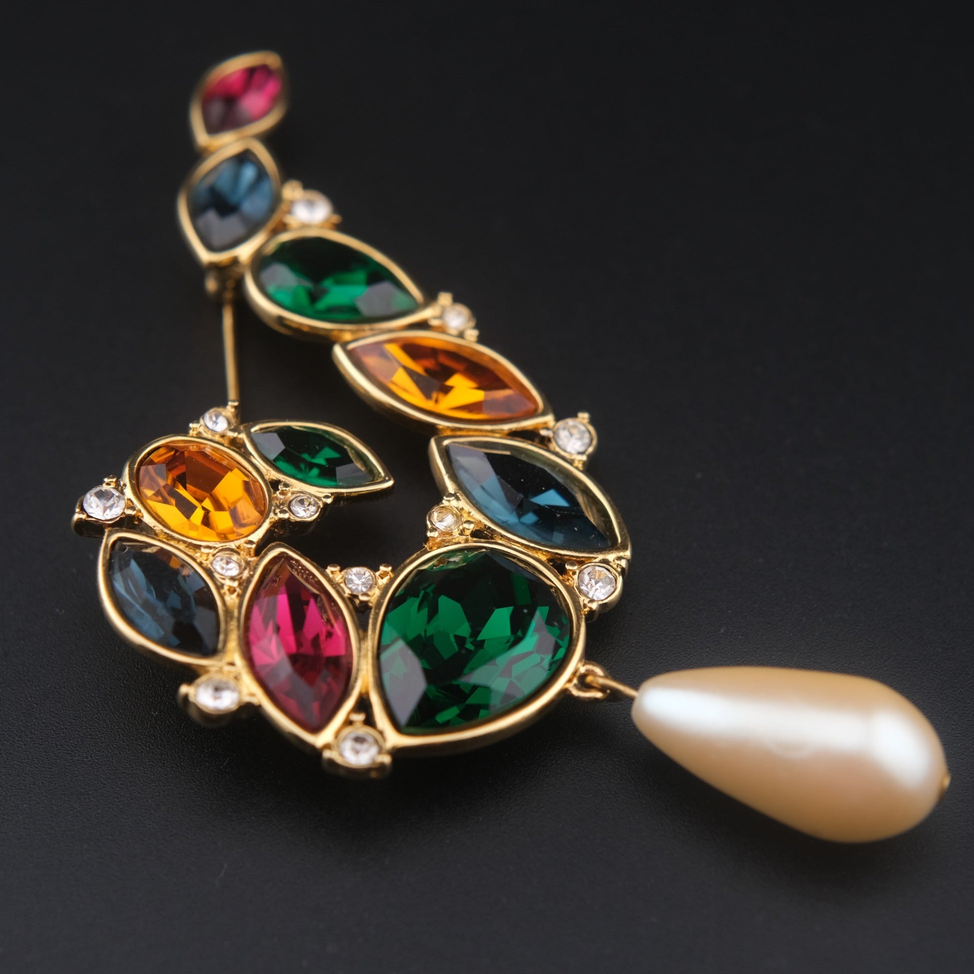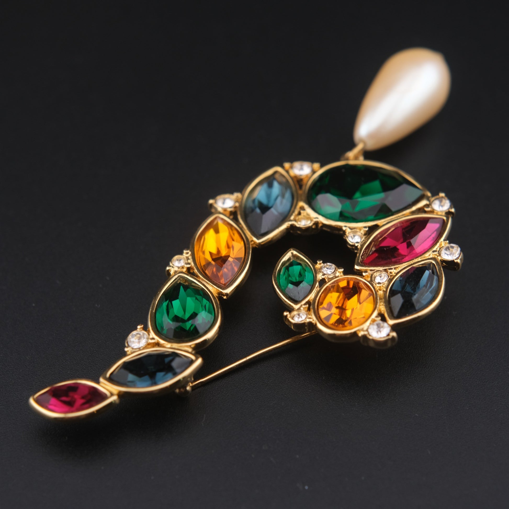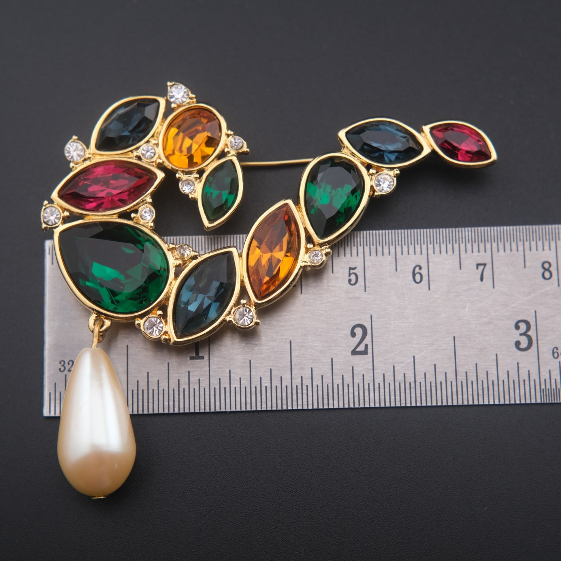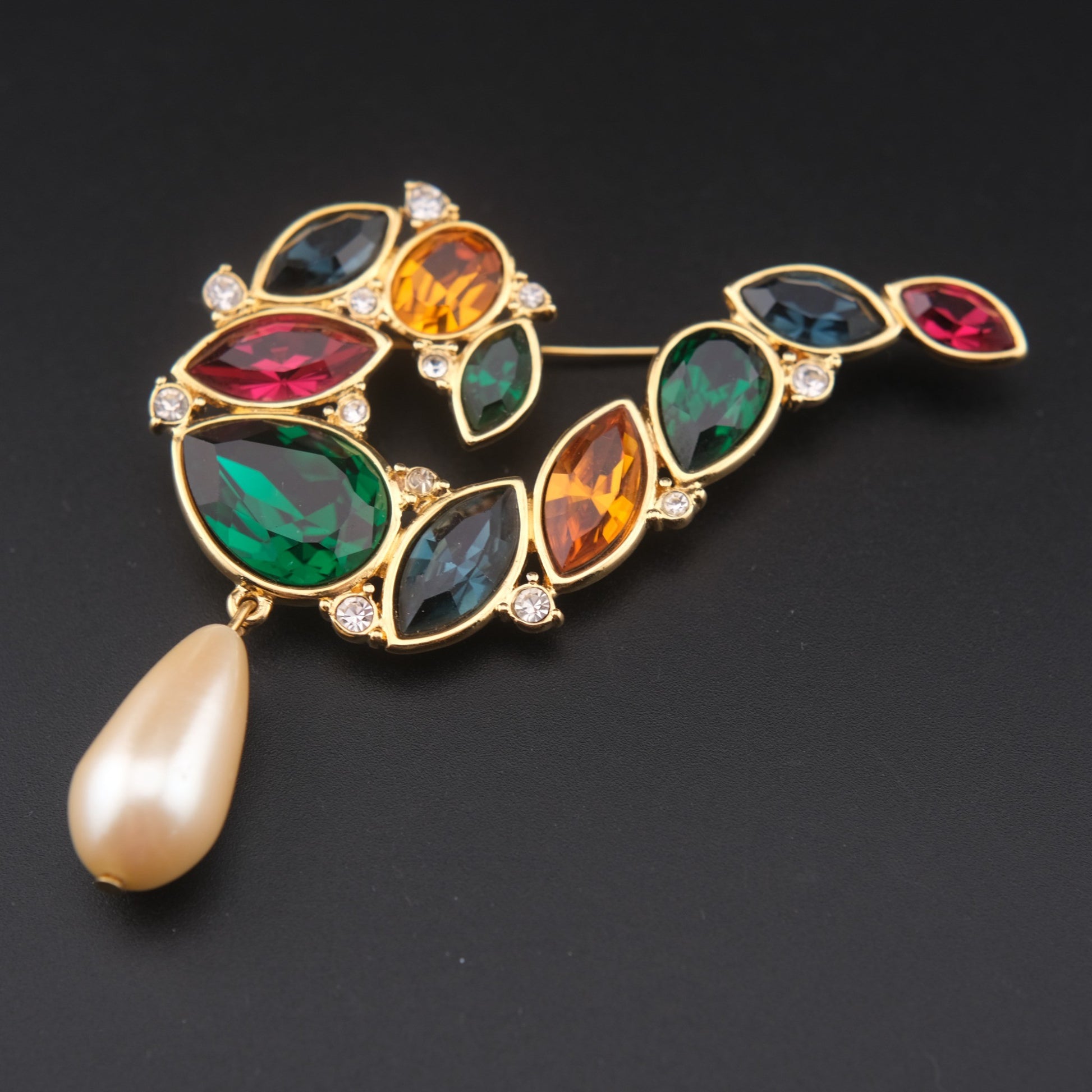 Elevate your vintage jewelry collection with this exquisite Monet brooch featuring an elegant swirl of marquise and pear-cut glass stones in rich jewel tones—emerald green, sapphire blue, ruby red, and citrine orange—accented by brilliant round clear rhinestones. Set in a gold-tone frame, the piece is crowned with a luminous teardrop faux pearl drop, adding a touch of classic glamour.