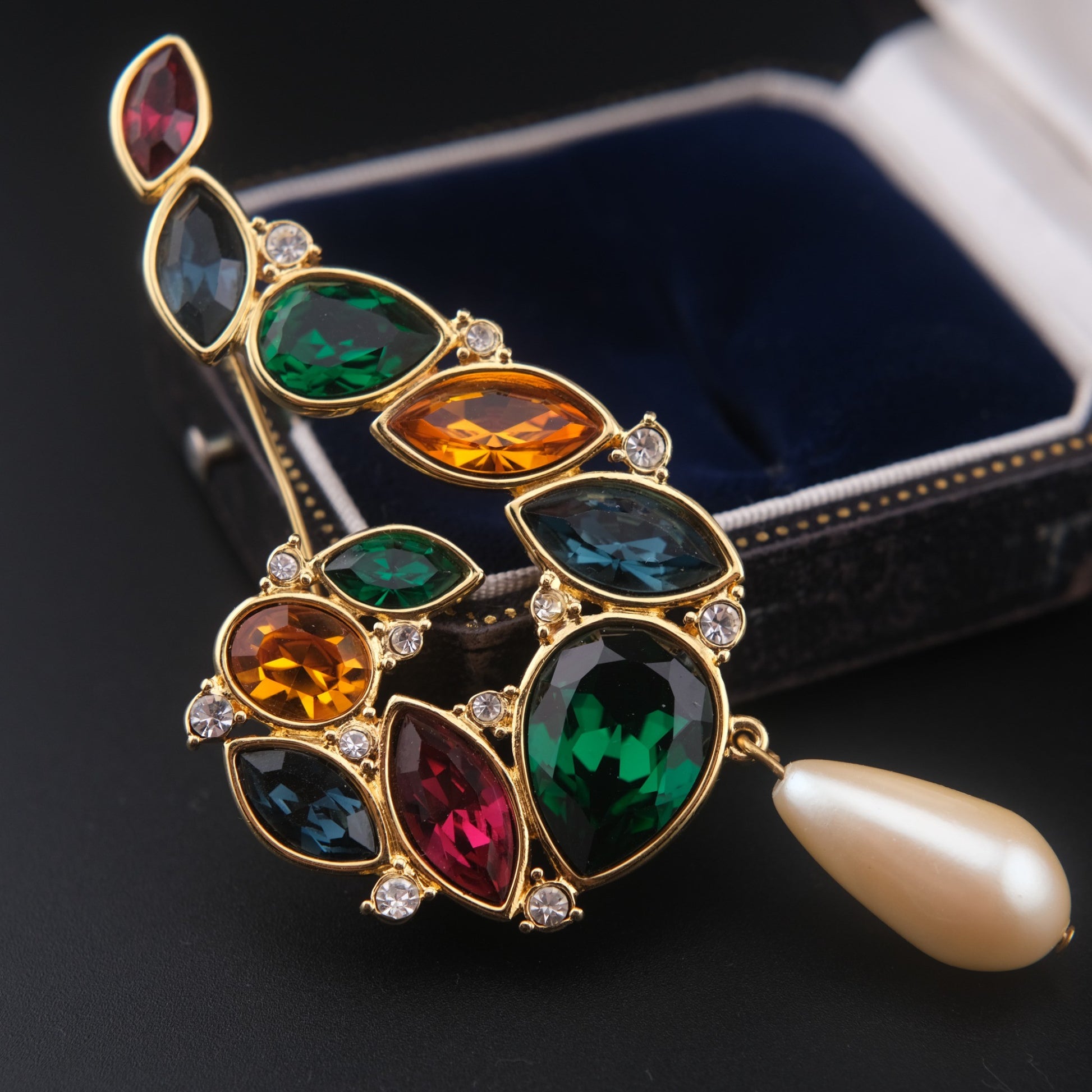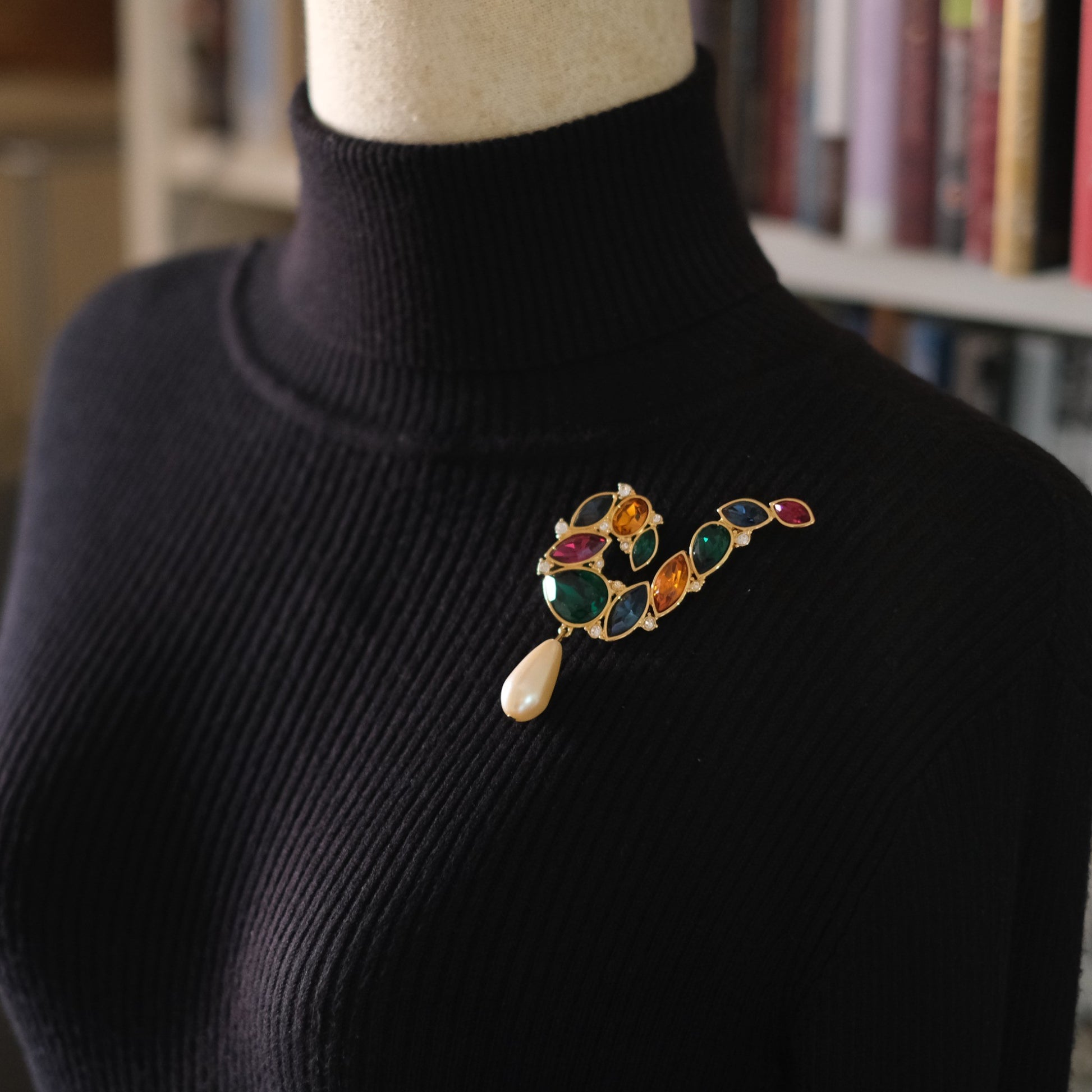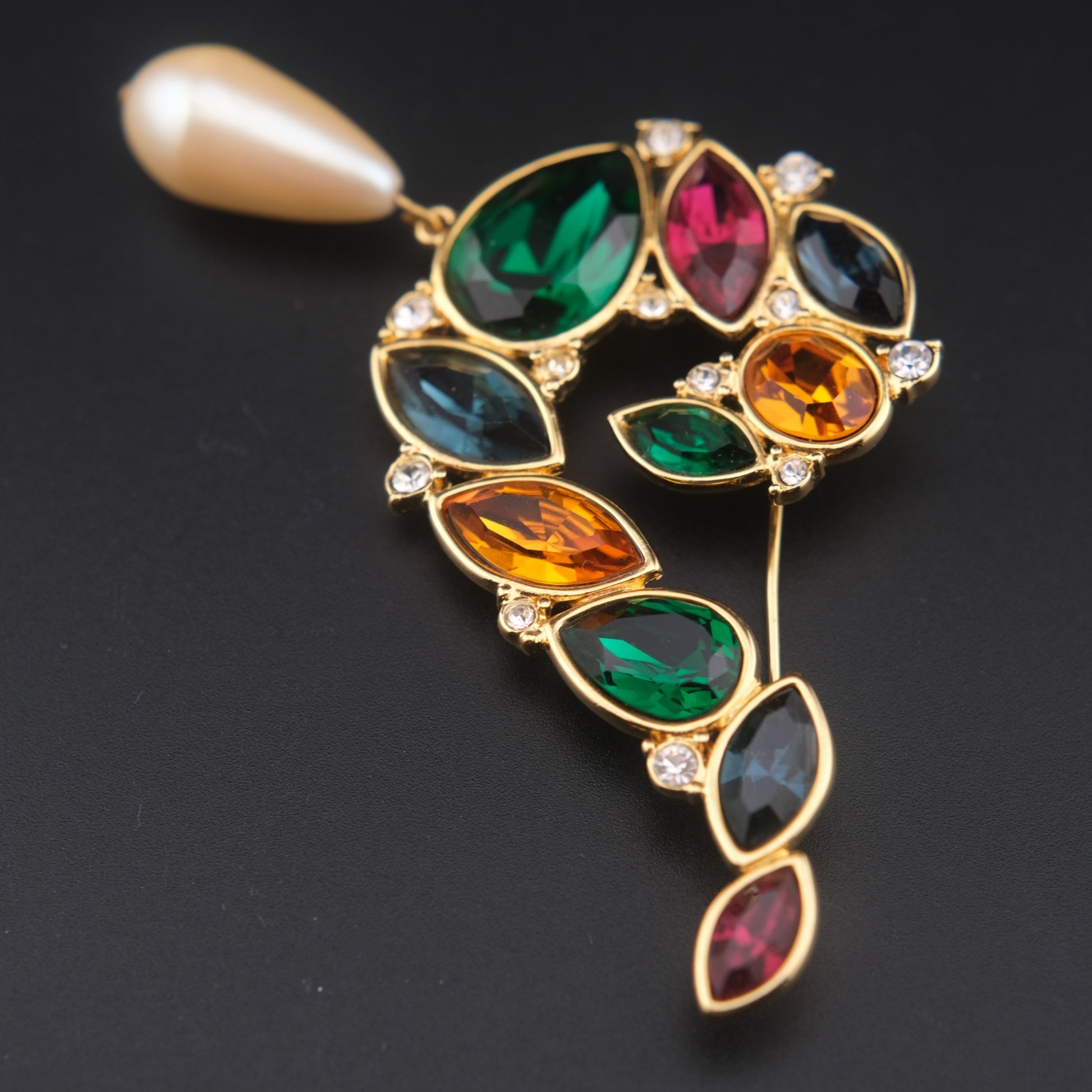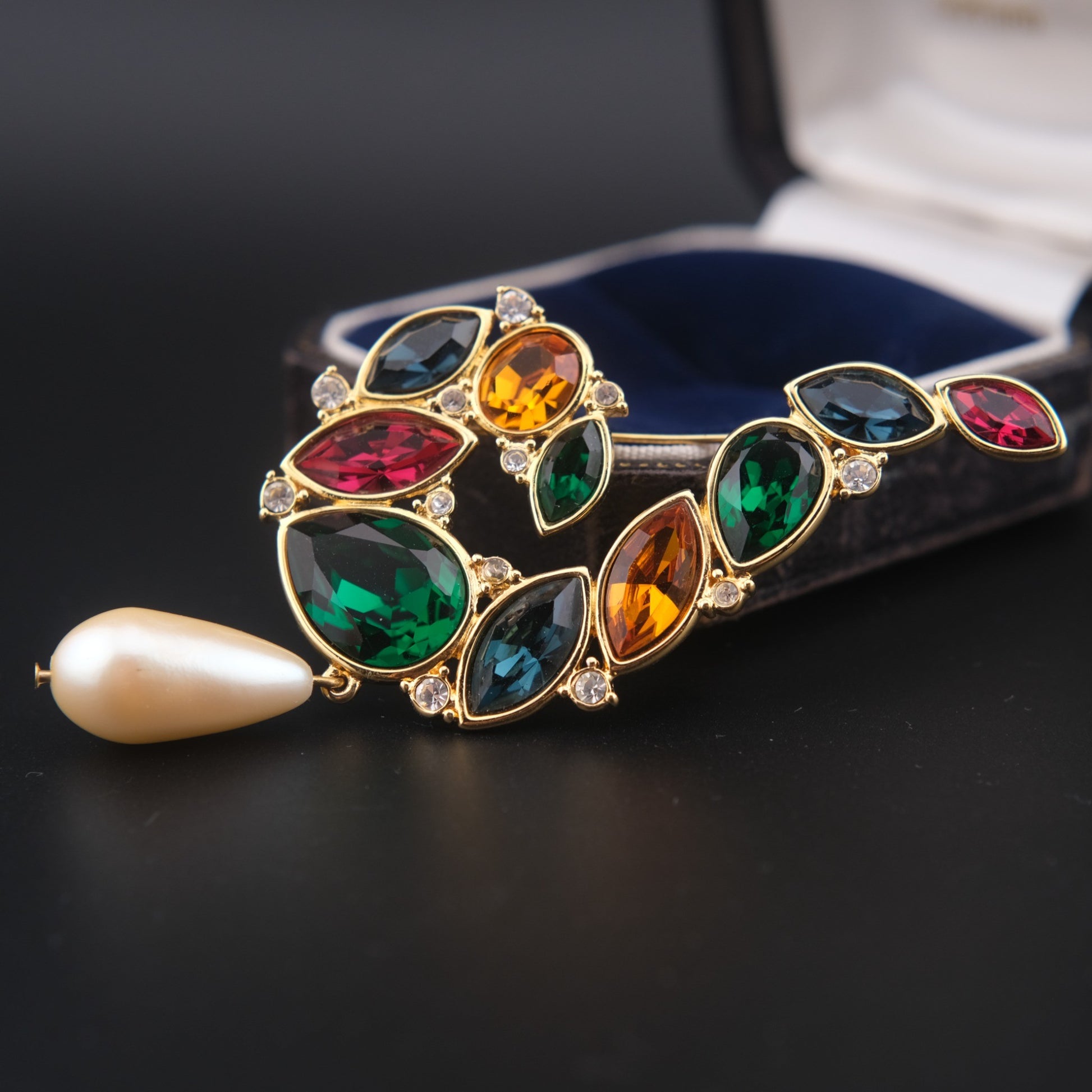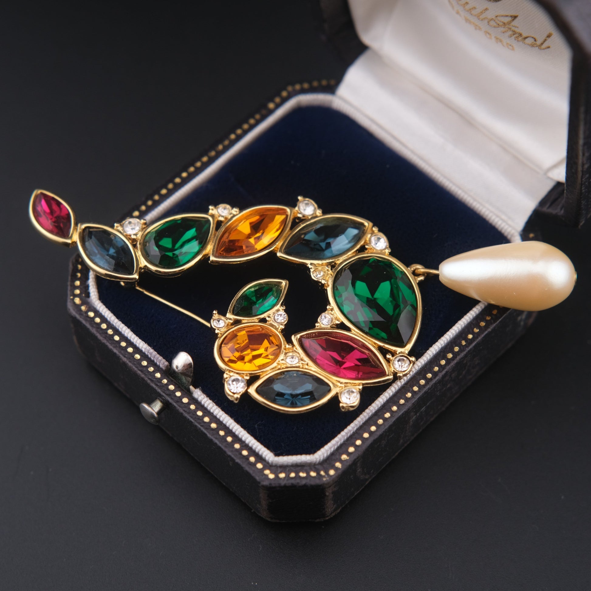 Elevate your vintage jewelry collection with this exquisite Monet brooch featuring an elegant swirl of marquise and pear-cut glass stones in rich jewel tones—emerald green, sapphire blue, ruby red, and citrine orange—accented by brilliant round clear rhinestones. Set in a gold-tone frame, the piece is crowned with a luminous teardrop faux pearl drop, adding a touch of classic glamour.