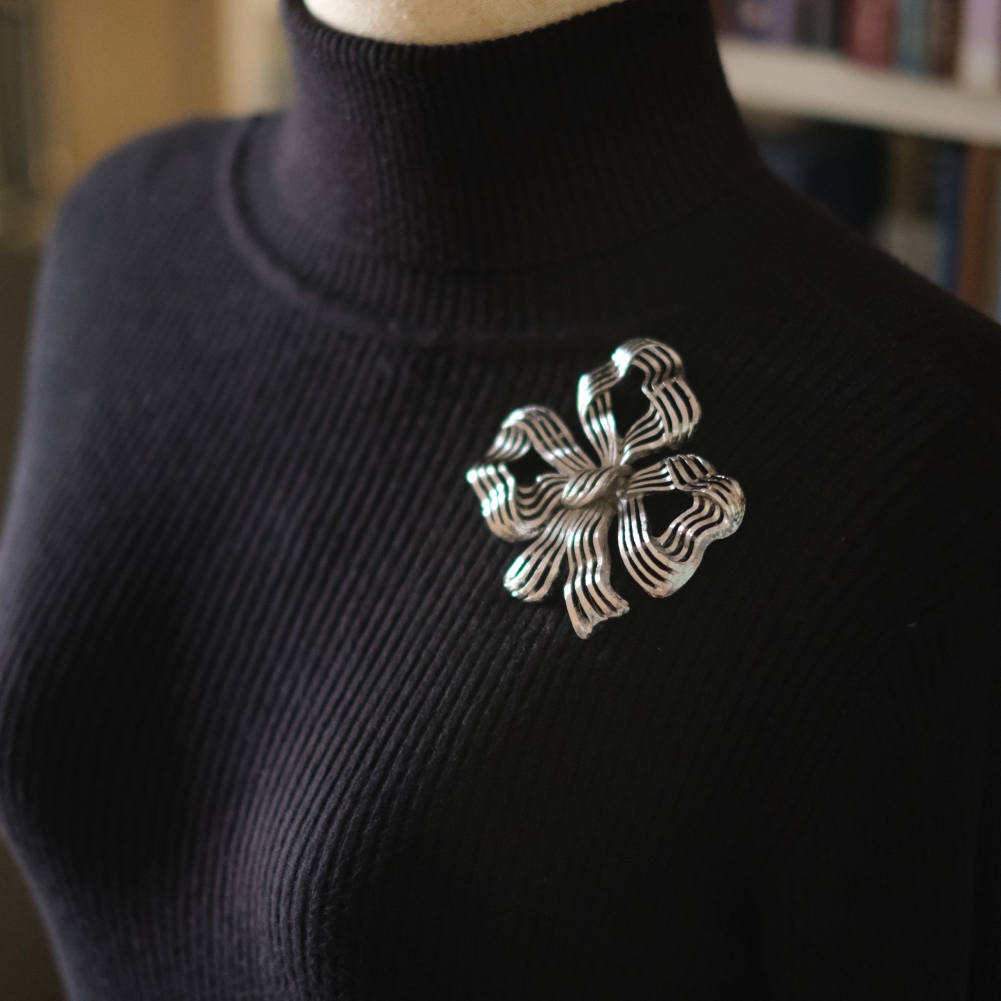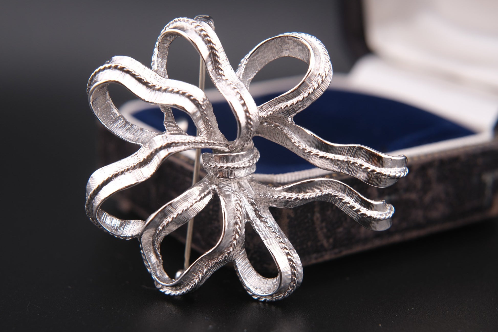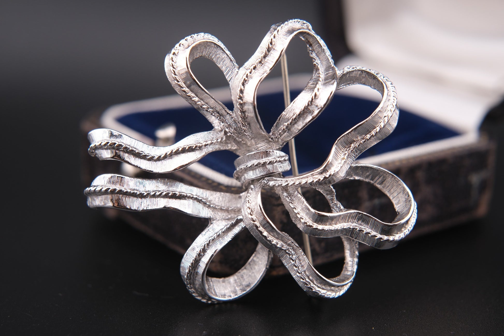 - Design: Sculptural ribbon bow with flowing loops and tails, finished with rope-edge details