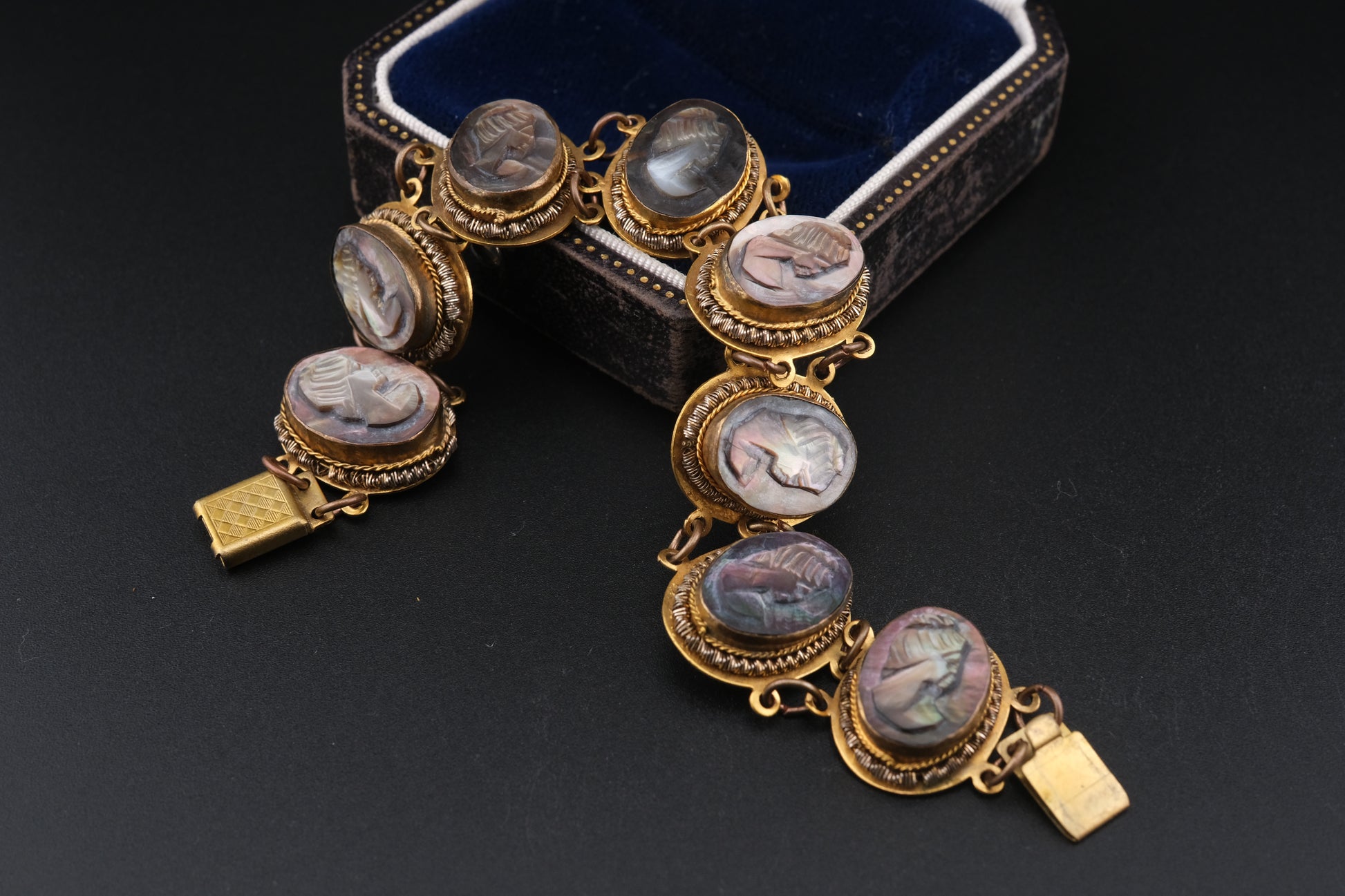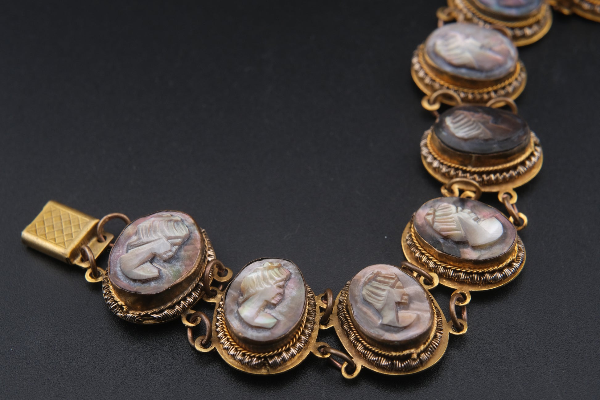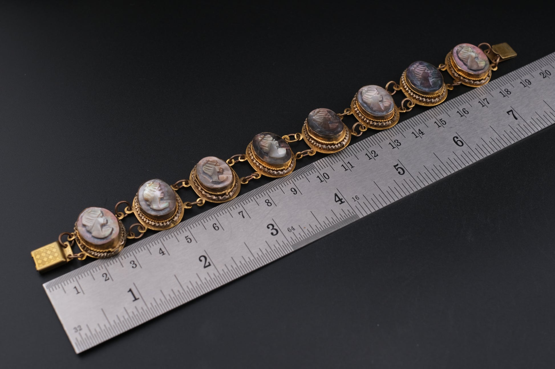 Step into a world of vintage charm with this exquisite 7-inch bracelet, showcasing eight oval-shaped cameos masterfully carved from iridescent mother of pearl. Each cameo features a classical profile in soft, multicolored hues—framed in ornate brass-toned settings with rope-style detailing.